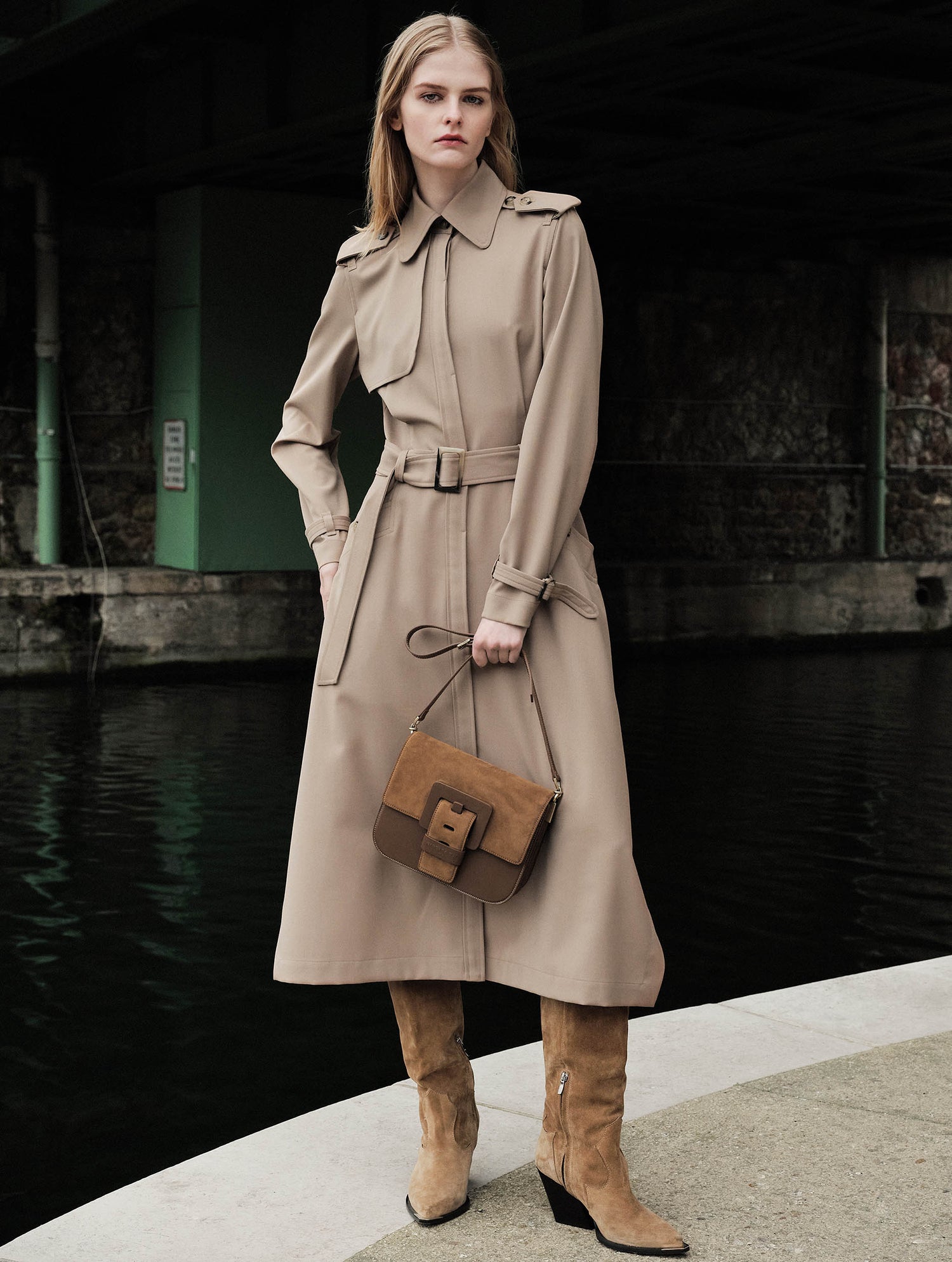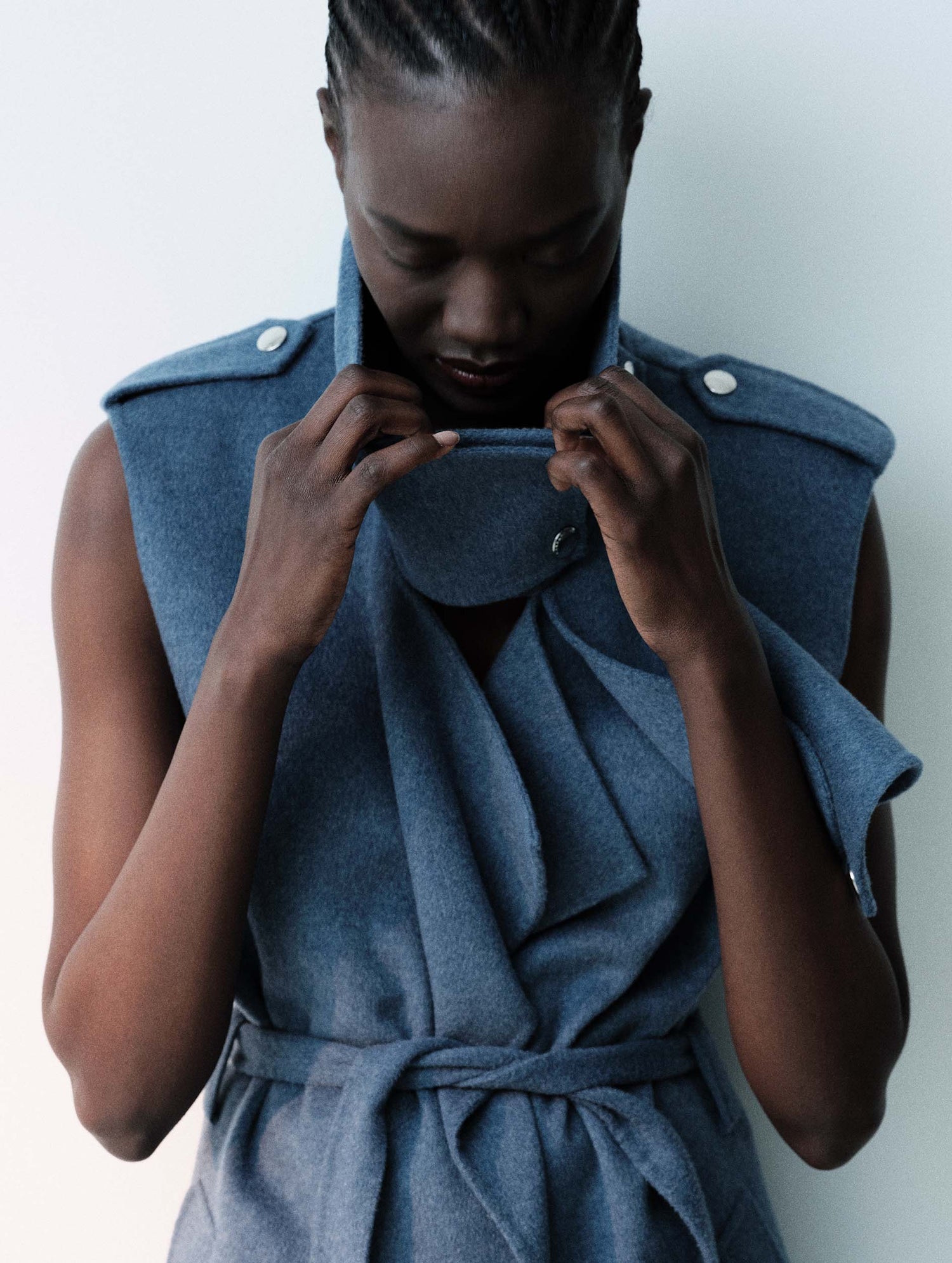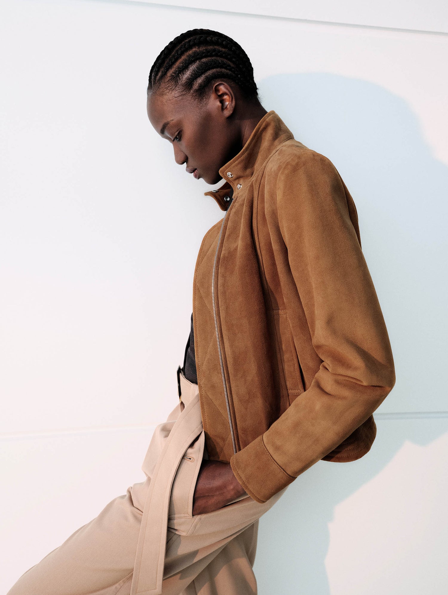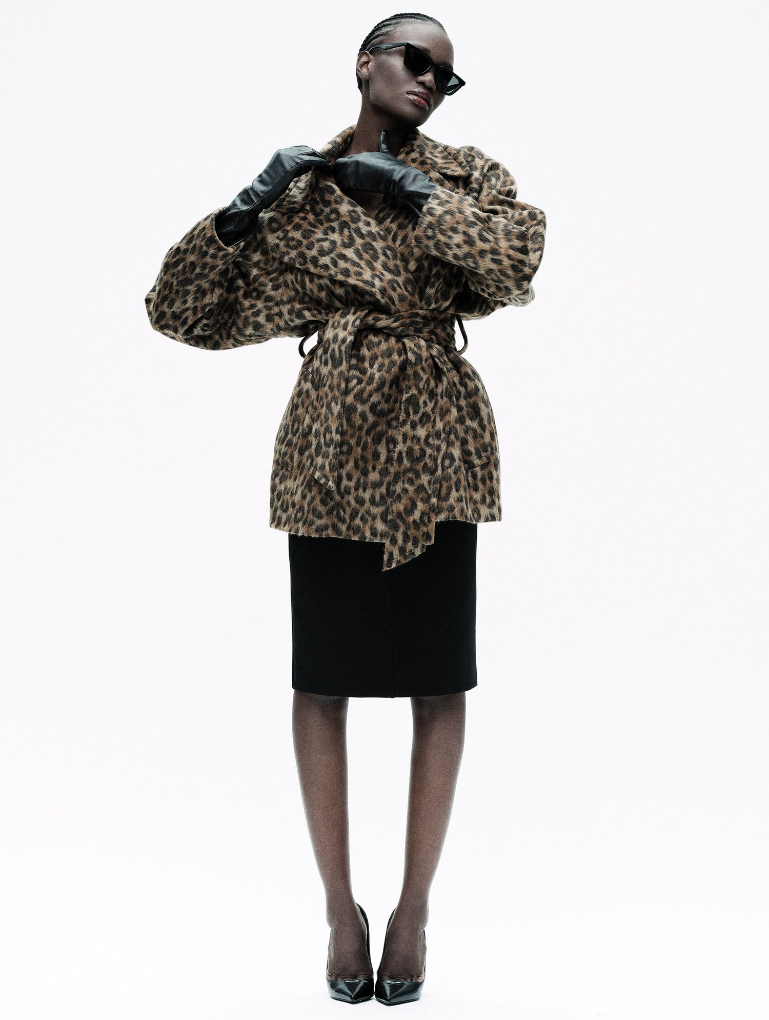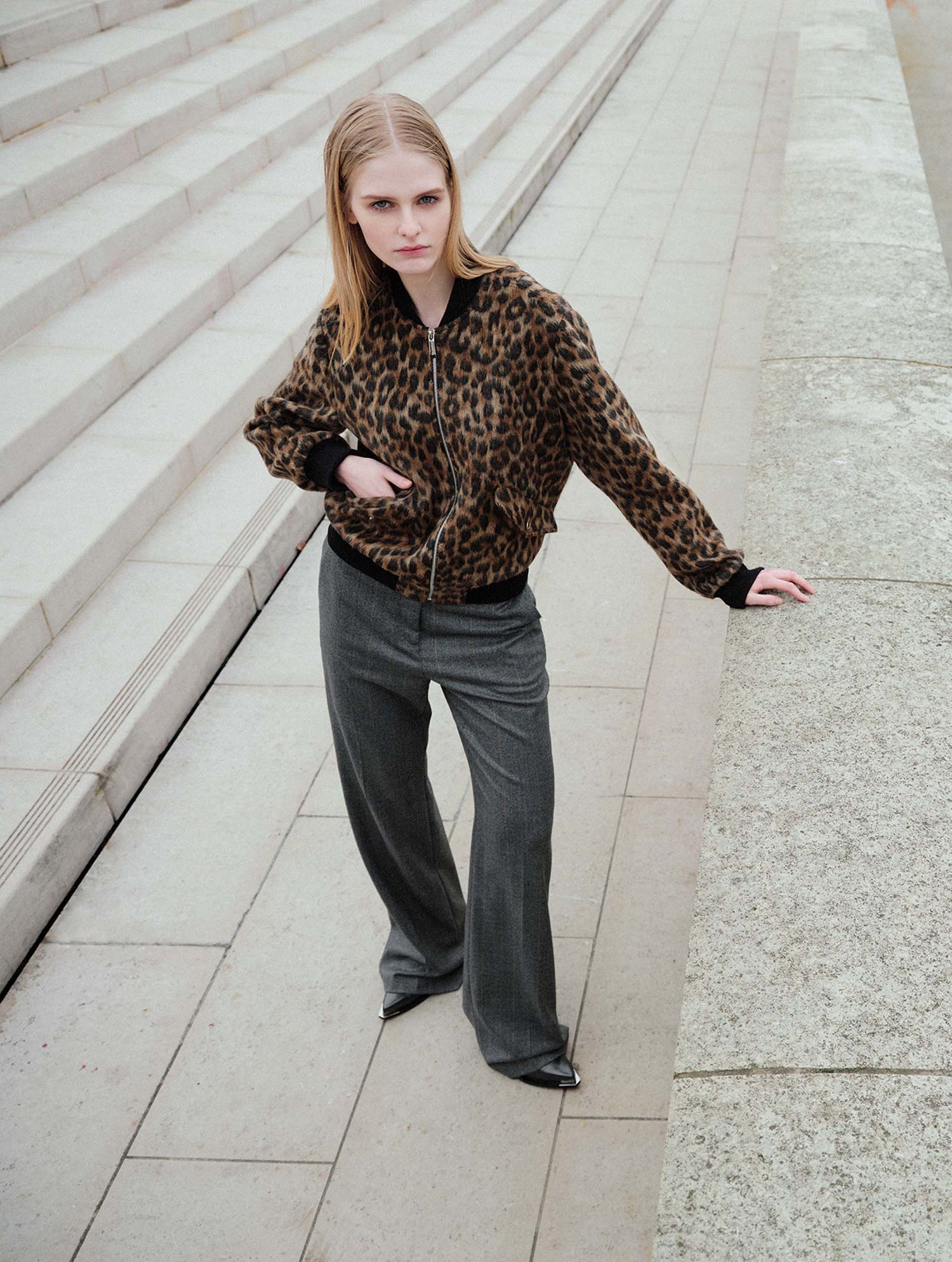 Le léopard, revisité en manteau ou en twin-set à l’esprit punk sixties, s’associe au bleu RAF, ou se décale avec la sobriété des tissus masculins gris anthracite. Le bombardier marron, avec son allure vintage et sa patine authentique, s’impose comme une pièce maîtresse du vestiaire de la saison et s’associe au total-look denim.