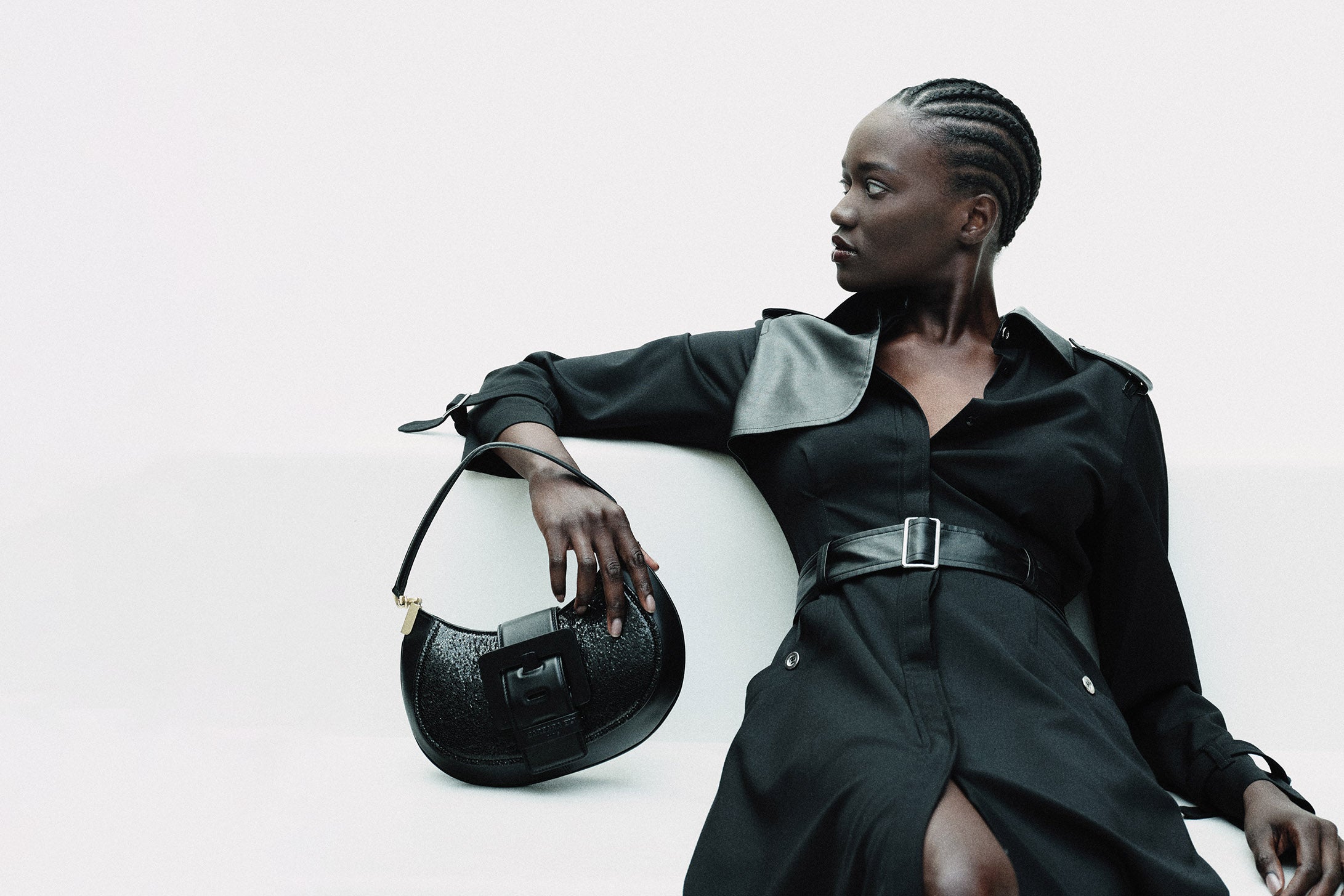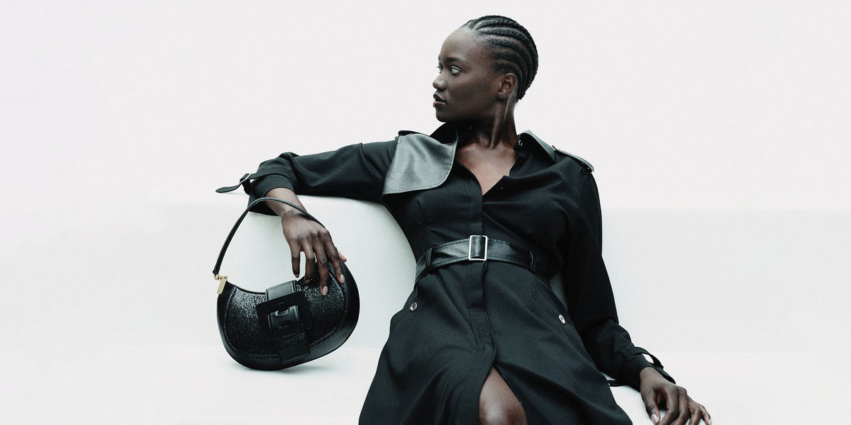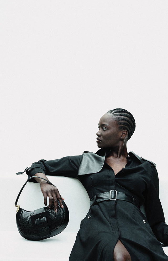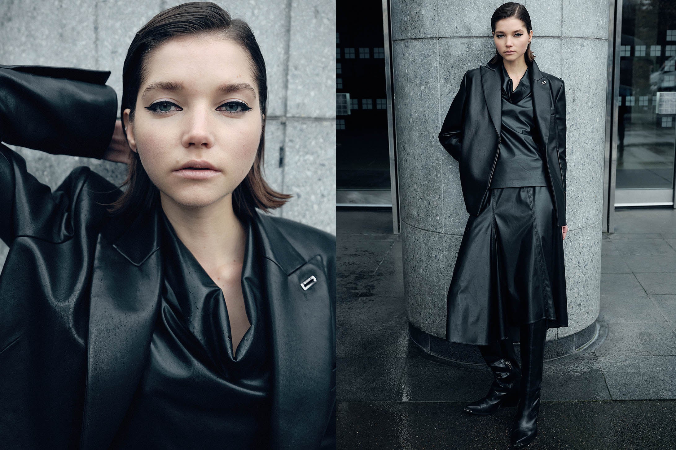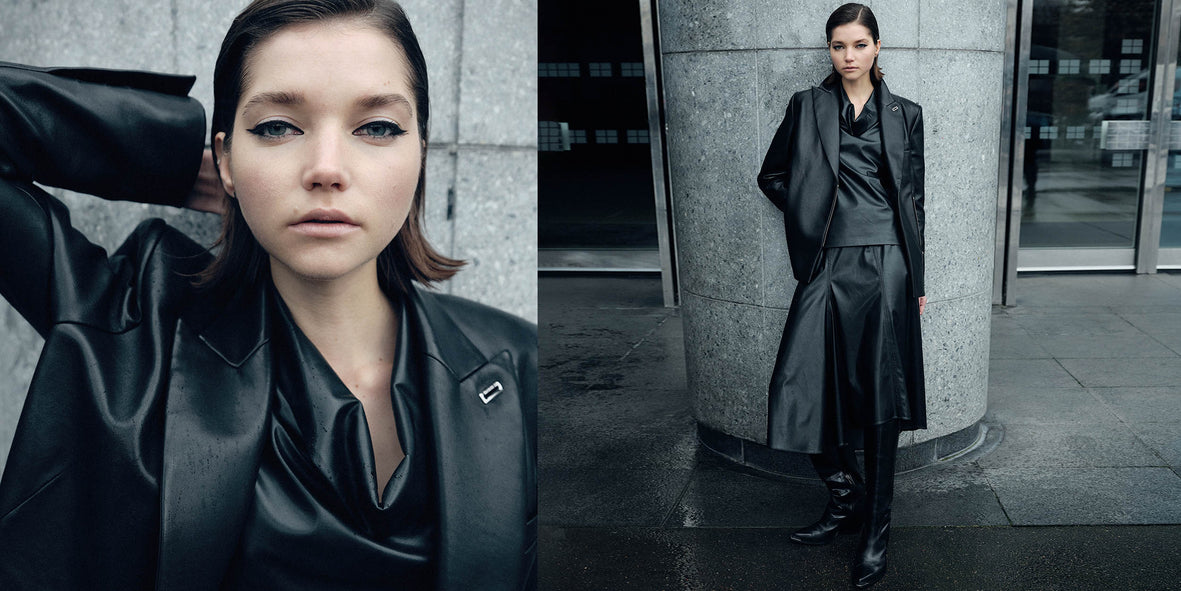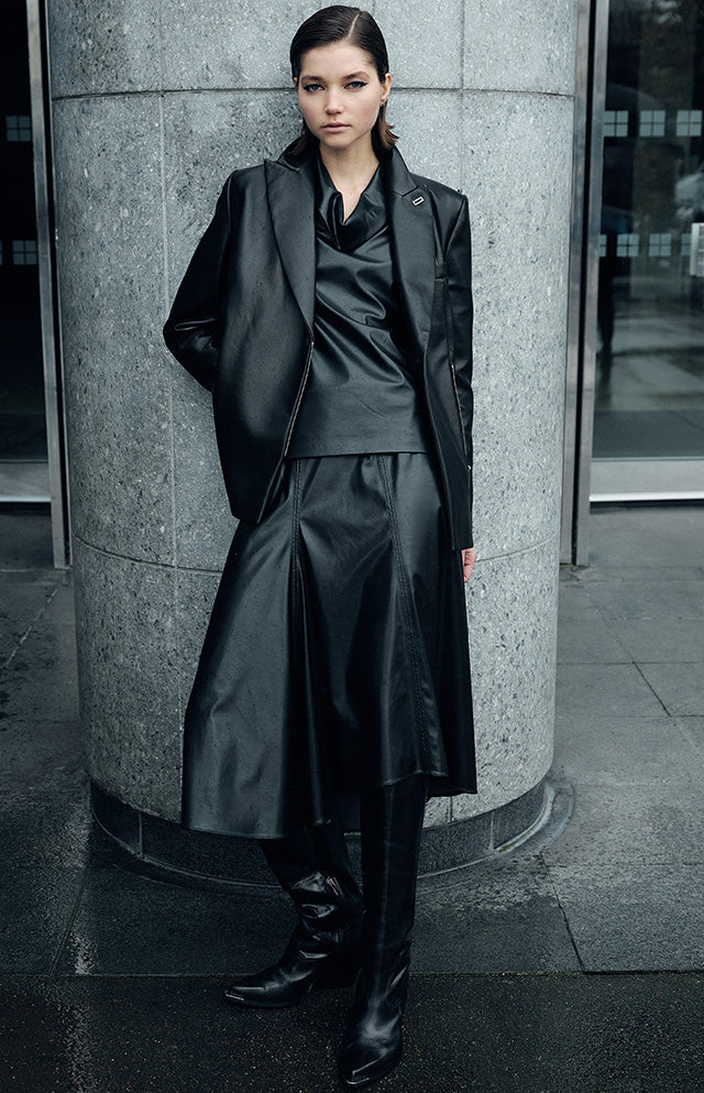 Vinyl with a cracked varnish effect prints its nocturnal glow on sharp silhouettes, like this nineties raincoat.