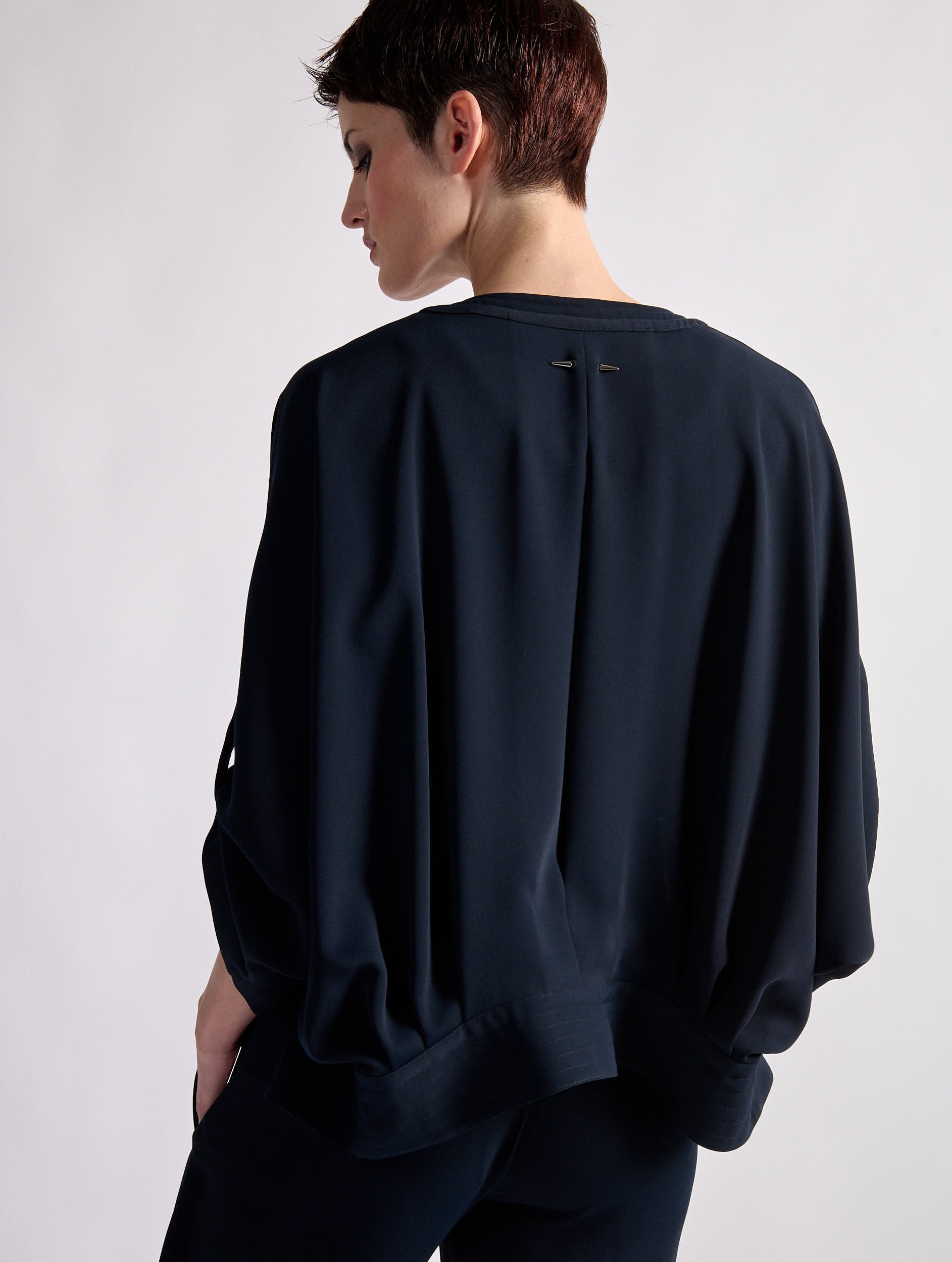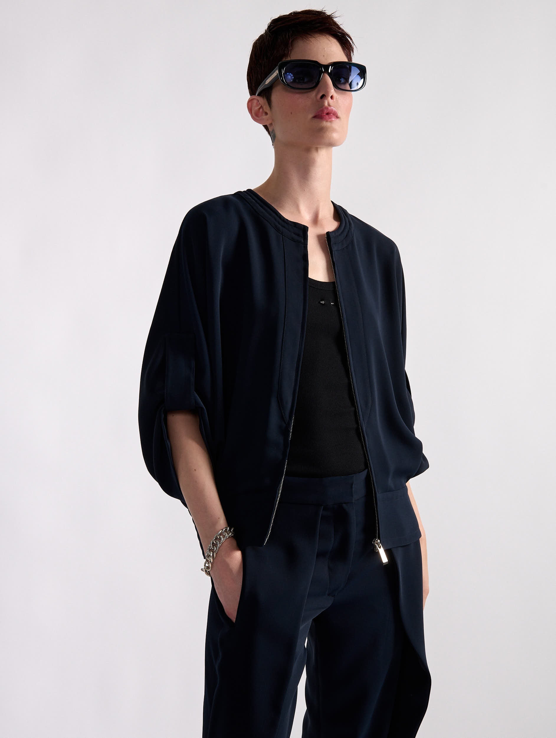 This zippered jacket in fluid, lightweight crepe is an ideal piece for the start of the season. Its 3/4-length sleeves are secured with a sewn-in placket, while its quilted round collar and ribbed waistband ensure an impeccably structured fall. Worn closed and paired with our pleated pants, this slim jacket creates a trompe l'oeil pantsuit look, ideal for a formal event or a dressy summer evening.