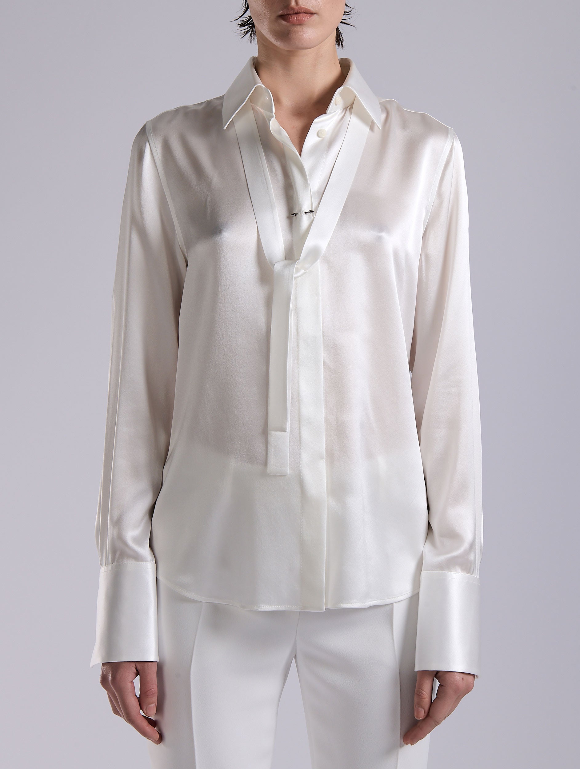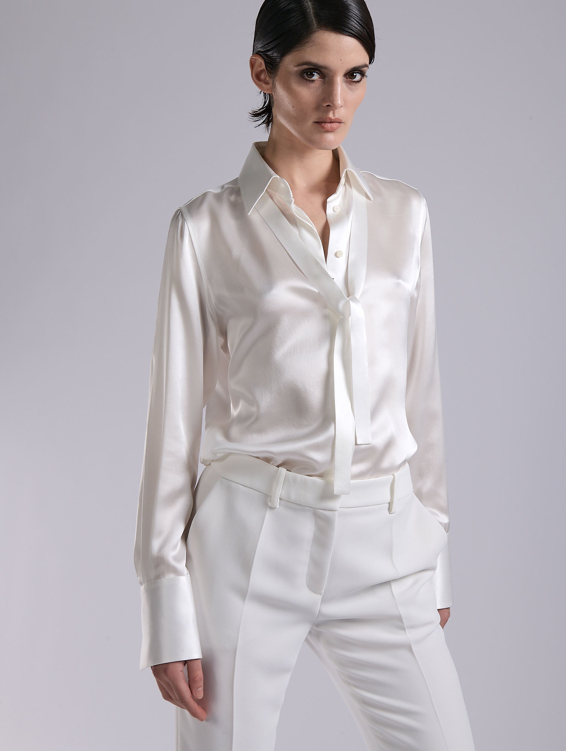 Expected in every collection in its new color palette, our silk satin shirt has become a signature piece in the Barbara Bui wardrobe. Made in a flattering straight cut, this pure silk shirt features elongated cuffs designed to be revealed by the sleeve of a suit jacket. On its hidden placket, it is accessorized with the house’s signature piercing jewelry, while the fine removable tie, secured with a button at the back of the collar, can be replaced with a silk tie available in all the shirt's color options. A versatile and comfortable piece with a decidedly contemporary chic.