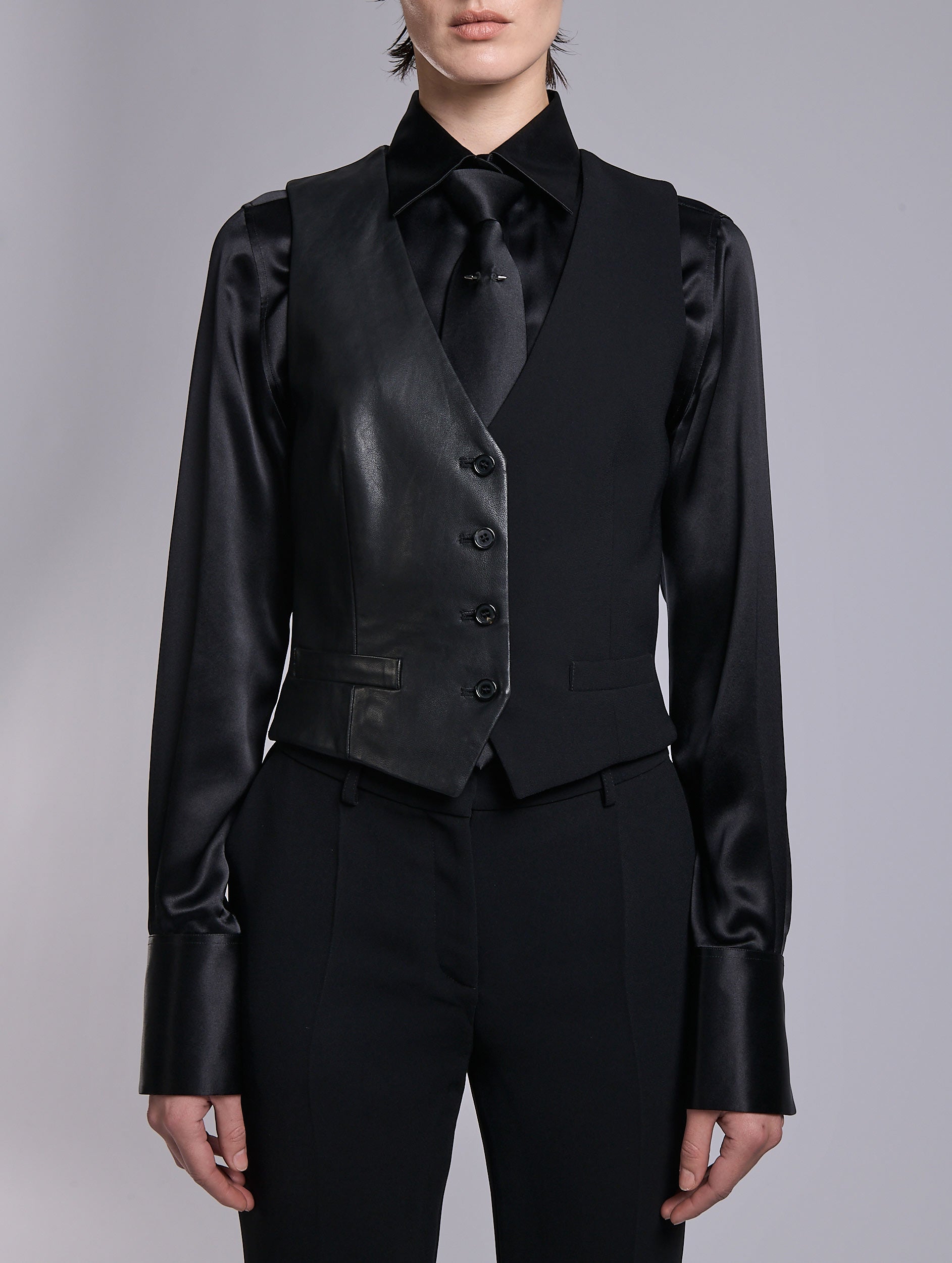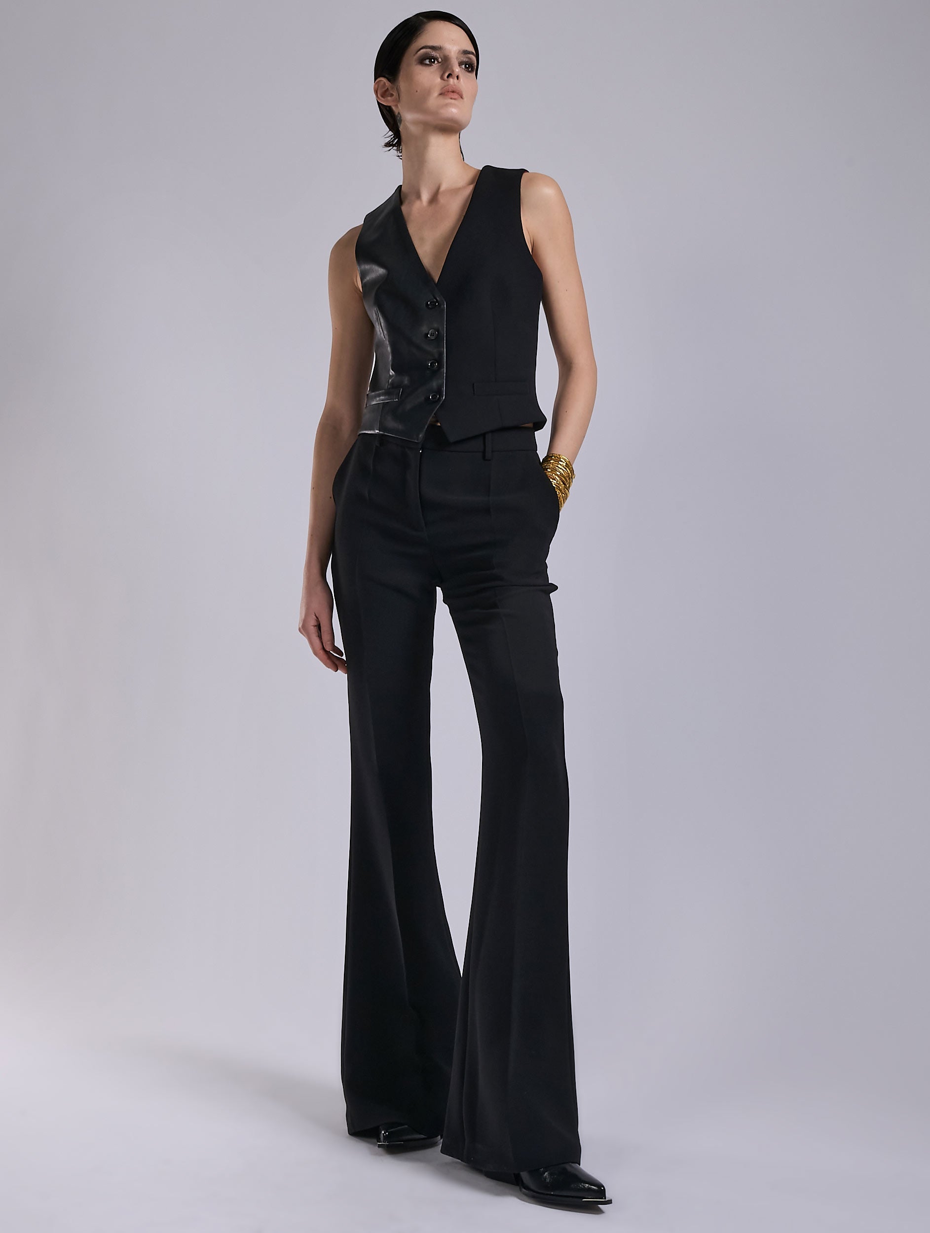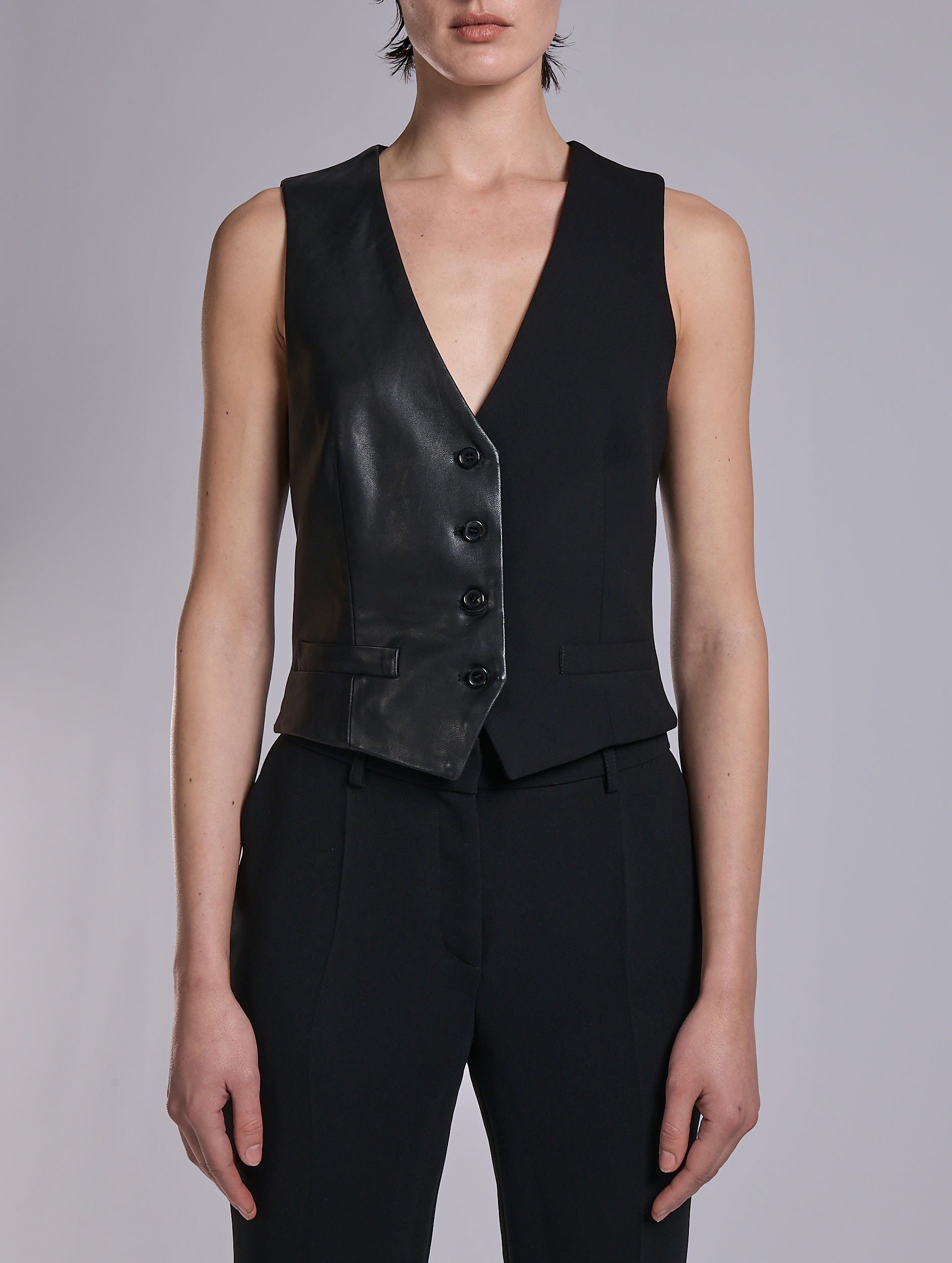 Borrowed from the men's wardrobe, this waistcoat reflects Barbara Bui’s playful take on both material and gender contrast, emphasizing the stylistic power of bold opposites. This version offers a daring take on the iconic waistcoat, combining black leather and matte cady fabric. Sleeveless and statement-making, it brings graphic structure and rock style — whether worn as part of a three-piece suit or as a standalone top. An easy-to-wear timeless piece, it reaffirms a radically elegant aesthetic.