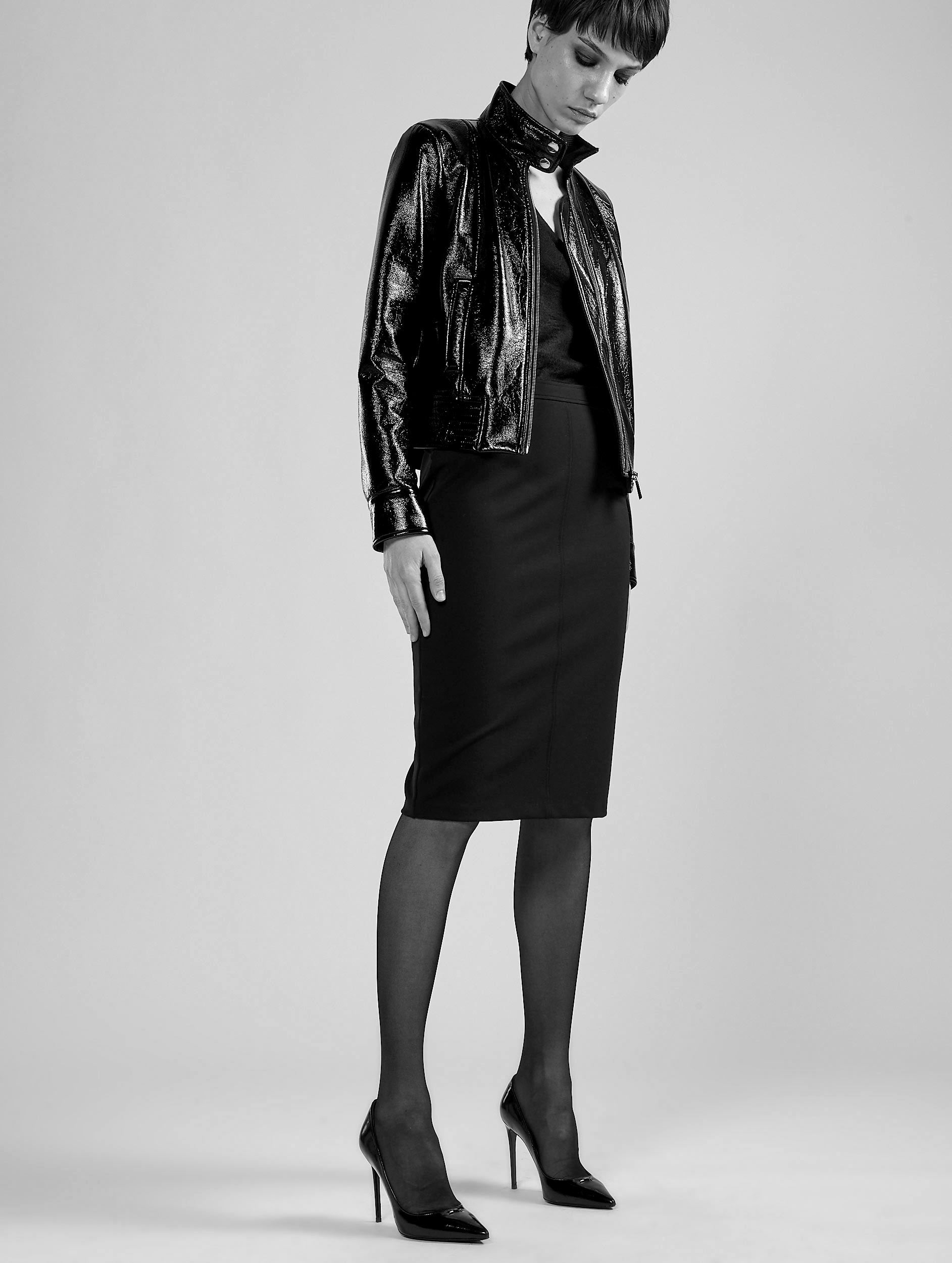 A staple for business looks, the pencil skirt acquires a new elegance by making shaping milano jersey its best asset. The sleek style of this black knee-length skirt flatters the body, promising a fitted fit and long, elegant legs. Its stitched pleat at the front and carefully placed seams are a testament to Barbara Bui’s sartorial expertise, entirely devoted to femininity.