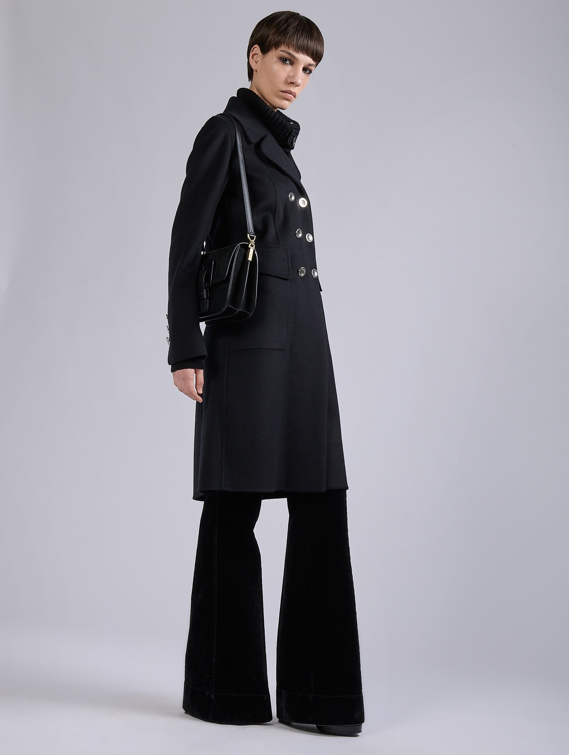 The impeccable cut of this double-breasted coat enhances its sixties allure with sophisticated details of Parisian elegance. Made from a luxurious blend of wool and cashmere, this knee-length double-breasted coat is perfectly crafted, with equal attention to detail on the front and back. The black version is adorned with silver buttons, while Barbara Bui chose horn-style buttons for the sand model. Its large patch pockets feature side pocket openings for hands to slip into casually. At the back, a martingale supports the slim silhouette of this timeless coat, while a slit and our piercing jewel underline its modernity.