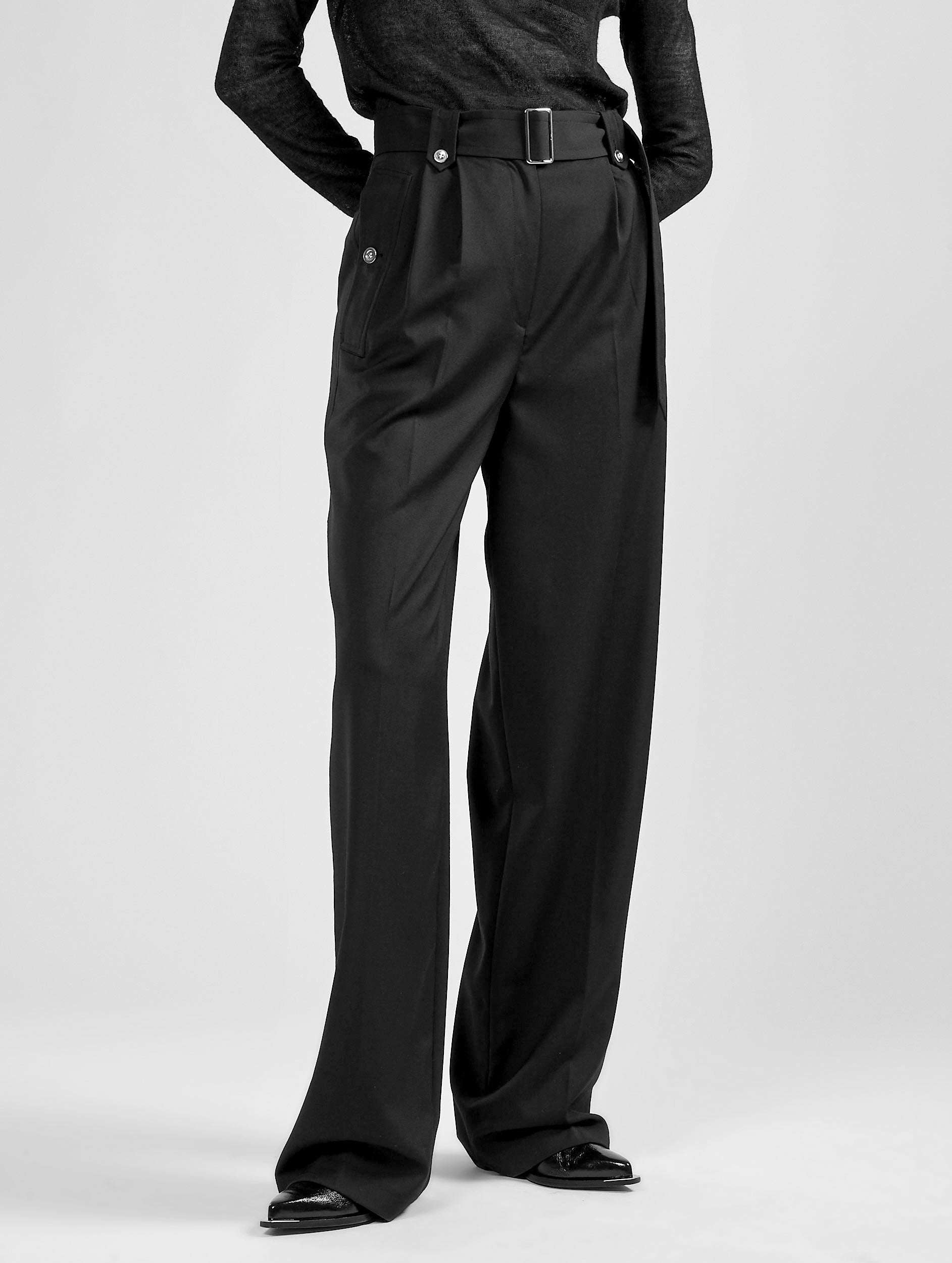 The epicenter of the silhouette, these pleated pants breathe a chic, nonchalant attitude into your favorite looks. Featuring a high-waisted cut with a wide leg to combine femininity with androgynous accents, these women's pants come in comfortable stretch wool gabardine in three colors: black, denim blue or camel. The integrated waistband is perfectly held in place with a square buckle and buttoned loops, details of utilitarian chic reminiscent of the elements traditionally associated with trench coats. Rear welt pockets and front pockets are also fitted with buttons in a minimalist black version, or in a horn effect for the camel model.