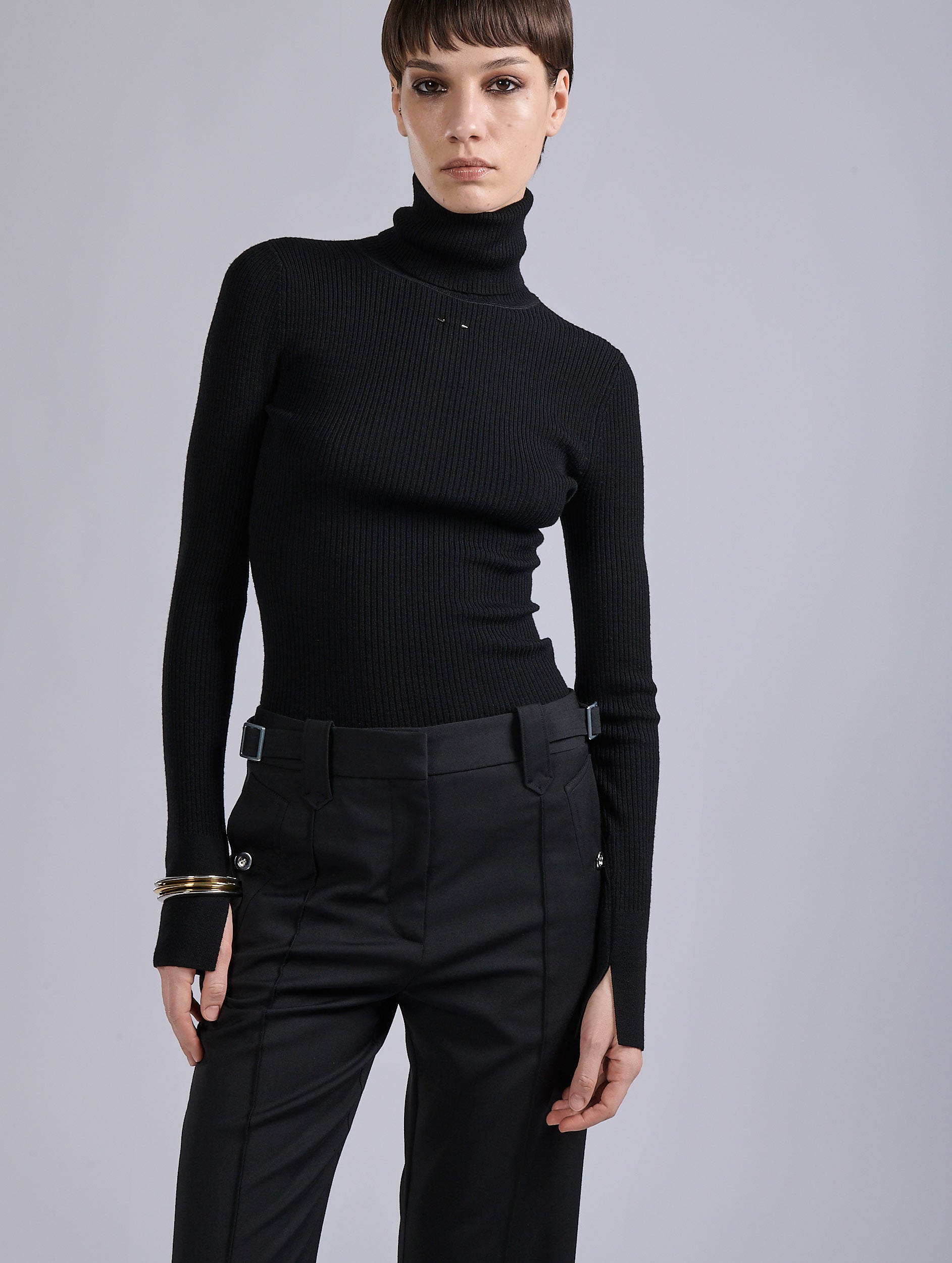 In denim blue or deep black, this ribbed merino knit sweater guarantees warmth and lightness. Its close-fitting cut and turtleneck elegantly enhance the silhouette. A chic, feminine detail, its slit sleeves open at the wrist, delicately revealing a bracelet or watch. Barbara Bui's rock signature, the removable silver metal piercing characteristic of our collections, accessorizes this sober, timeless sweater, pairing it with jeans or dress pants with equal ease.