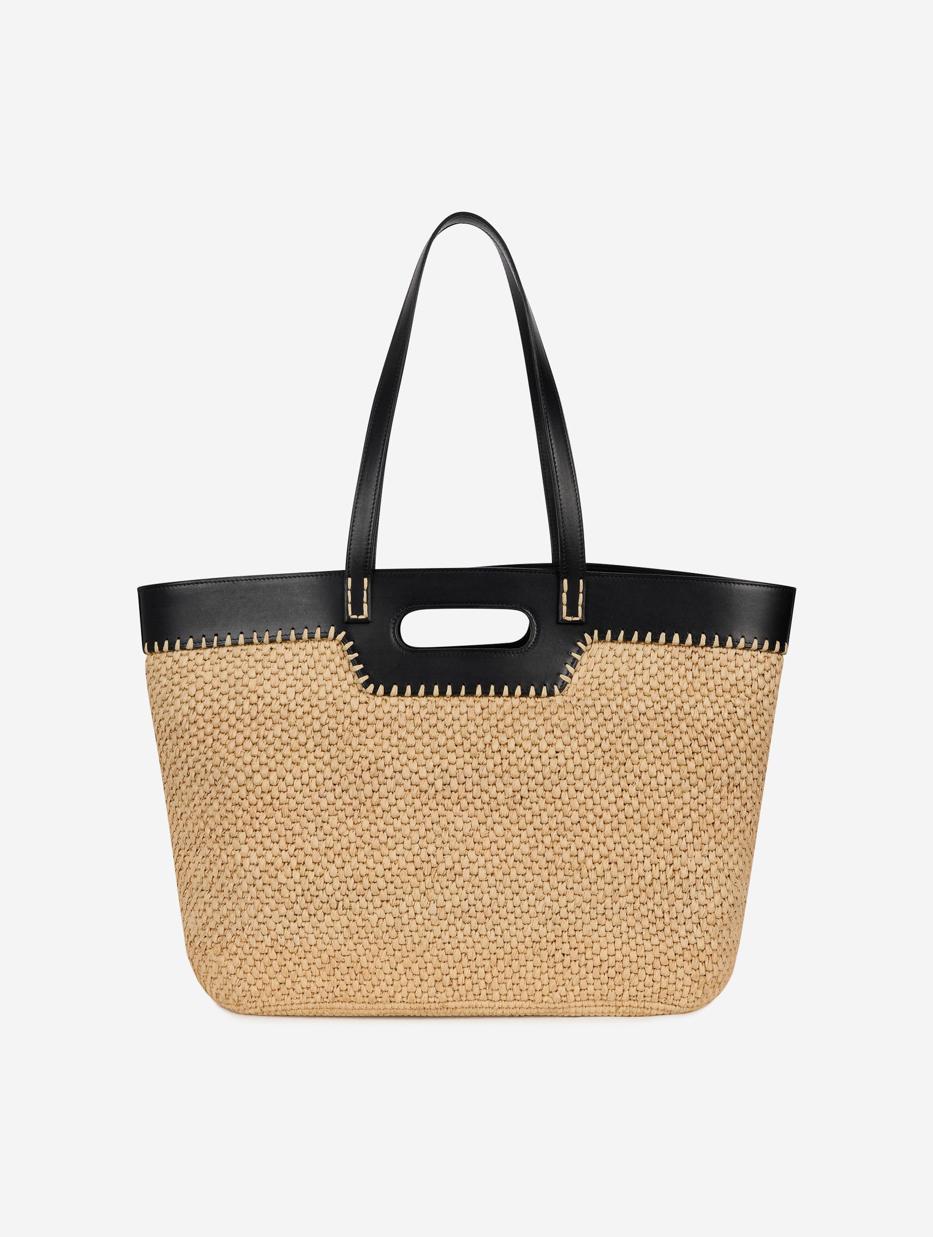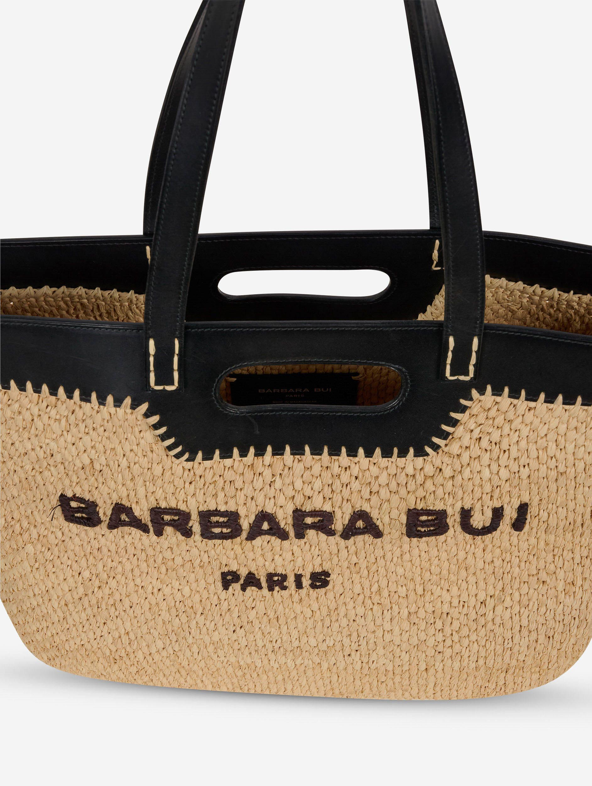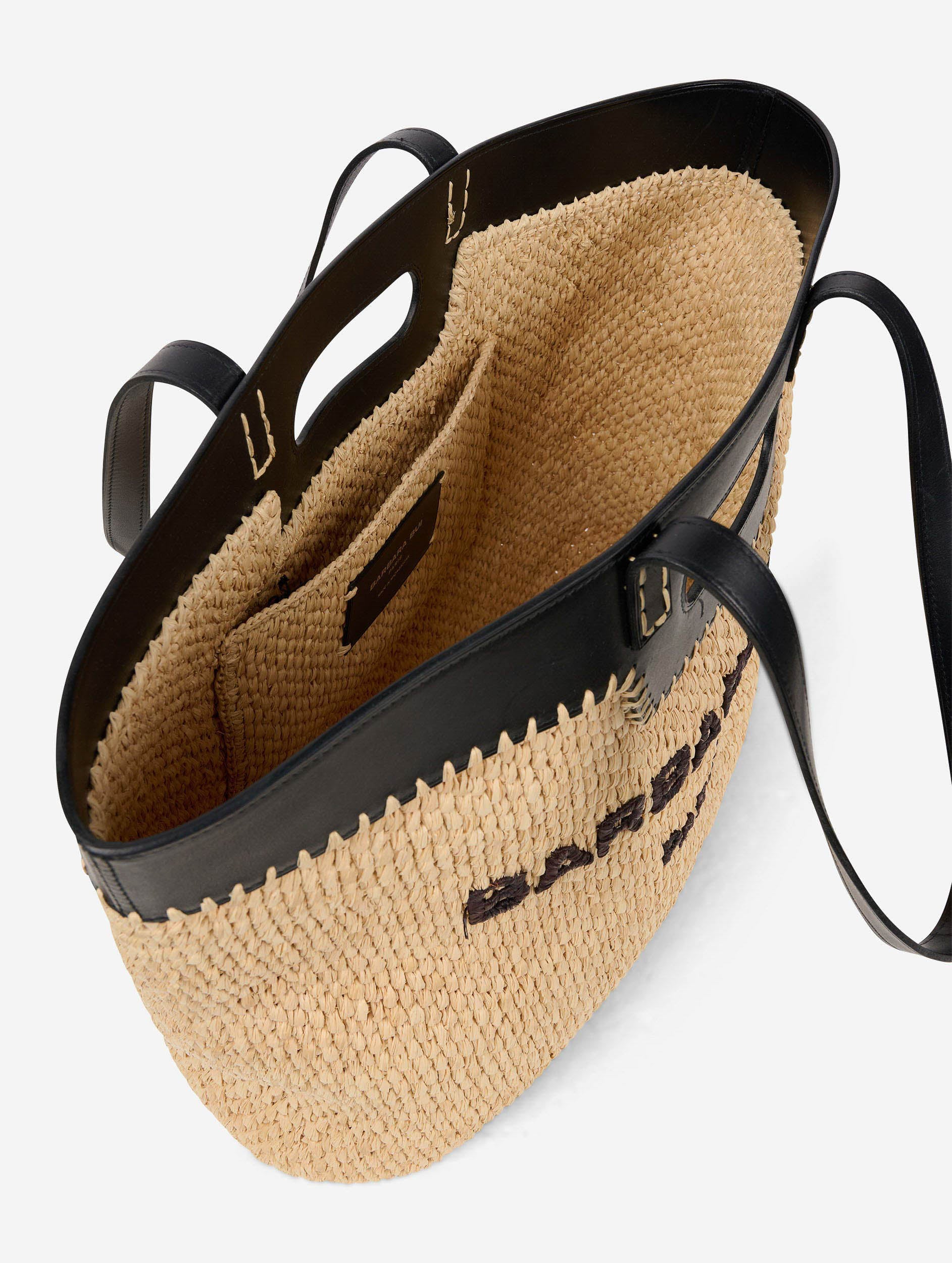 Shopping bag in natural raffia and black leather