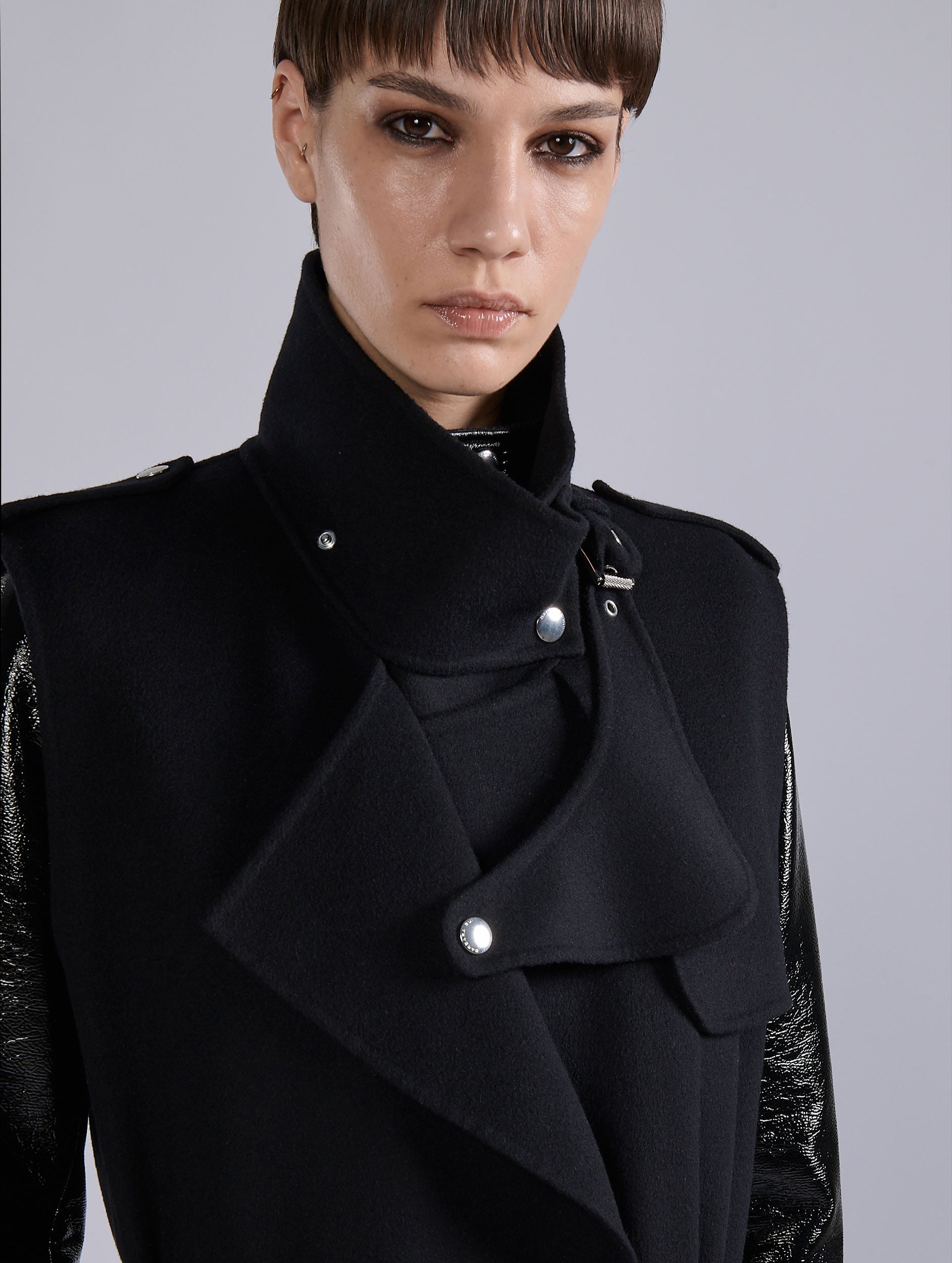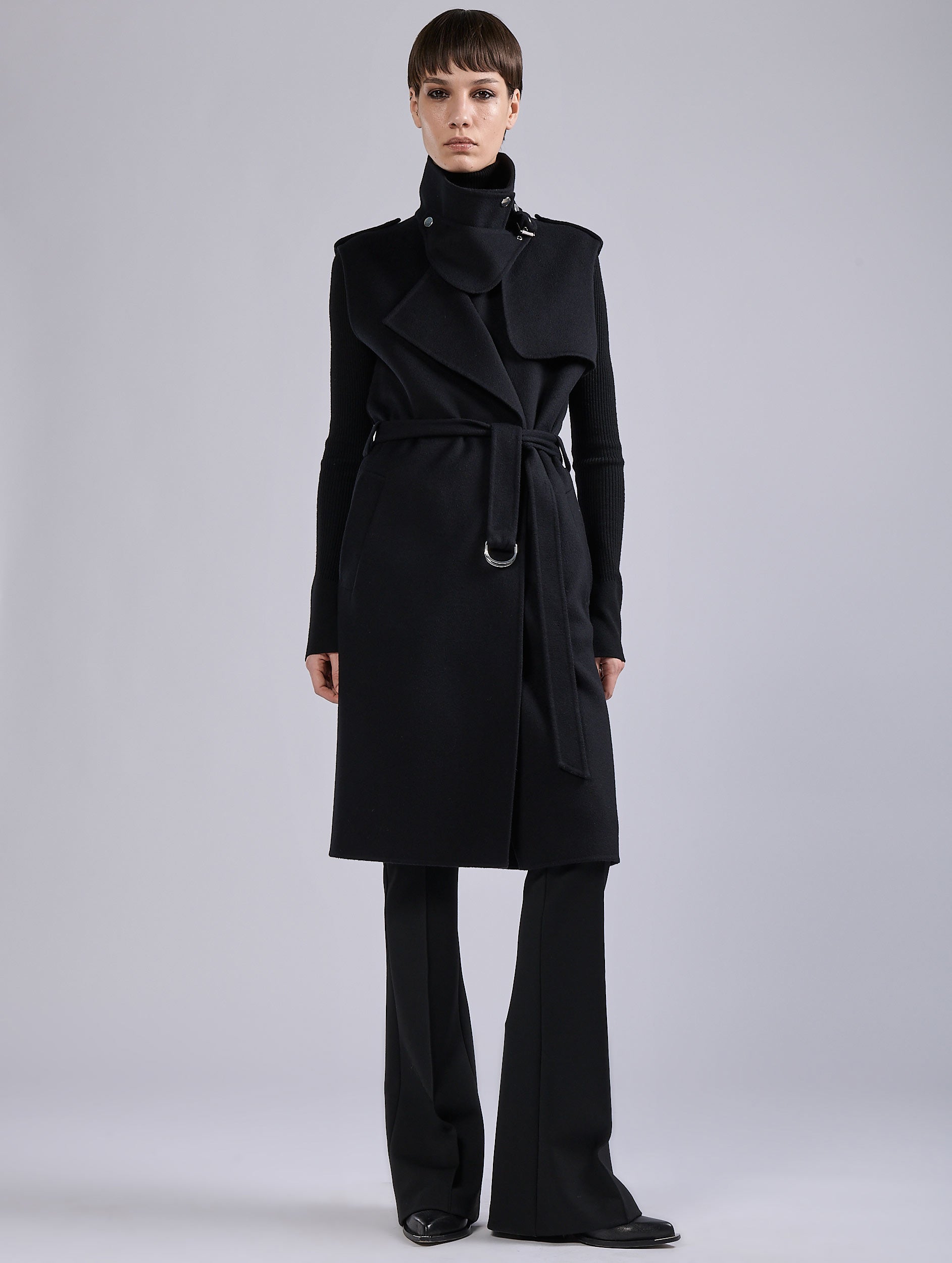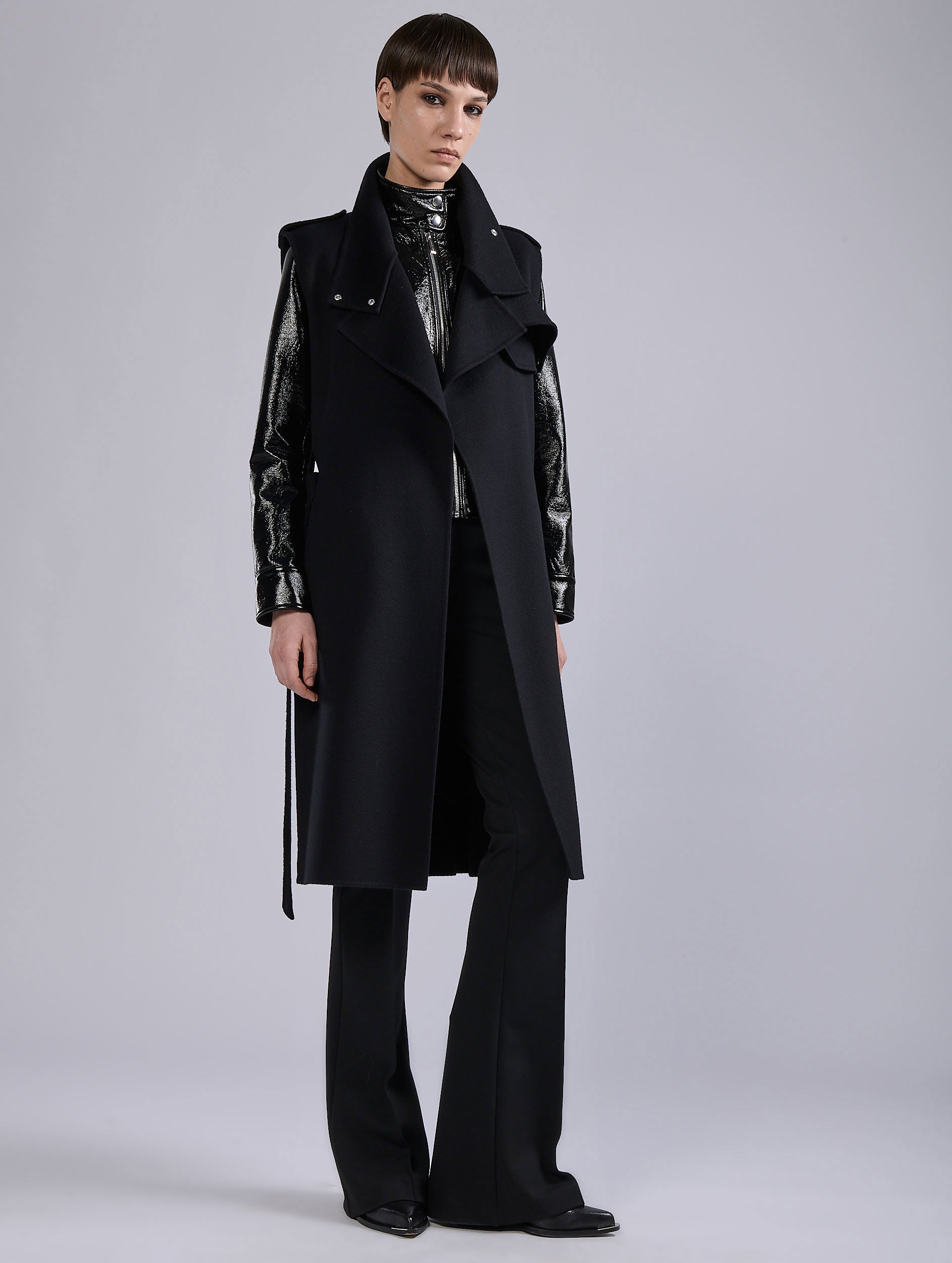 Made from luxurious double-sided wool and cashmere with impeccable finishing on both sides, this sleeveless trench-coat is a promise of softness. Borrowing some of the typical codes of the trench coat and biker jacket, this coat features neat cut-outs like its bib and double collar. The collar can be worn open or more structured, thanks to its buckle and snap fasteners. Featuring comfortable Italian pockets and a removable belt held by 3 loops, this coat is offered in timeless black and delicate blue-gray. Sophisticated colors to match with Naplack leather or denim for a play of materials and cameos.