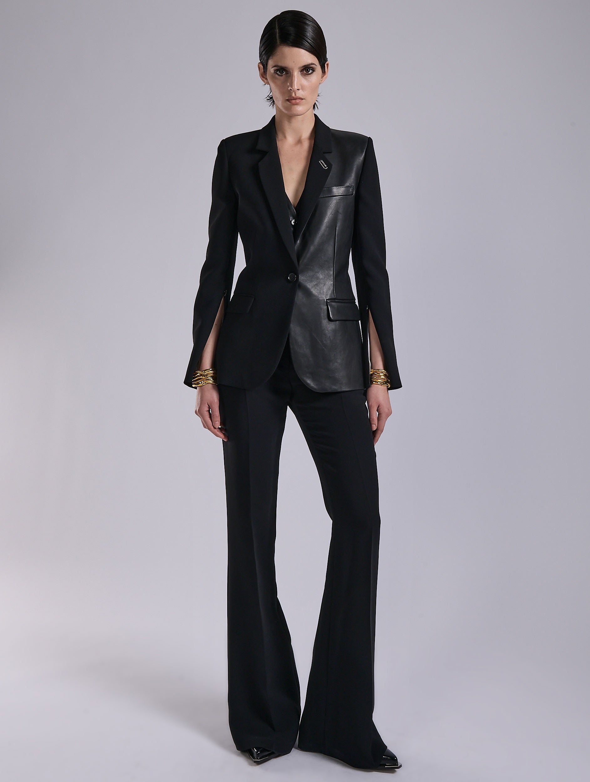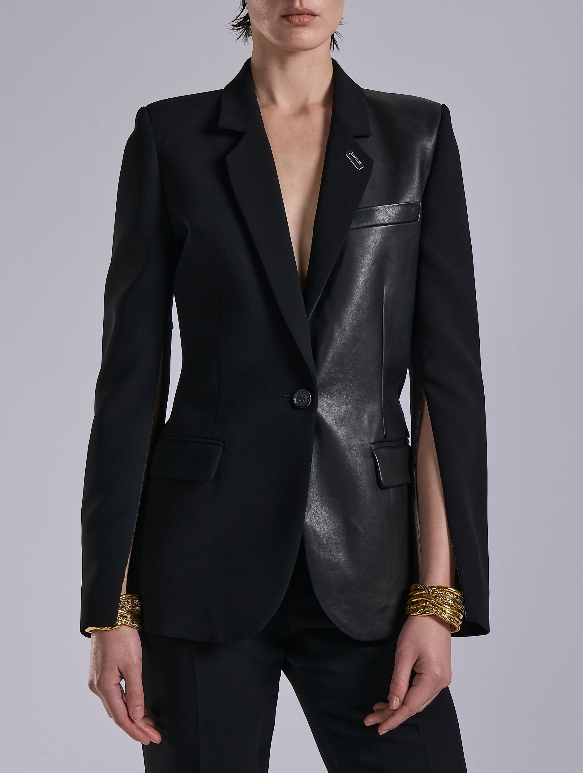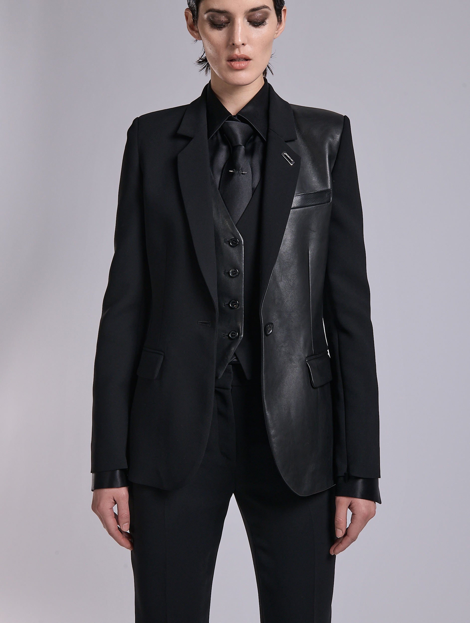 This tailored blazer plays with contrast in a bold duo of black crepe and smooth leather — a testament to our atelier’s tailoring expertise. Its “sharp and cut” fitted shape enhances the silhouette, while the mix of materials adds visual depth and a bold statement. Worn directly on the skin or over the matching waistcoat, this fitted blazer embodies sharp and daring femininity. Its zipped cuffs, punctuated with discreet buttonholes, allow total freedom of wear. Our signature piercing detail and a Milanese loop in silver metal complete this singular piece, emblematic of the house’s liberated and rock-inspired wardrobe.