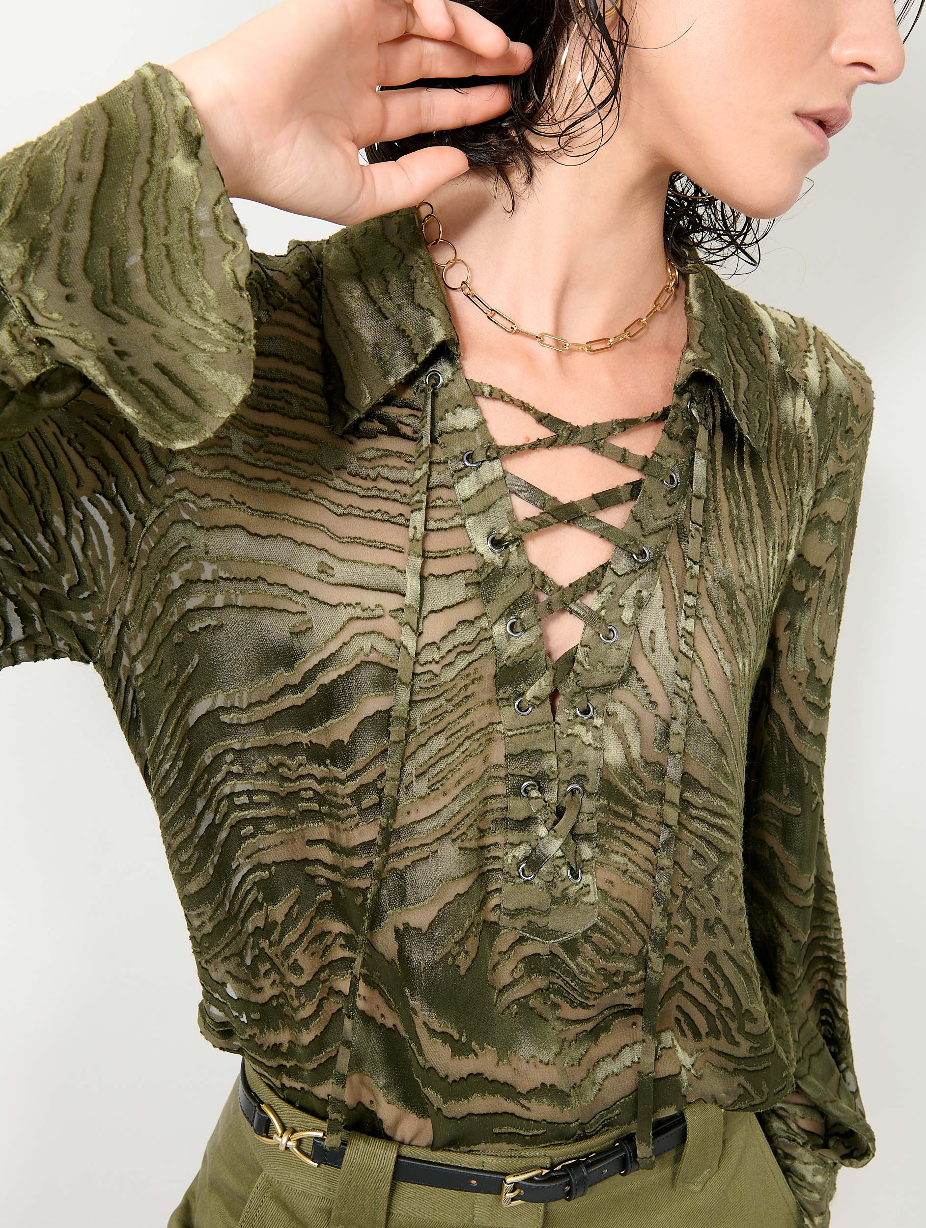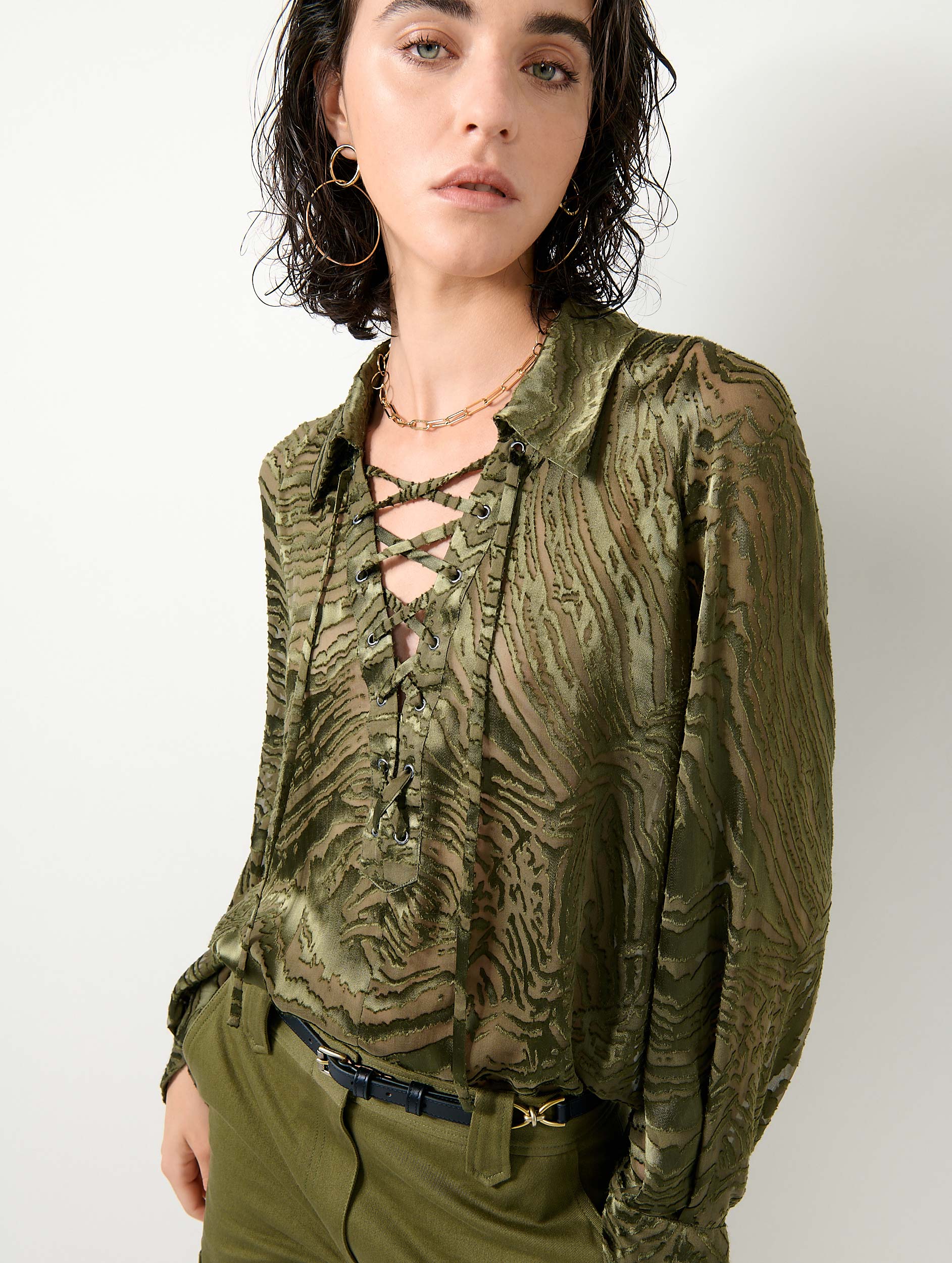 This blouse is crafted in a devoré satin proposed in khaki or navy. It also distinguishes itself by its laced neckline, its raglan sleeves adding to its volume with fluidity, and by its transparency mastered thanks to the placements of the motifs. Versatile and flattering, this women's top is worn in a chic casual way with modernized cargo trousers or more dressed up associated with tailored trousers with "sharp and cut" lines.