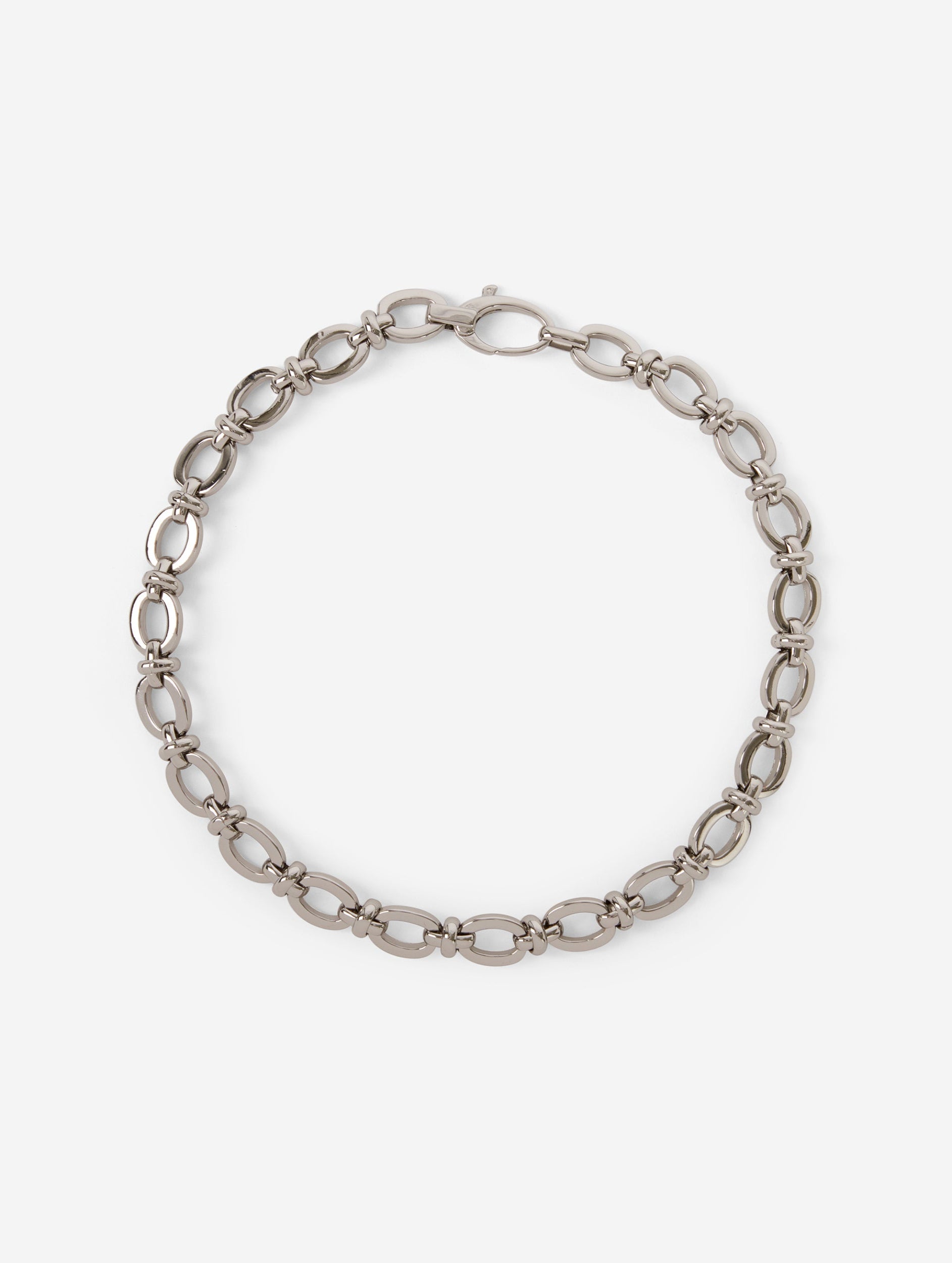 Metal chain bracelet with nickel-free finish and snap hook closure.