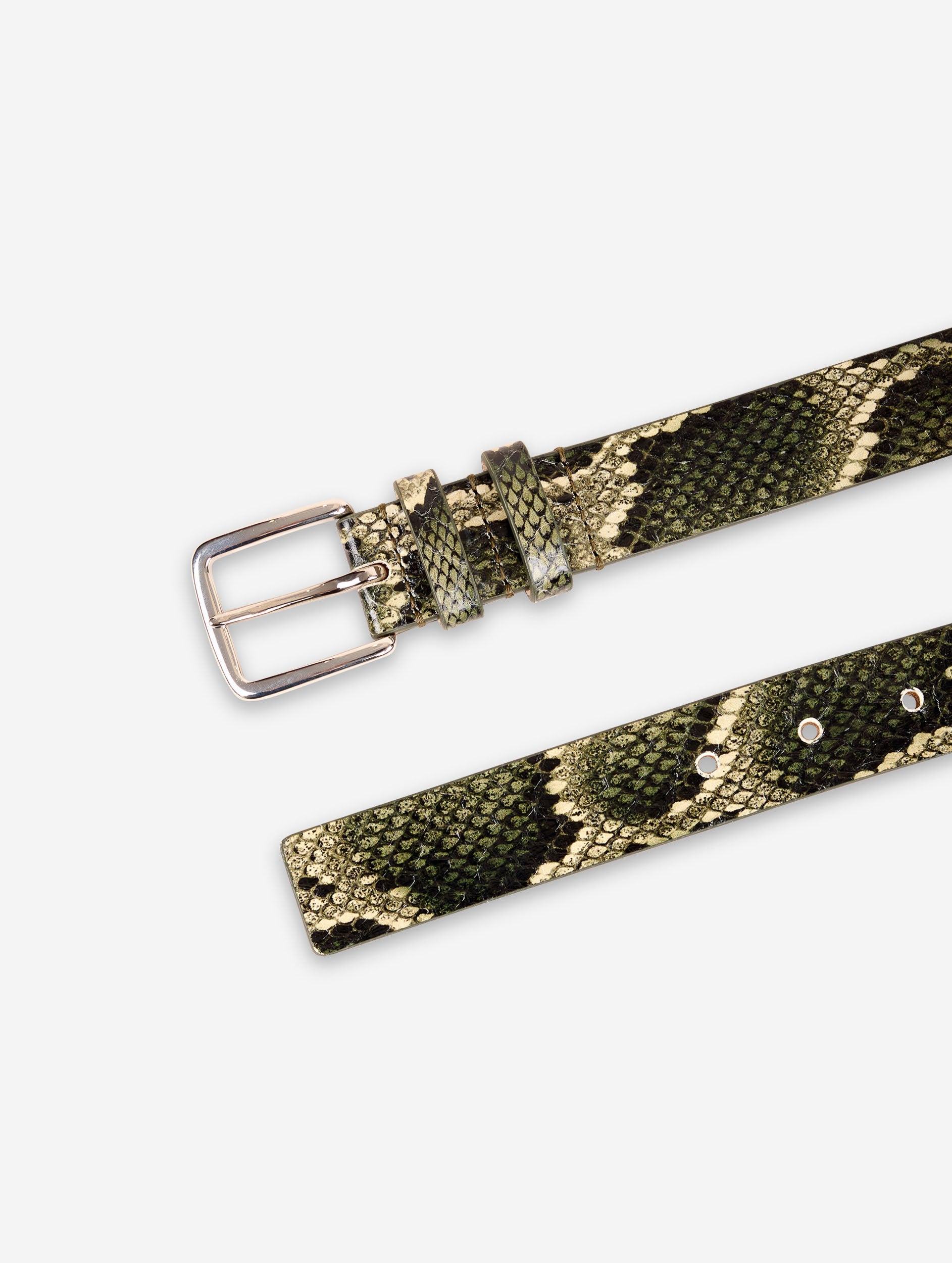 Medium belt in khaki digital "python" printed water snake. Nickel-finish men's buckle. 5-hole adjustment. Height 30 mm.