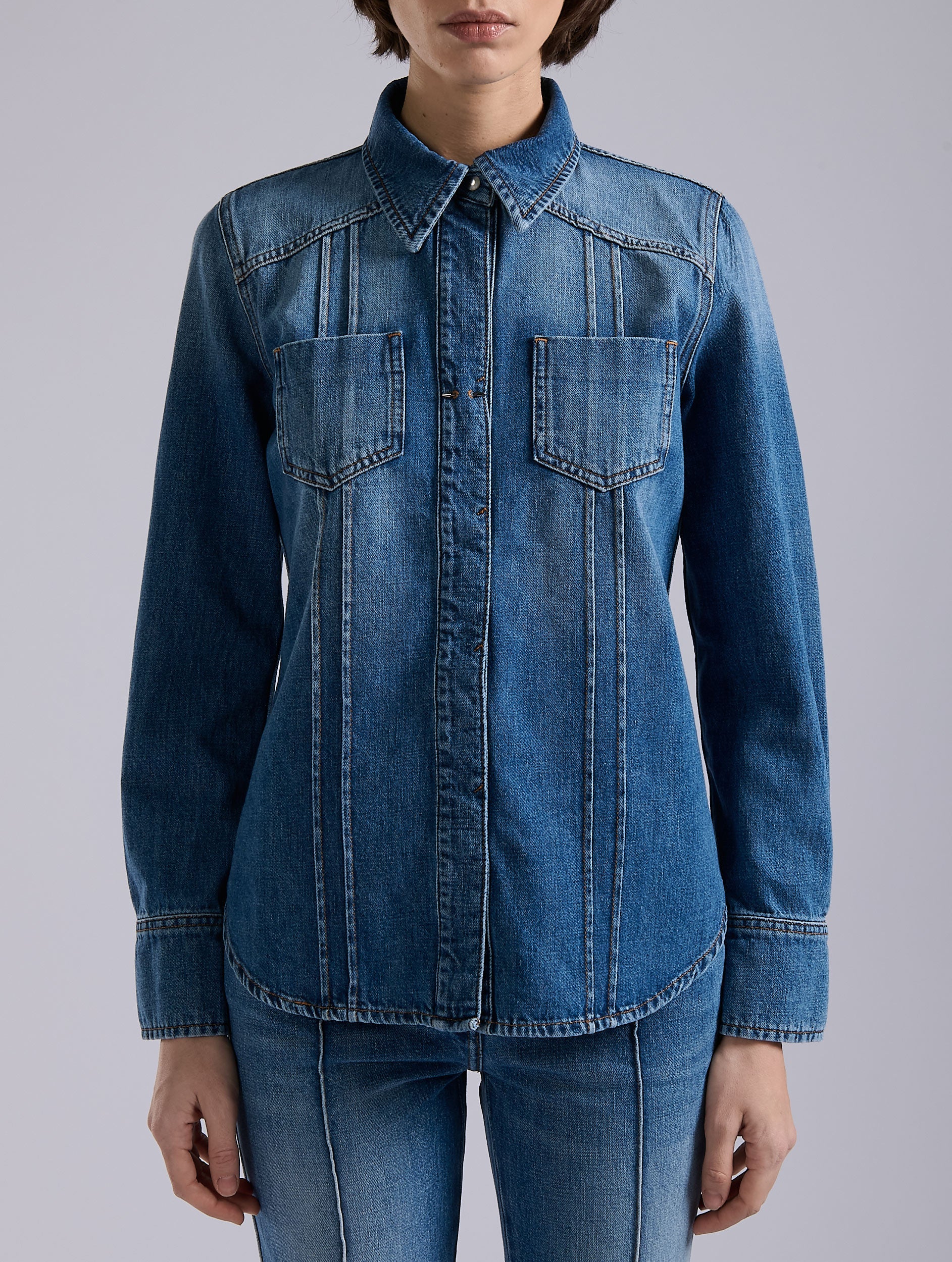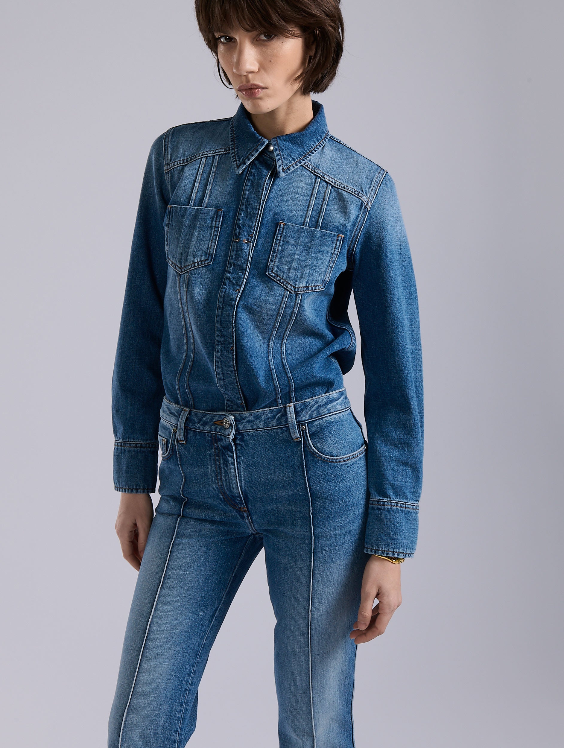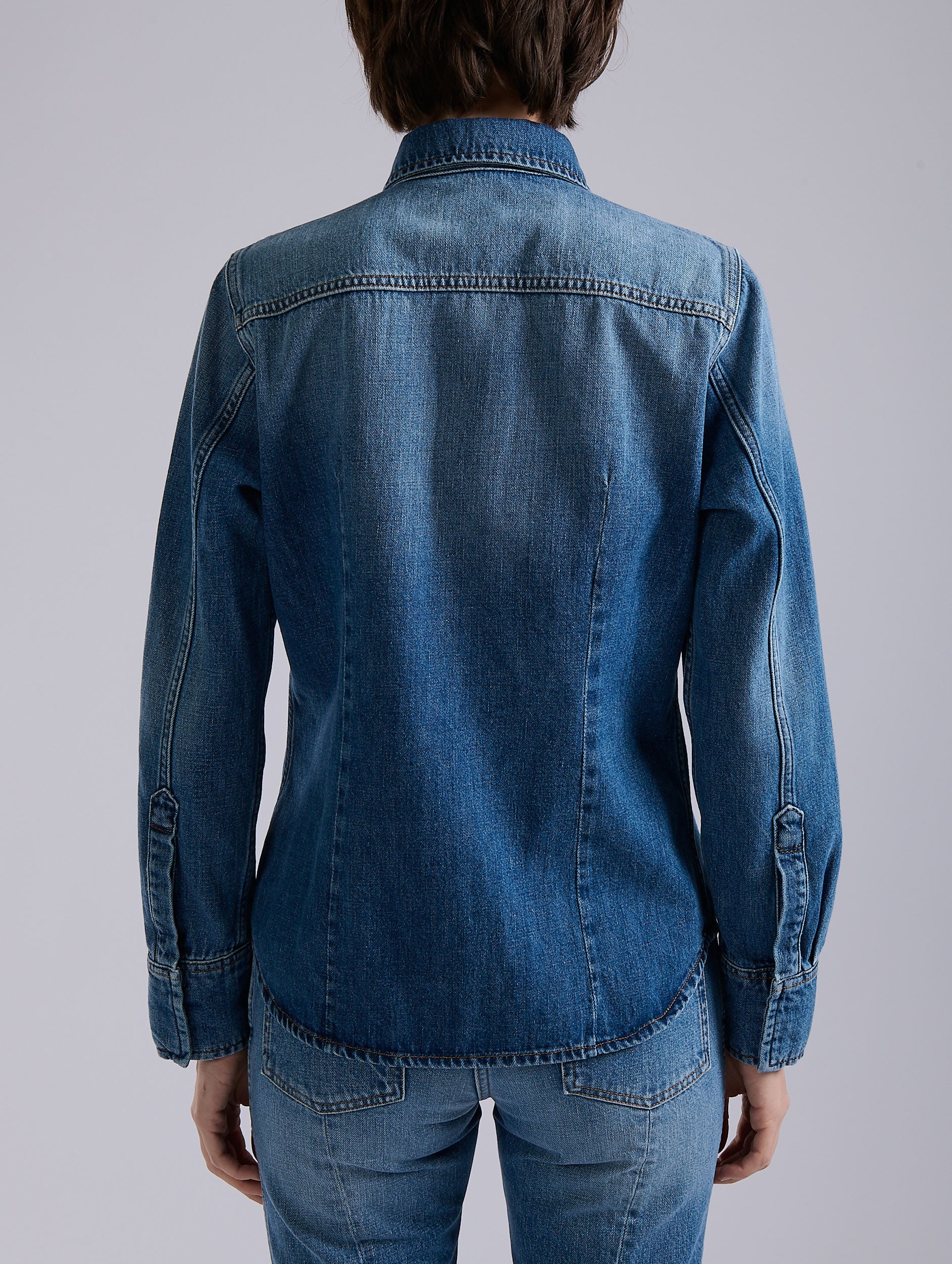 Denim is a fabric dear to Barbara Bui. Crafted from denim with a wash identical to that of our bootleg jeans, this slightly fitted denim shirt can be paired with them for a trompe-l'œil effect reminiscent of a jumpsuit. The attention to its cut and finishes draws from the tailoring expertise of the house, while retaining the tobacco-colored topstitching emblematic of workwear wardrobes and featuring the iconic Barbara Bui piercing jewel on the front. With its hidden button placket, pleat detailing, and two patch pockets, this shirt ushers denim into a new era.