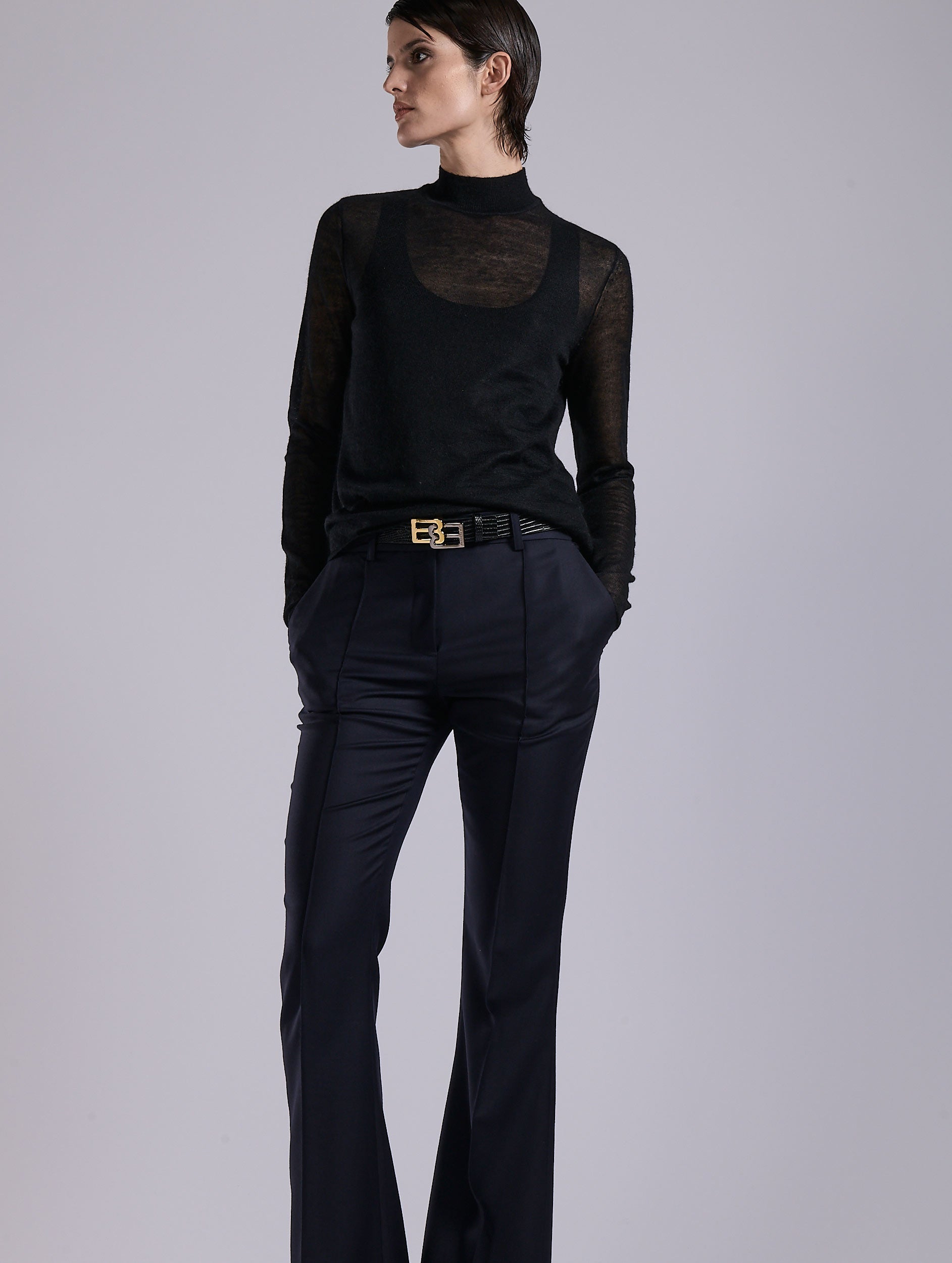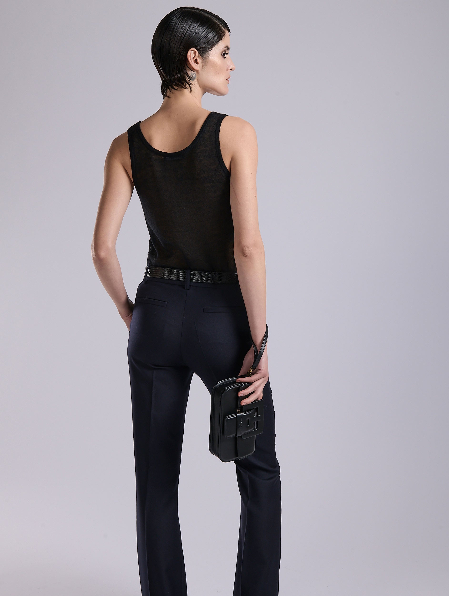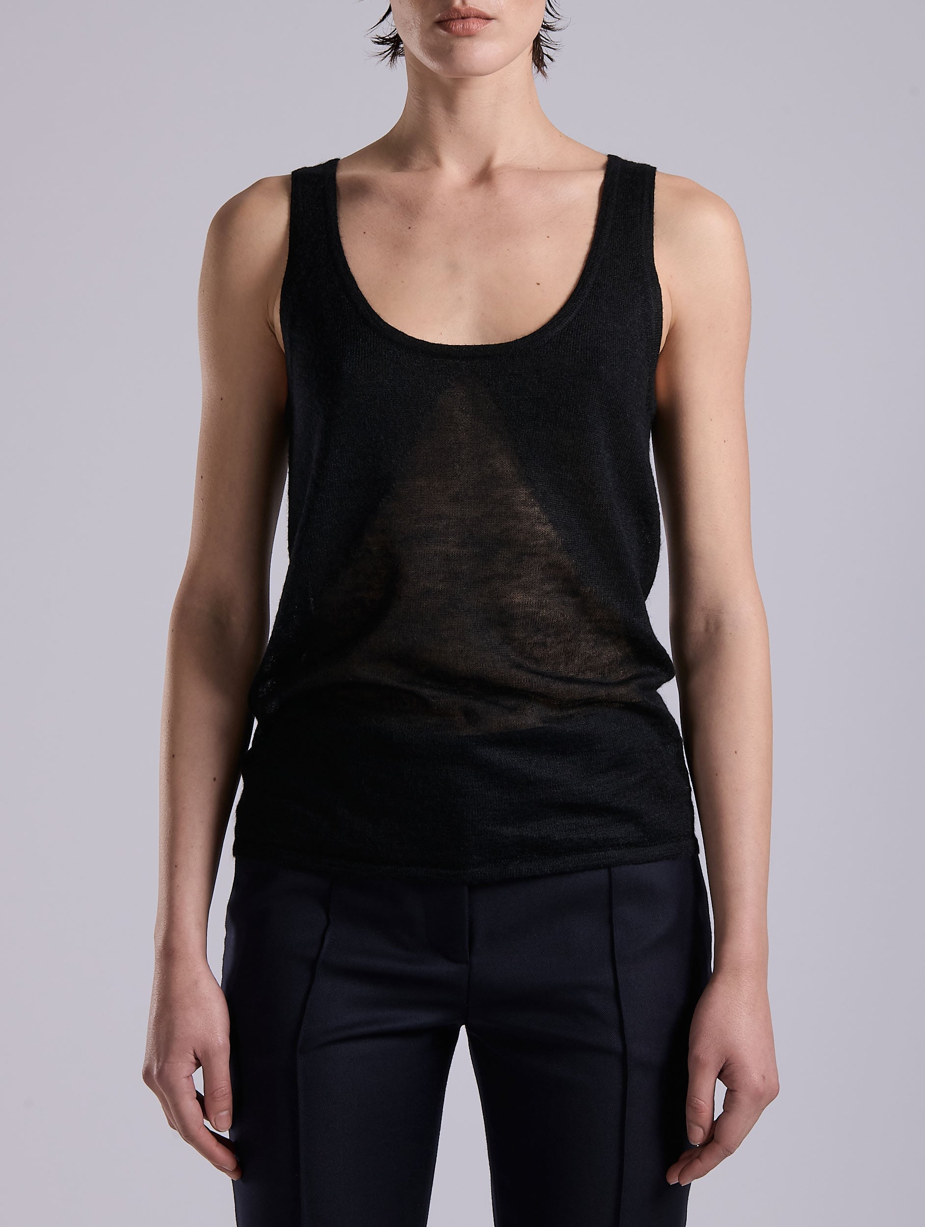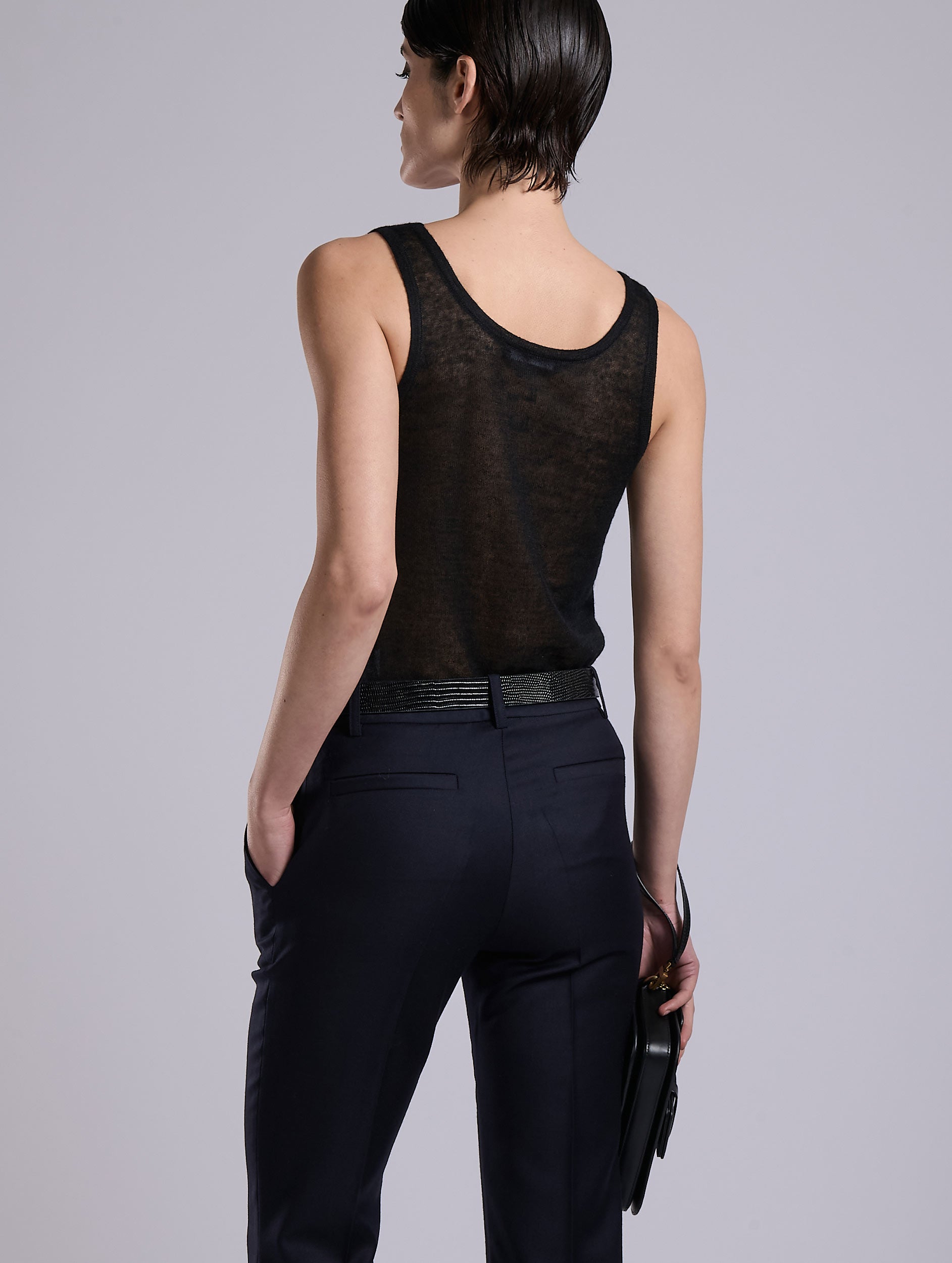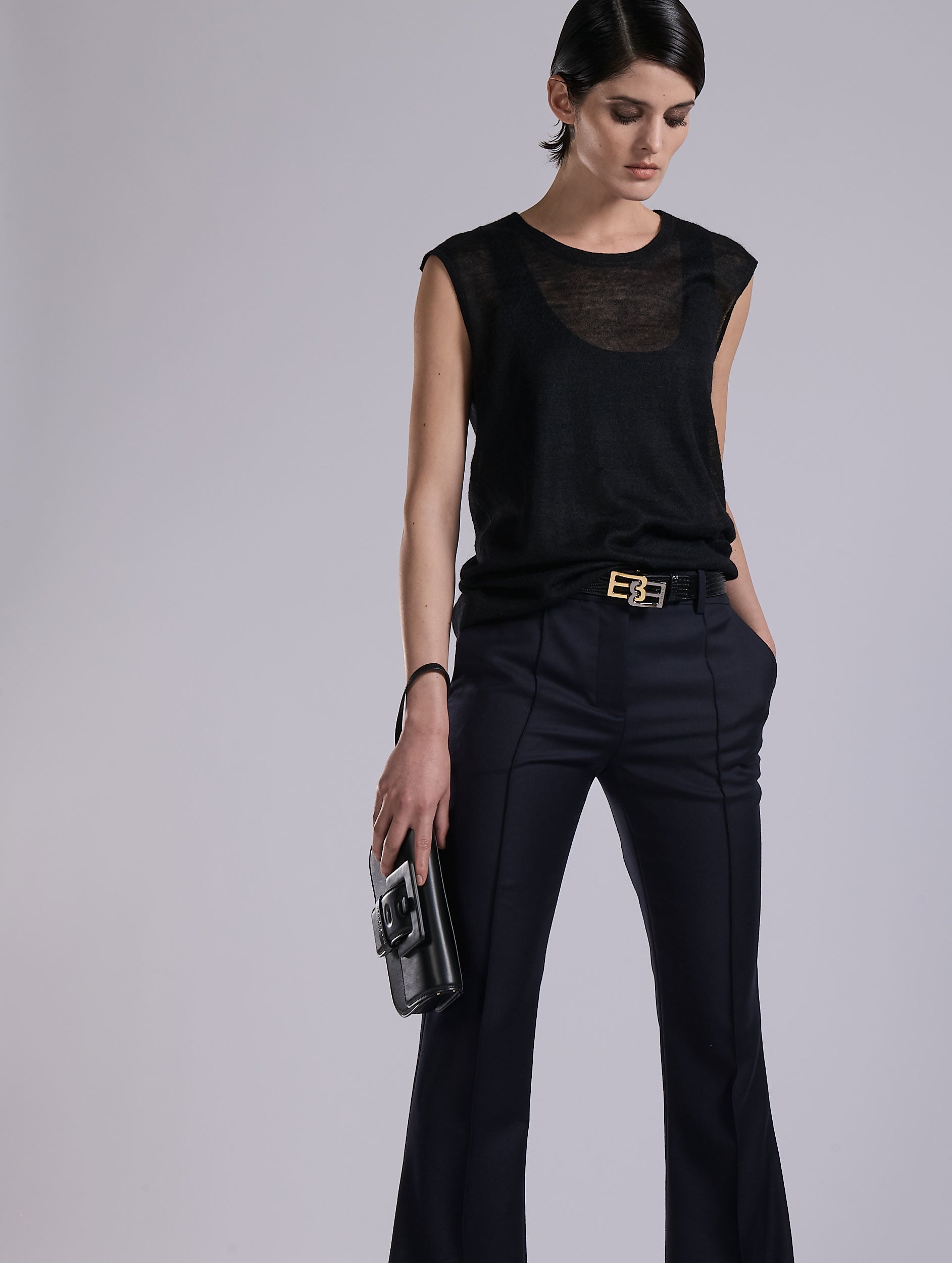 Barbara Bui twists knitwear with this sleeveless top made of voile knit with a cashmere feel. Its lightweight, airy texture caresses the skin, subtly revealing the silhouette through delicate transparency. Available in black, grey, or navy, this second-skin top becomes a sensual and essential piece, to be worn next to the skin or under a light sweater. Its straight cut and scooped neckline ensure lasting comfort, while its minimalist style makes it an indispensable item in the feminine wardrobe, offering both softness and character.