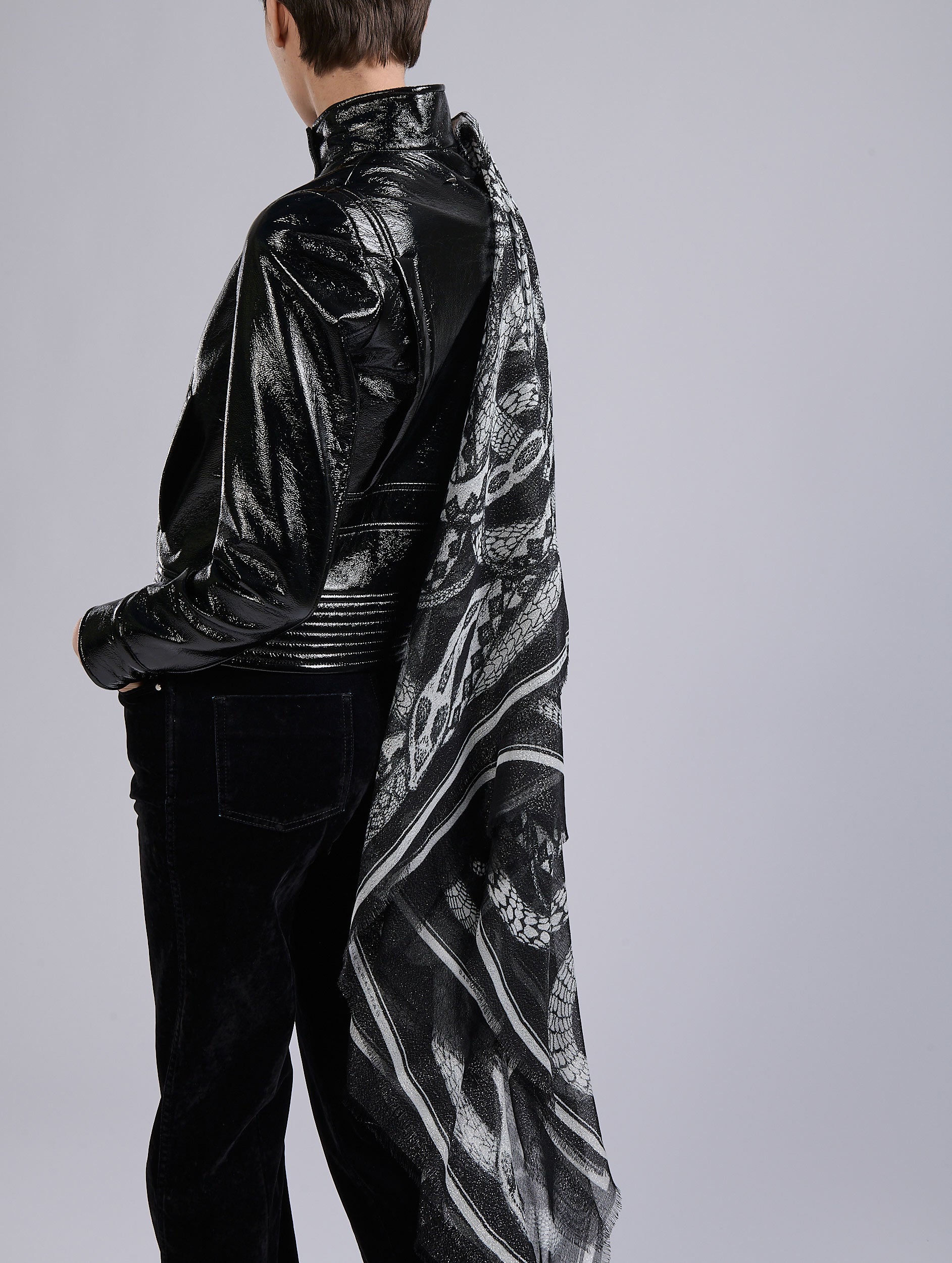 Emblematic of the rock and sensual spirit of the Barbara Bui wardrobe, the snake is featured in an exclusive metallic black print. Perfect for adding a touch of shine to an all-black outfit, this scarf can be draped in multiple ways to accessorize your simplest looks. Soft and comfortable, this stole with its black and silver snake print is a valuable ally for enhancing a silhouette. Its white borders feature the Barbara Bui signature, a subtle detail that blends with the graphic print, while fine fringes add to its enchanting charm.