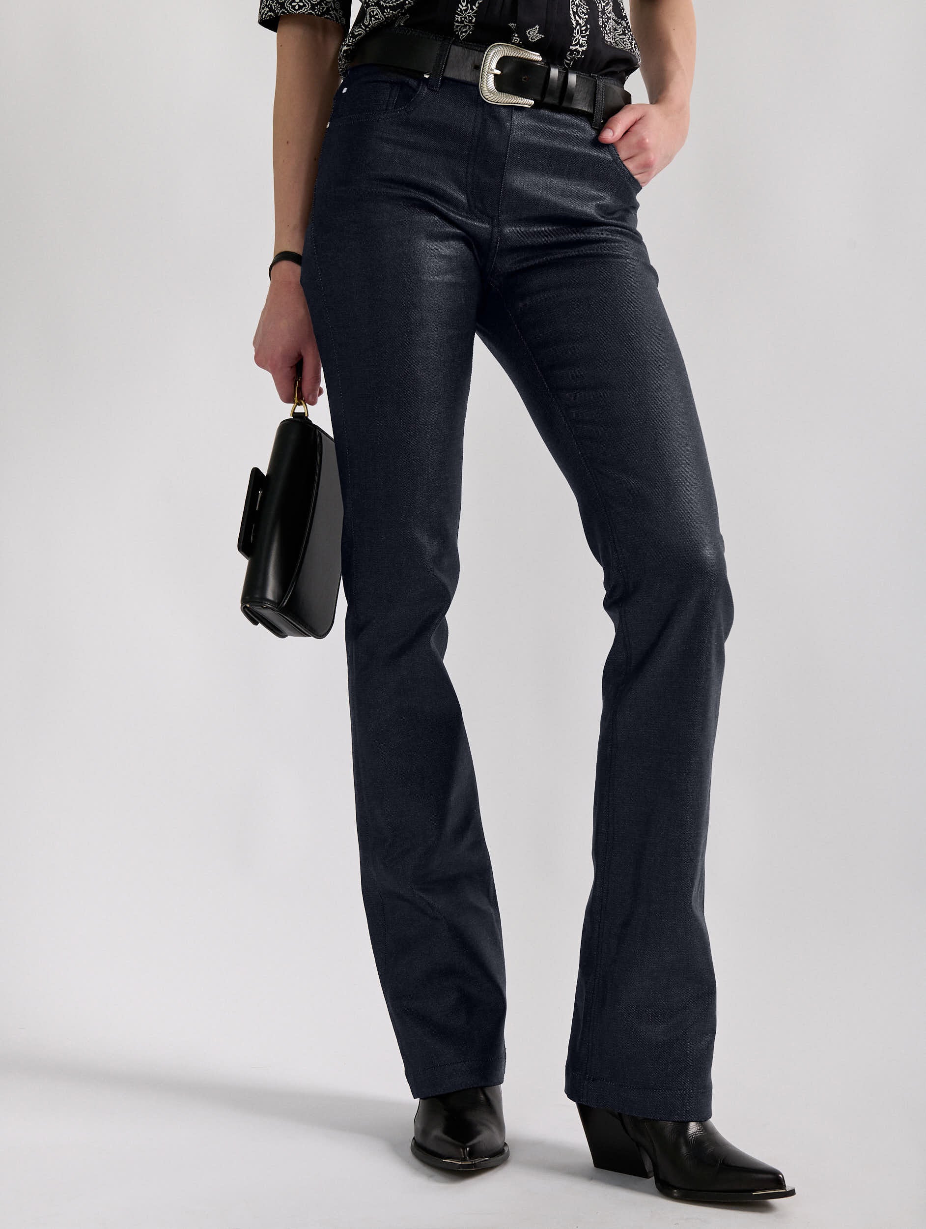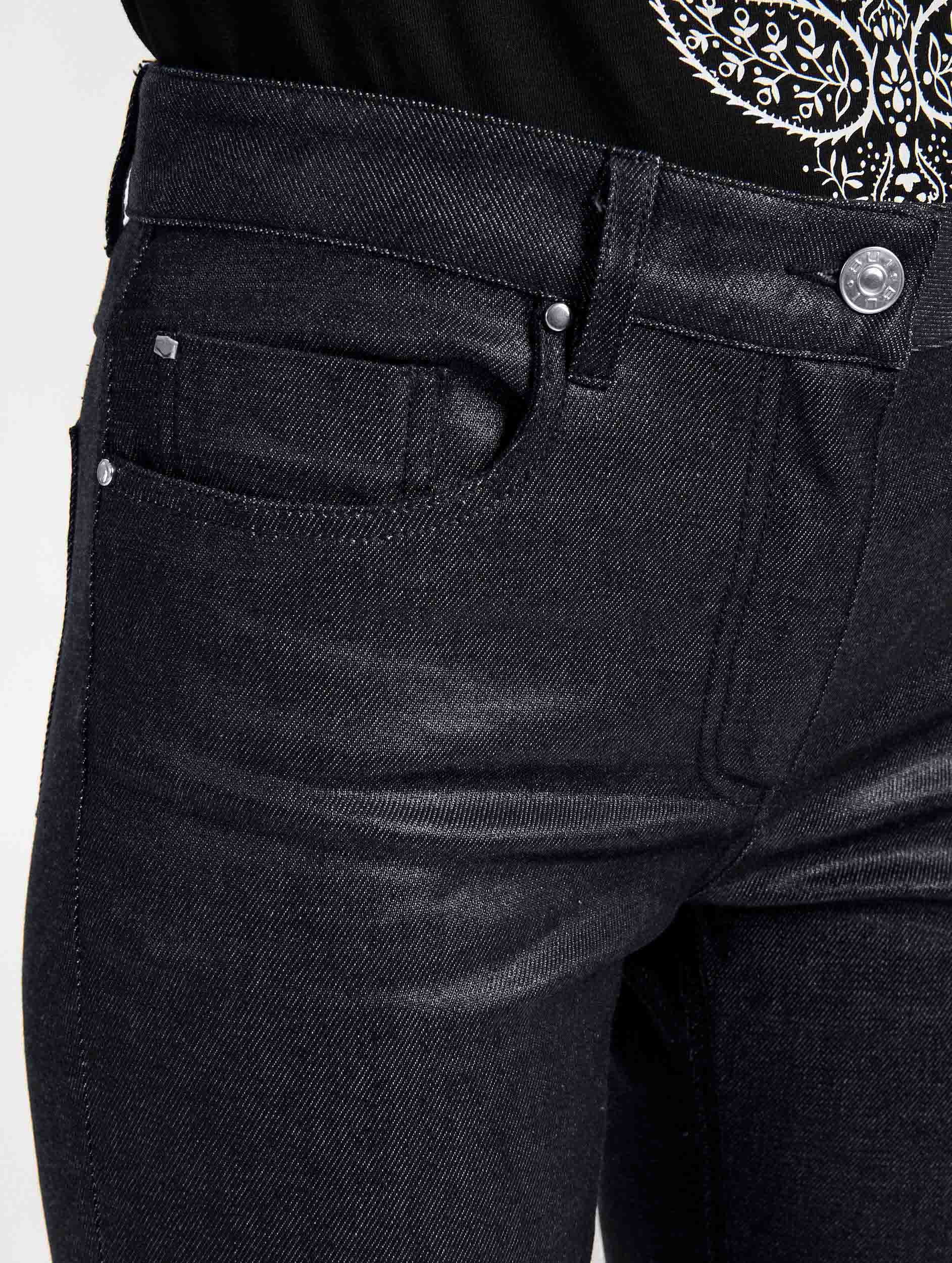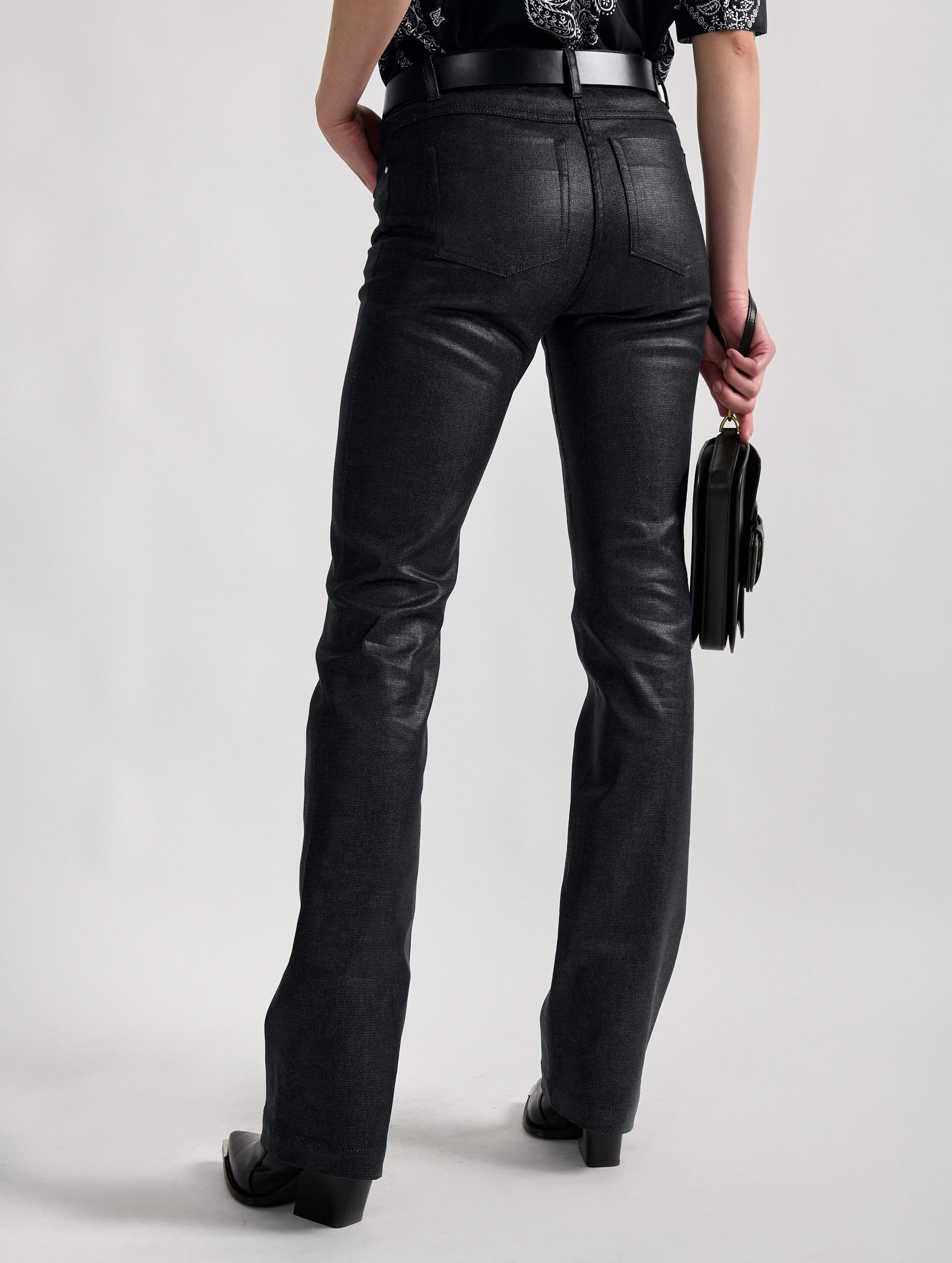 These 5-pocket jeans in black or gold resin denim make a statement with their straight-leg fit. On the ticket pocket, you'll find the “gold tab”, a rock-solid, precious jewel detail in gold-plated metal that has always been a Barbara Bui denim signature. Paired with a jacket, or as a smartly casual alternative to suit pants, these flattering straight-leg jeans create an eminently modern silhouette.