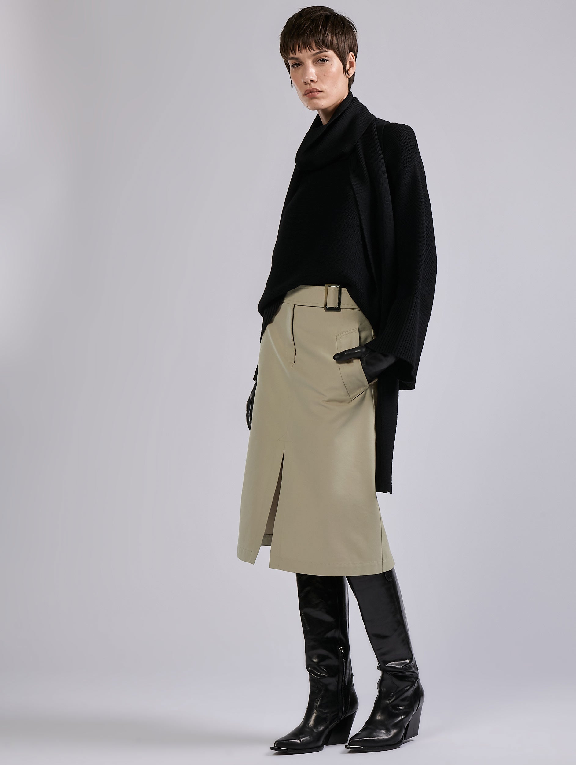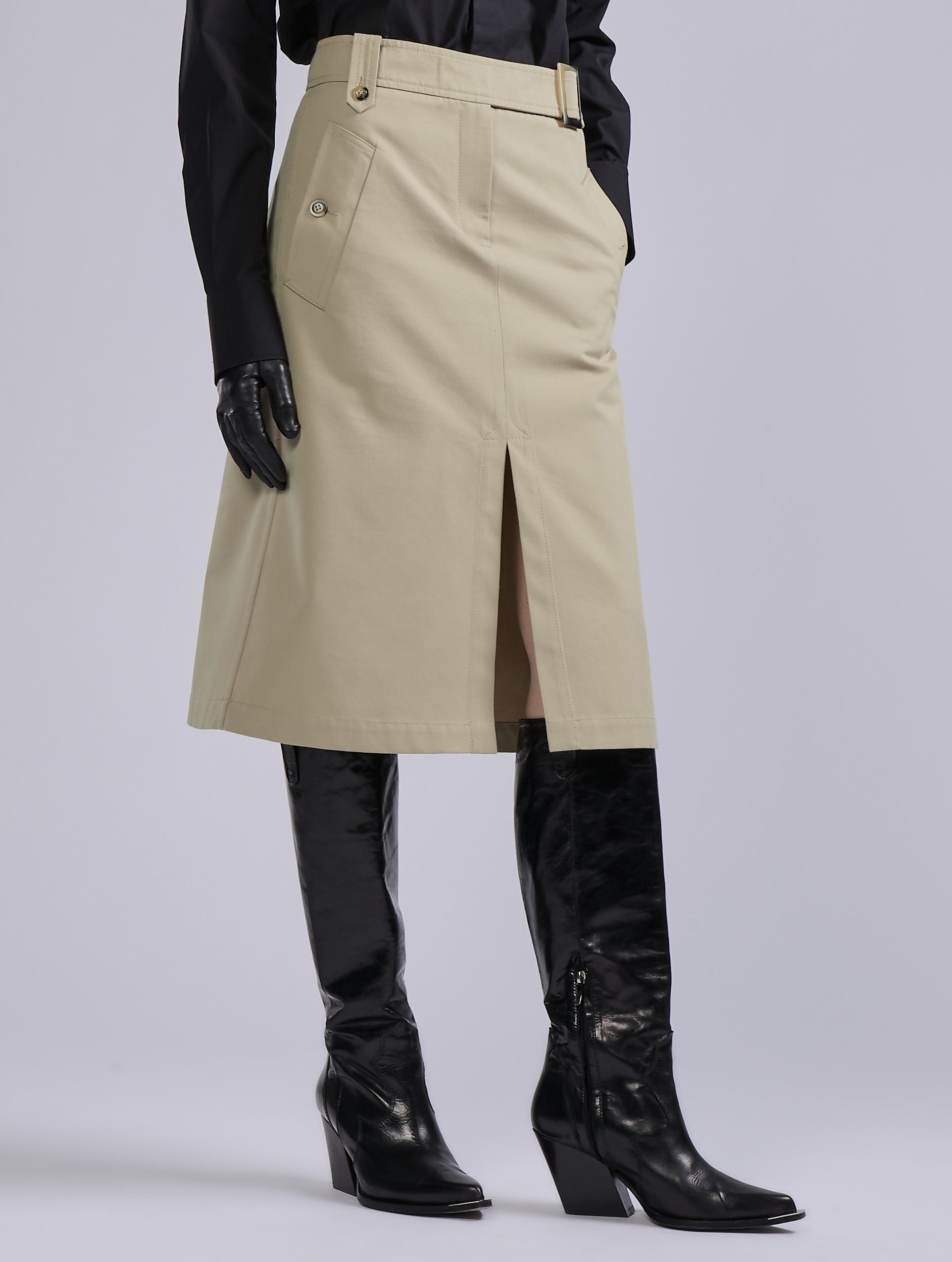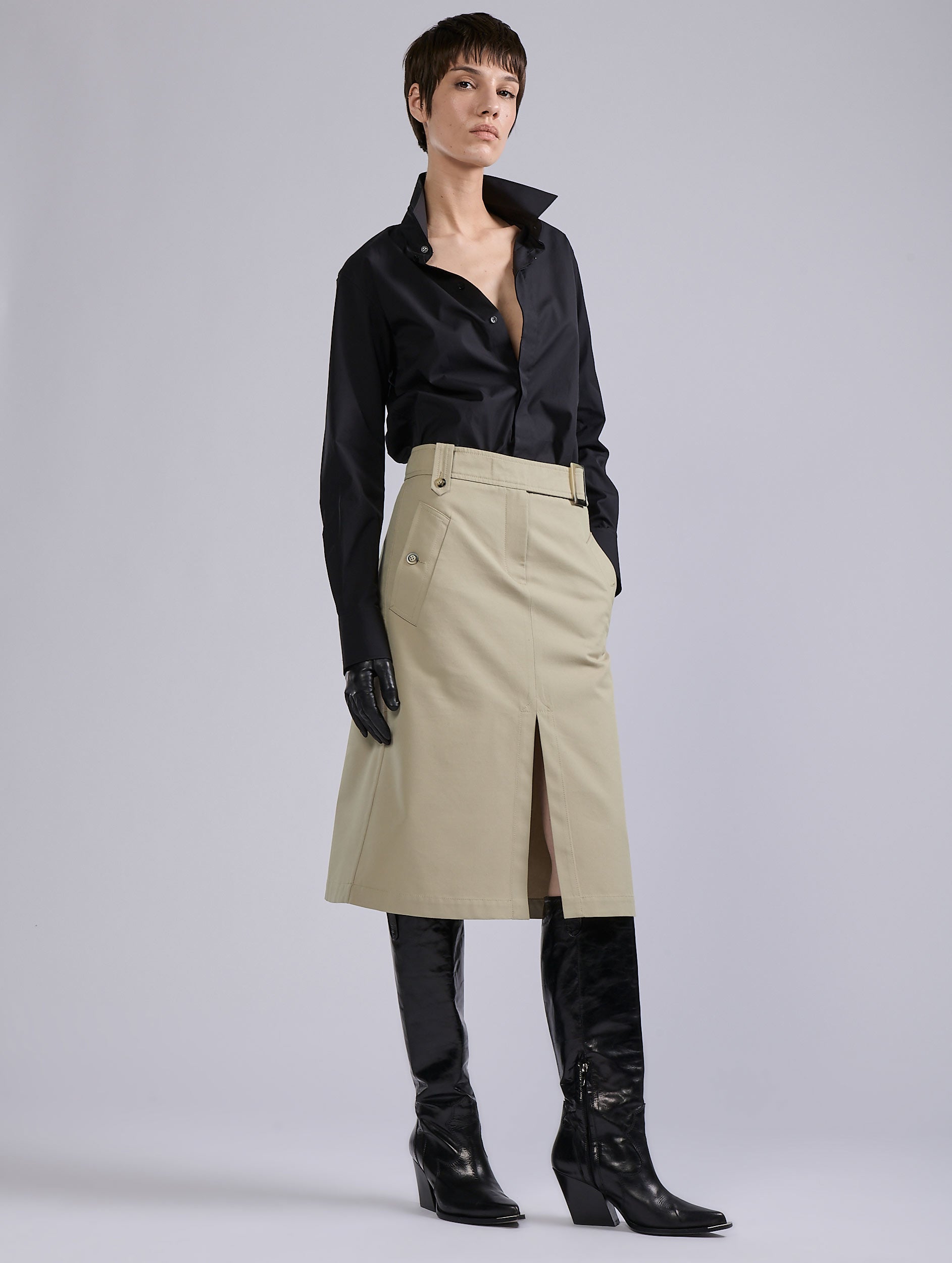 Made from a sand gabardine fabric blending wool and cotton, this knee-length A-line skirt reinterprets the trench coat codes with subtlety. Its high waist and structured cut, marked by a real front slit and a faux slit at the back, play on contrasts between comfort and sophistication. The utilitarian details, side pockets closed with horn-style buttons, a square-buckle waistband secured with a front loop, and three buttons at the back, strengthen the character of this timeless piece. Its sand color softens the silhouette and will pair beautifully with a white shirt or a generous knit and a pair of boots for a sophisticated and versatile look.
