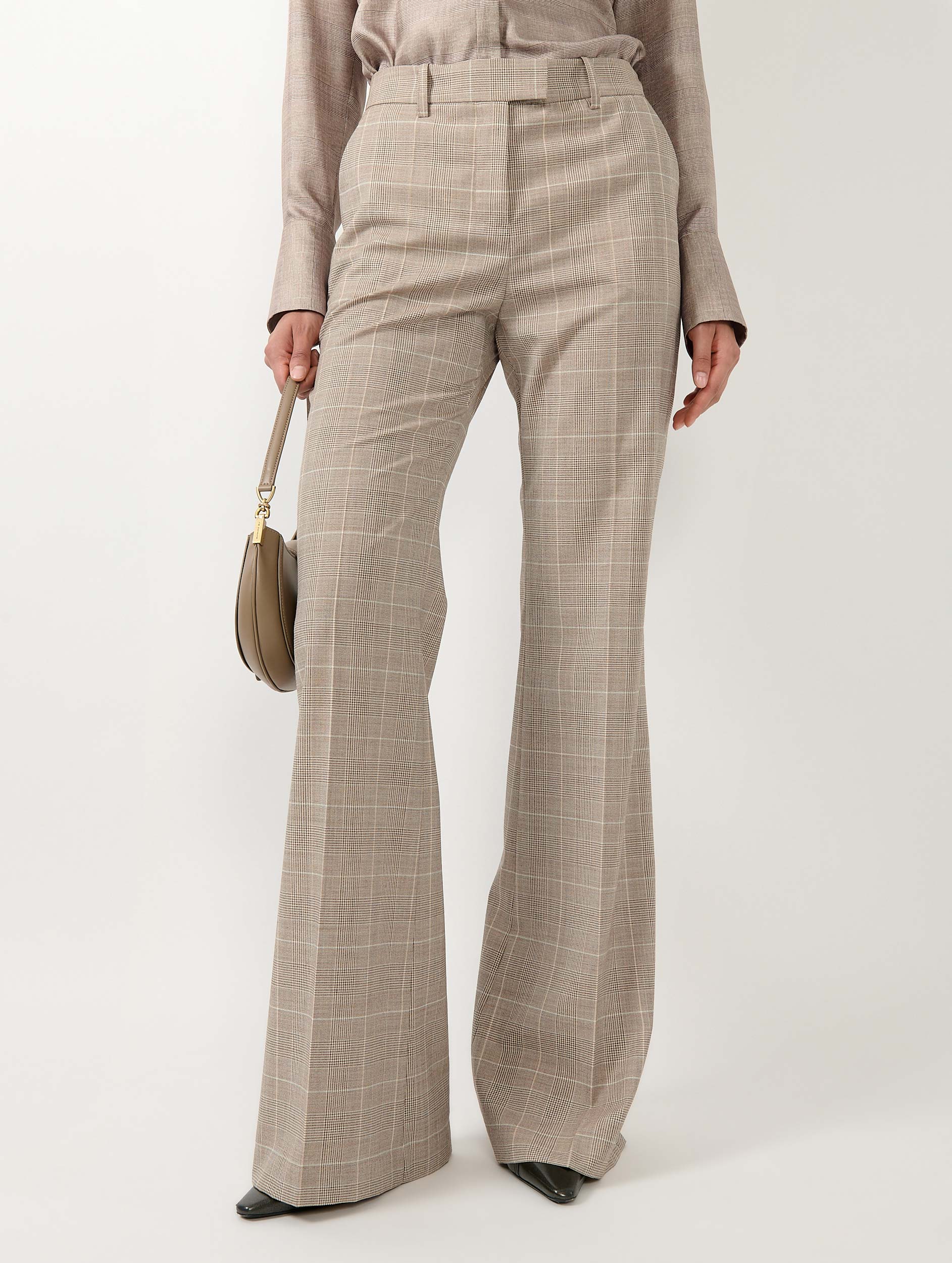 Sand Prince of Wales check flare trousers