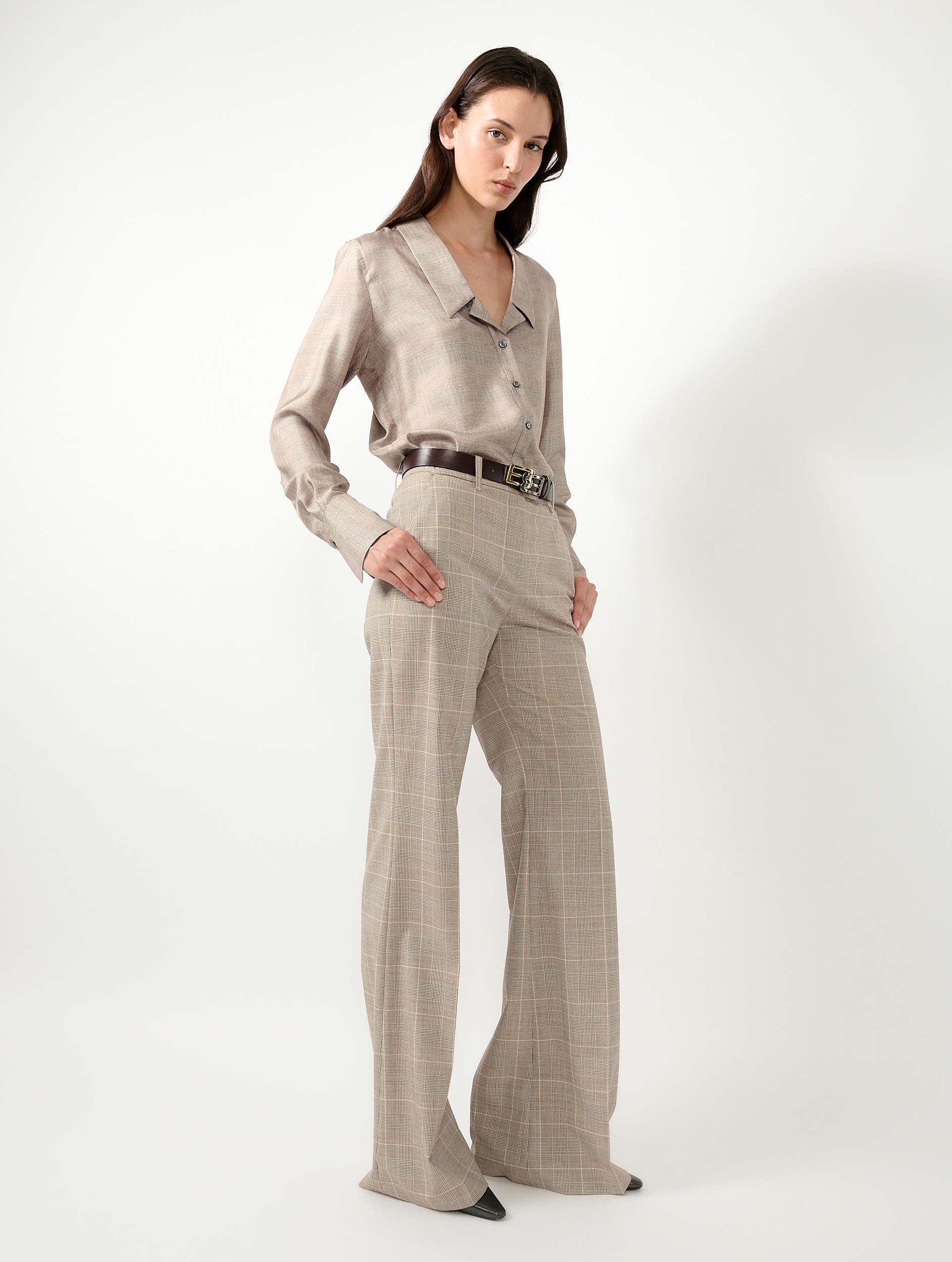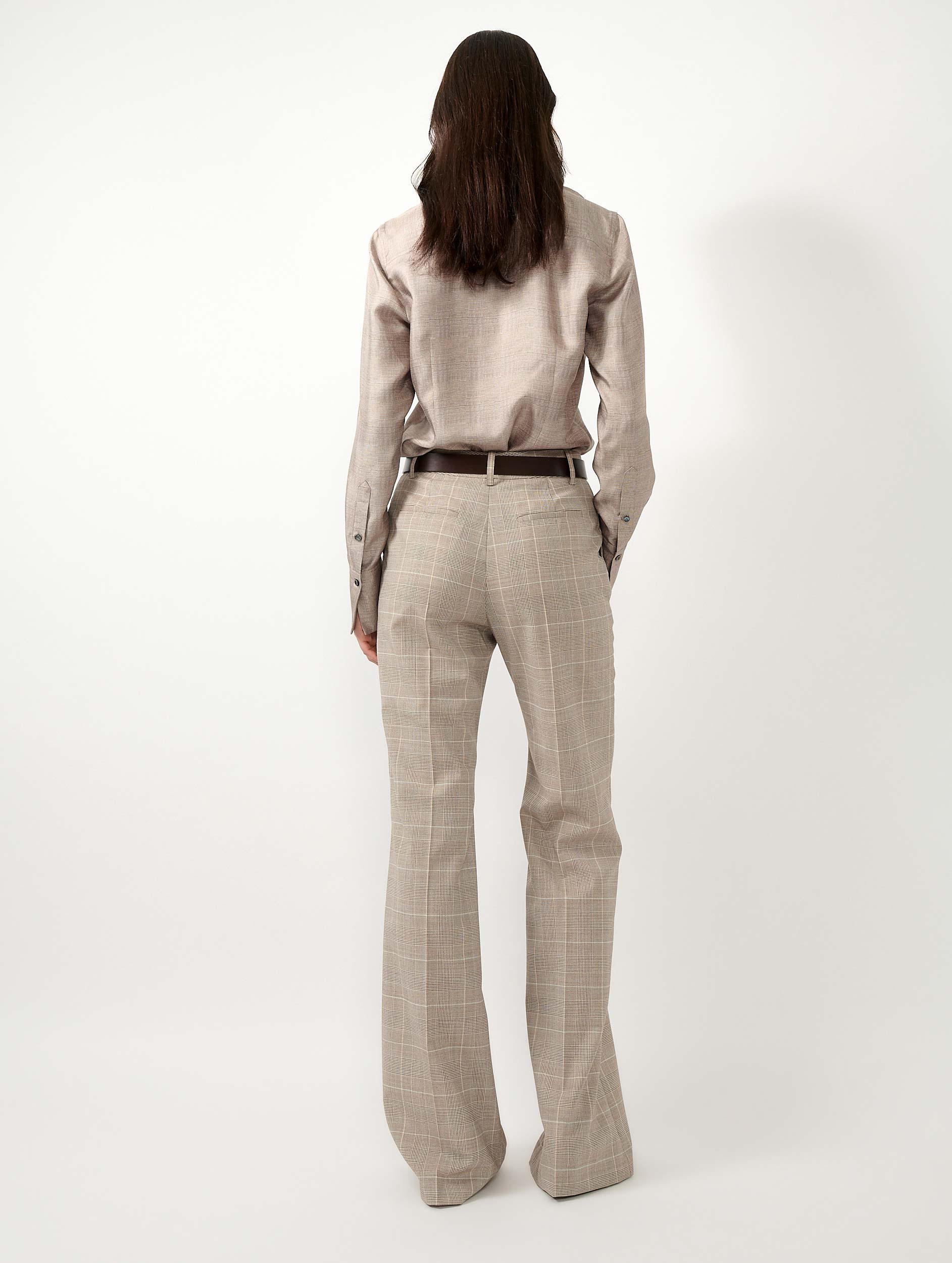 The association of a flare cut dramatically flared from the knee with a fluid wool printed with Prince of Wales checks accentuates the modern elegance of these trousers. Their marked crease runs along the leg to elongate the silhouette while their neat finishes testify to the love that Barbara Bui bears for pieces inherited from the masculine sartorial tradition, always reworked to sublime the woman and accompany her in her daily life. To accentuate the graphic look of these tailored trousers, dare the total look by wearing them with their jacket layered over the Prince of Wales silk twill shirt in a duo with its tie.