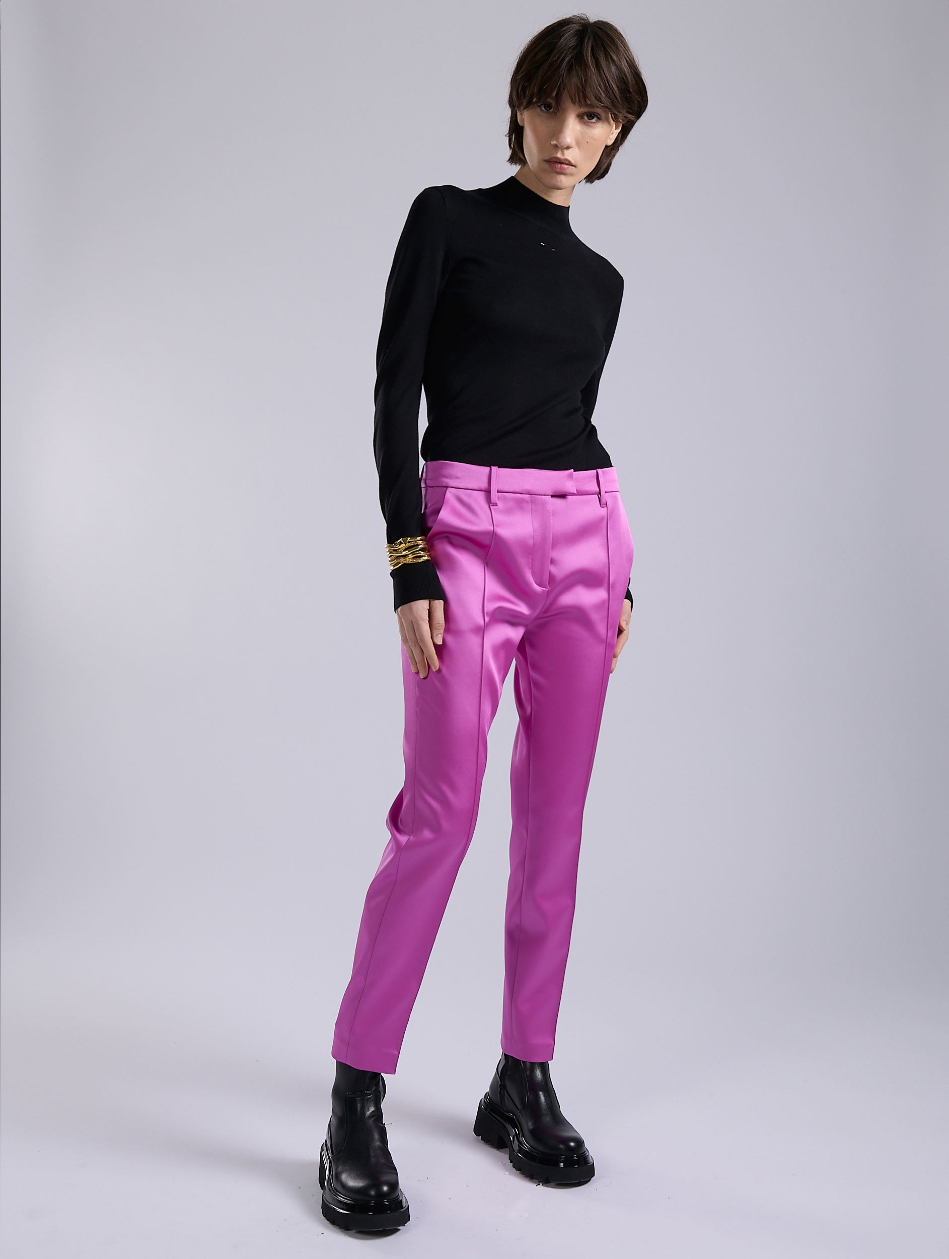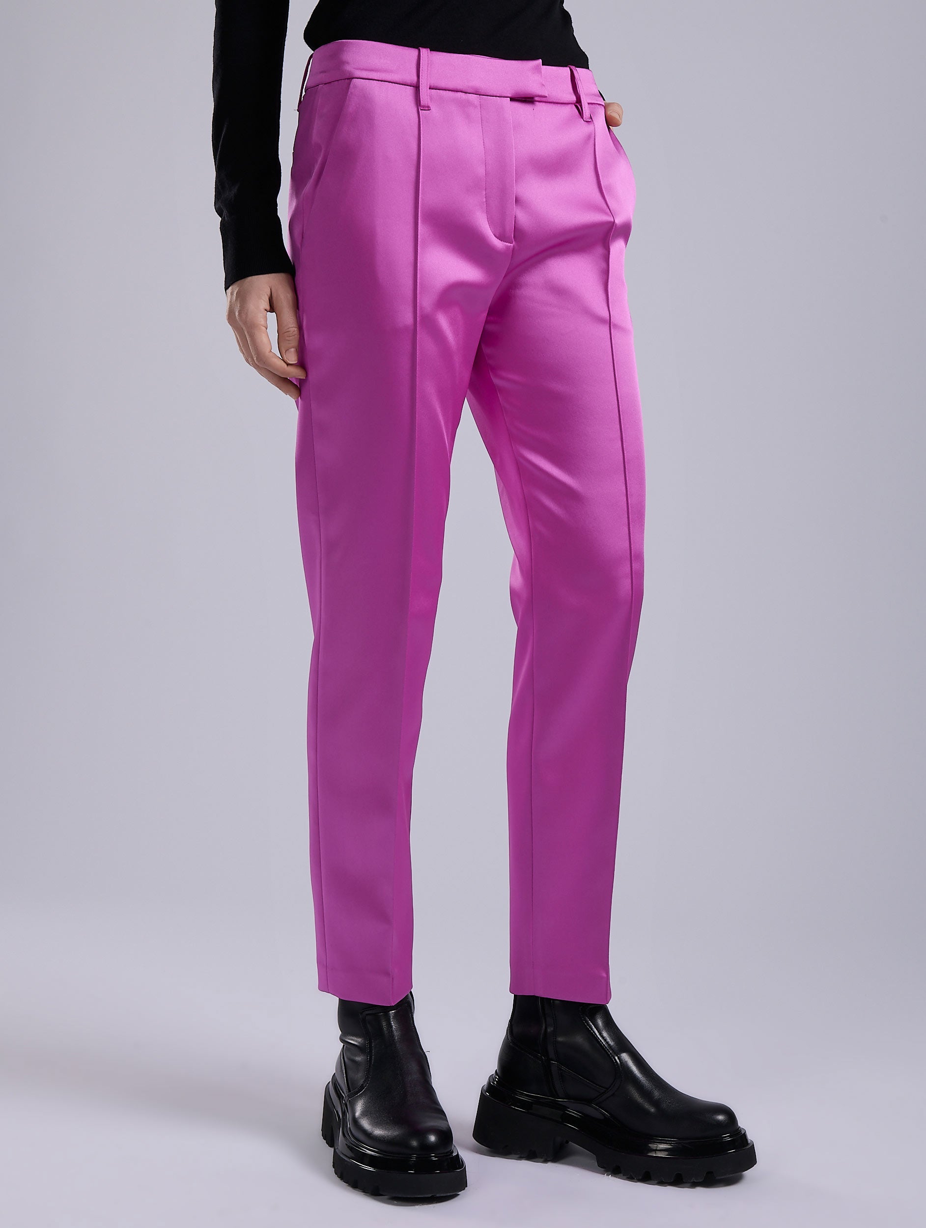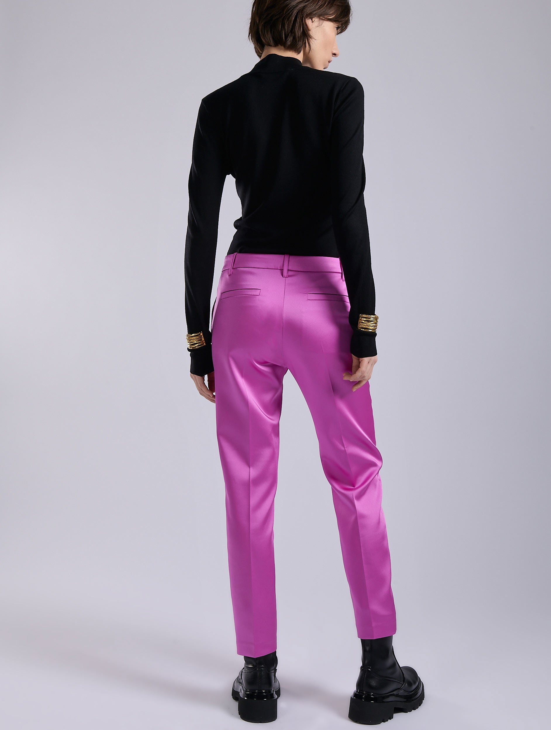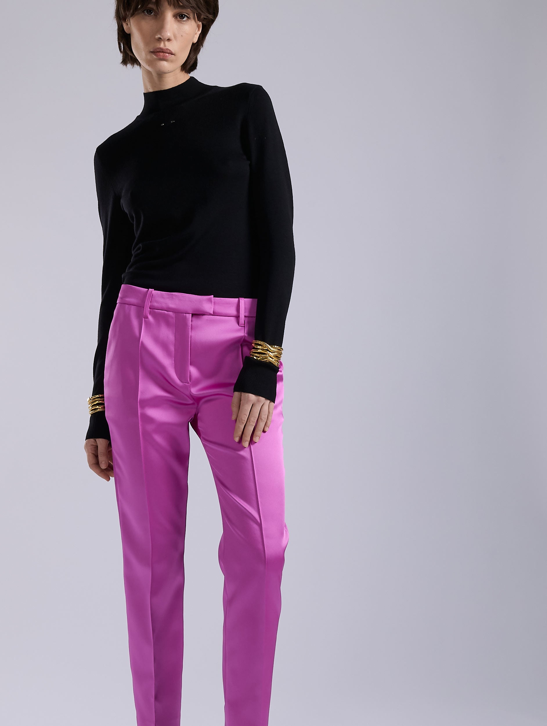 Women's suits are reinvented in vivid hues, to be worn as a total look or as a touch to liven up a more classic silhouette. A House favorite, Roxy's 7/8-cut pants retain their impeccable lines and meticulous finishing, with a pronounced pleat that elegantly elongates the leg, whether worn with ankle boots or derbies. Minimalist and comfortable, it goes just as well with our tailored jackets as with a fine knit sweater. Available in pink or red satin, these women's pants add a touch of sparkle to a wardrobe that's as versatile as it is elegant.