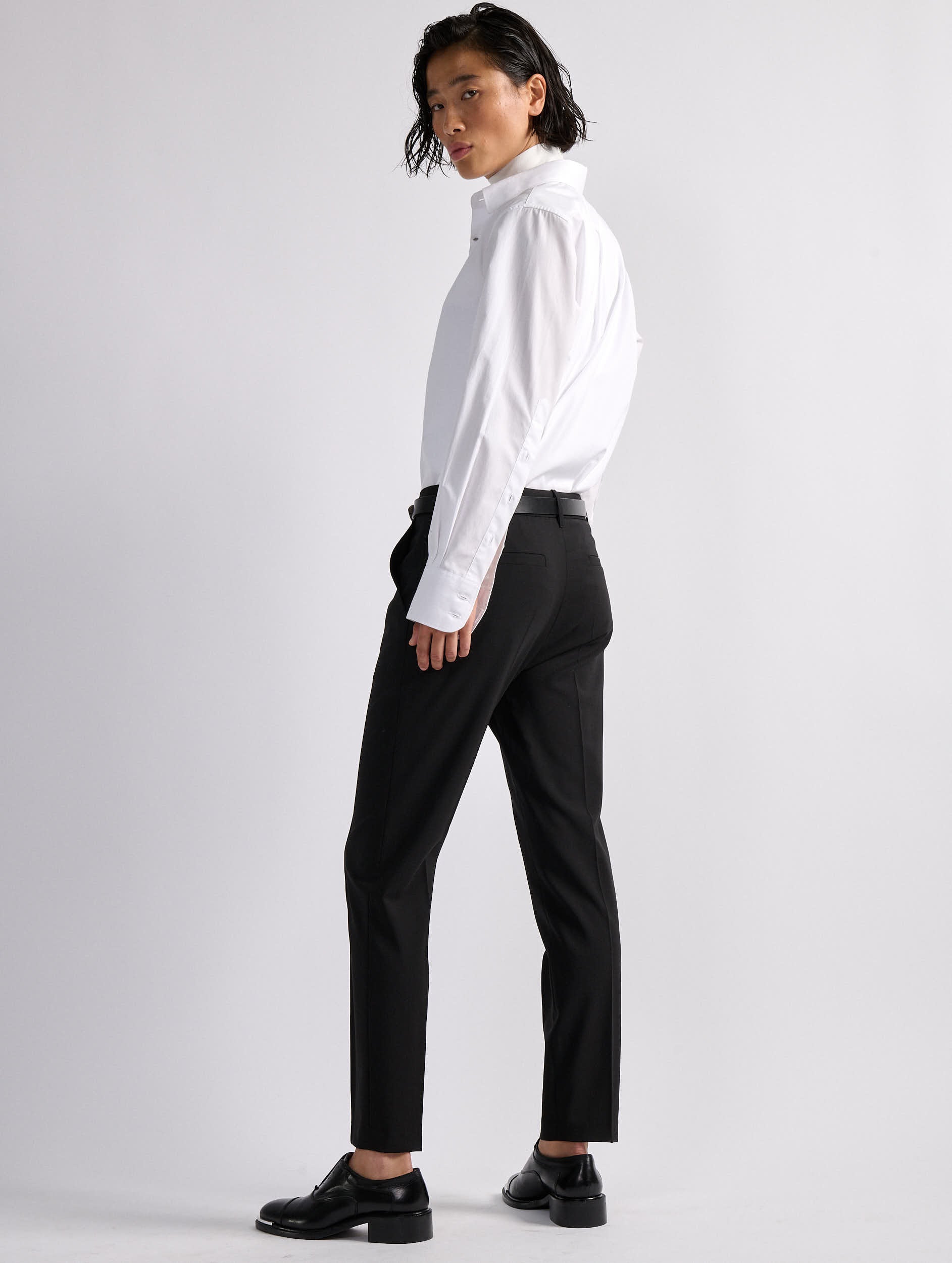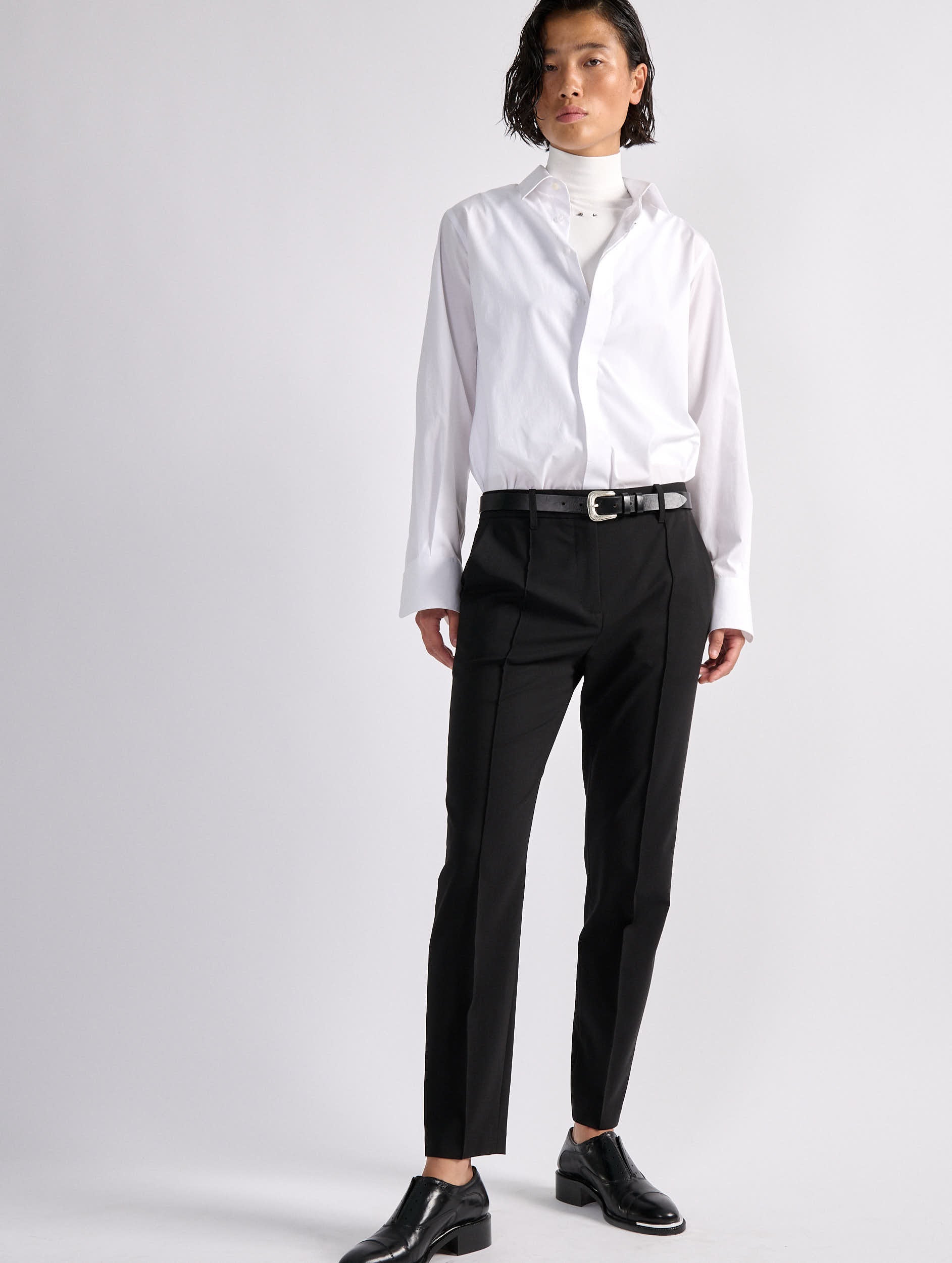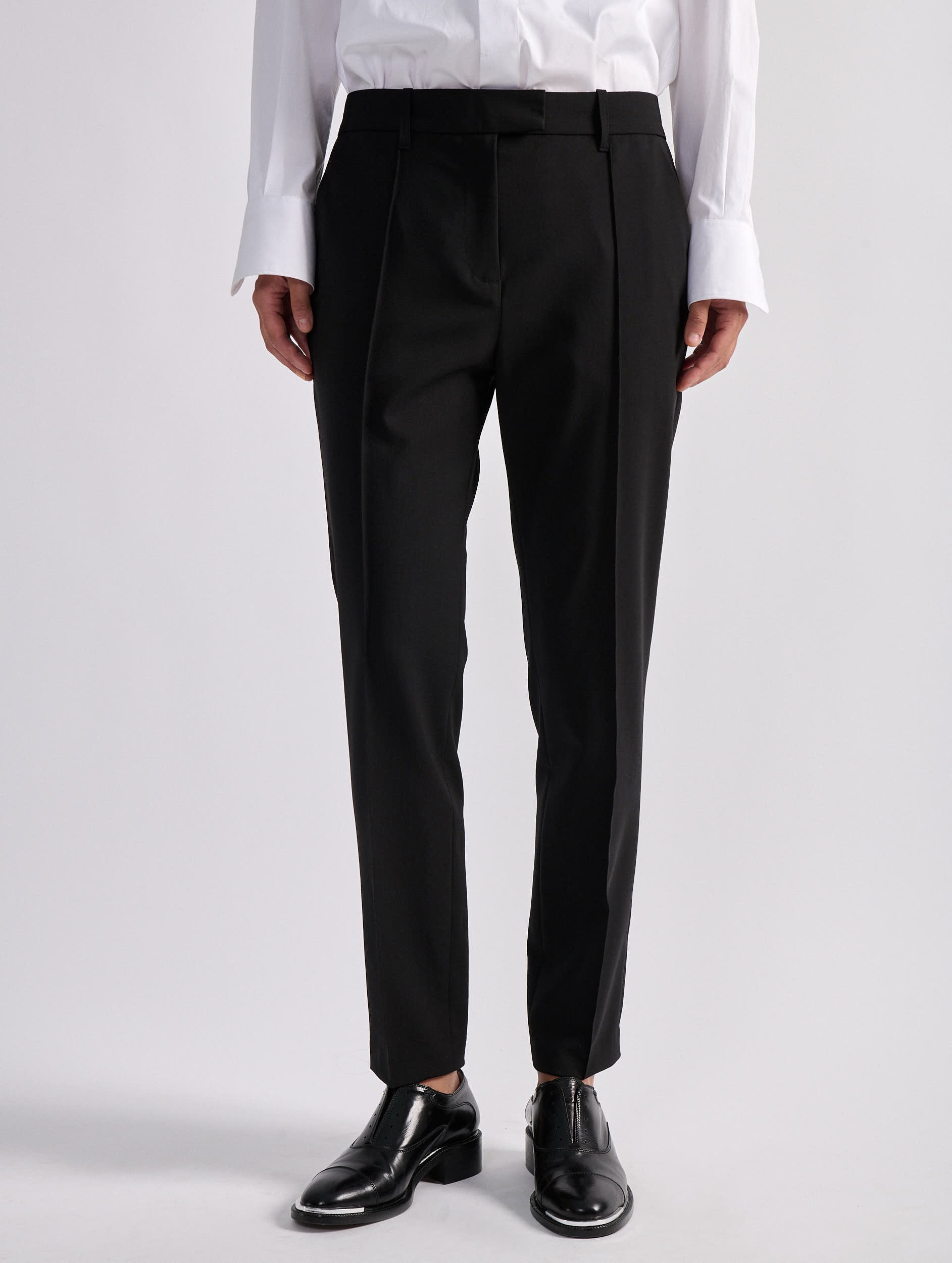 A classic in the Barbara Bui wardrobe, the Roxy suit pant is offered here in a comfortable black stretch wool fabric with an impeccable fit. Timelessly versatile, these straight-leg pants with sharp pleats reveal a 7/8 length that elegantly elongates the leg. Alone or paired with the matching straight-cut black jacket, these minimalist women's pants will become an indispensable ally for a multitude of occasions.