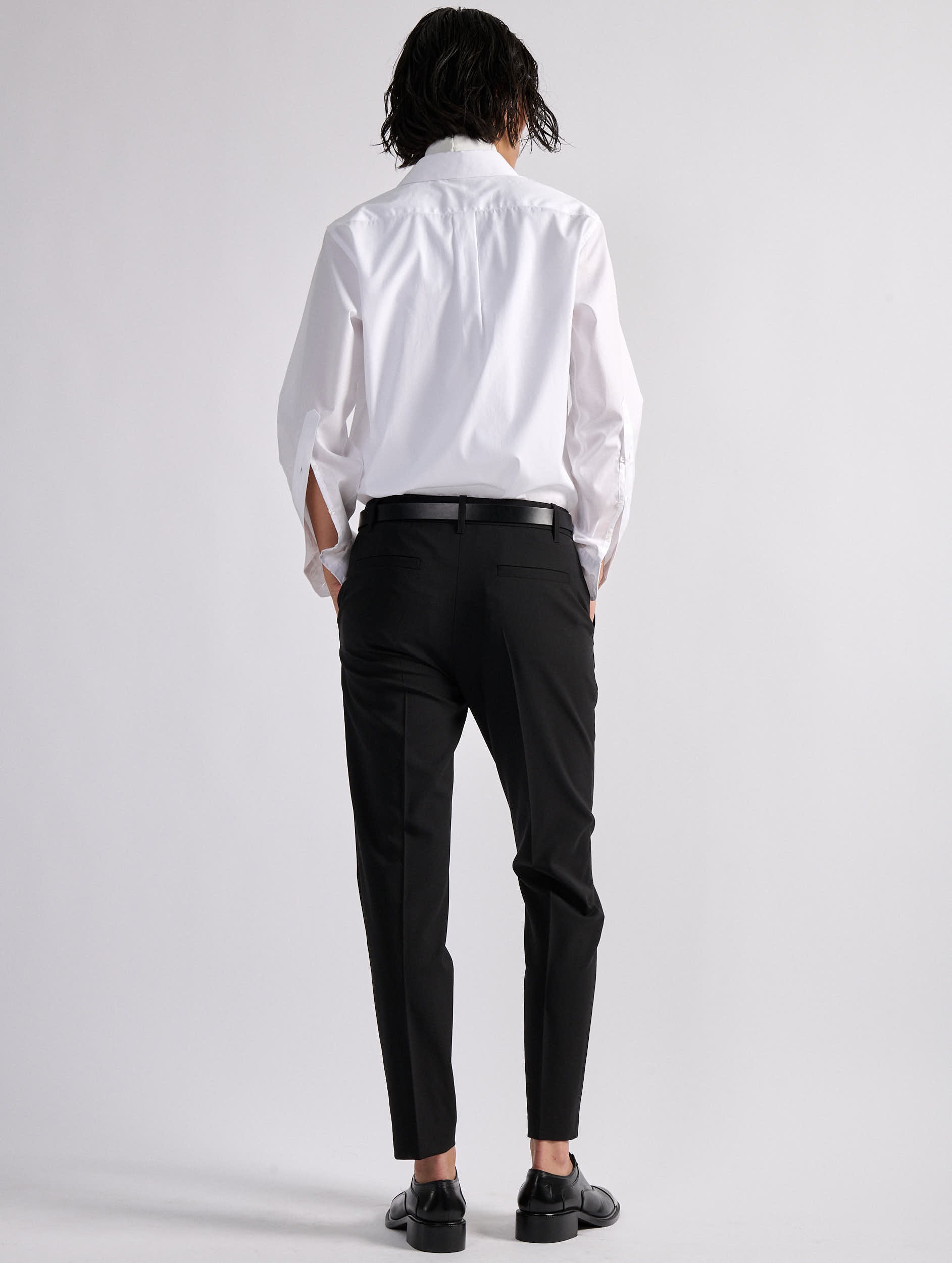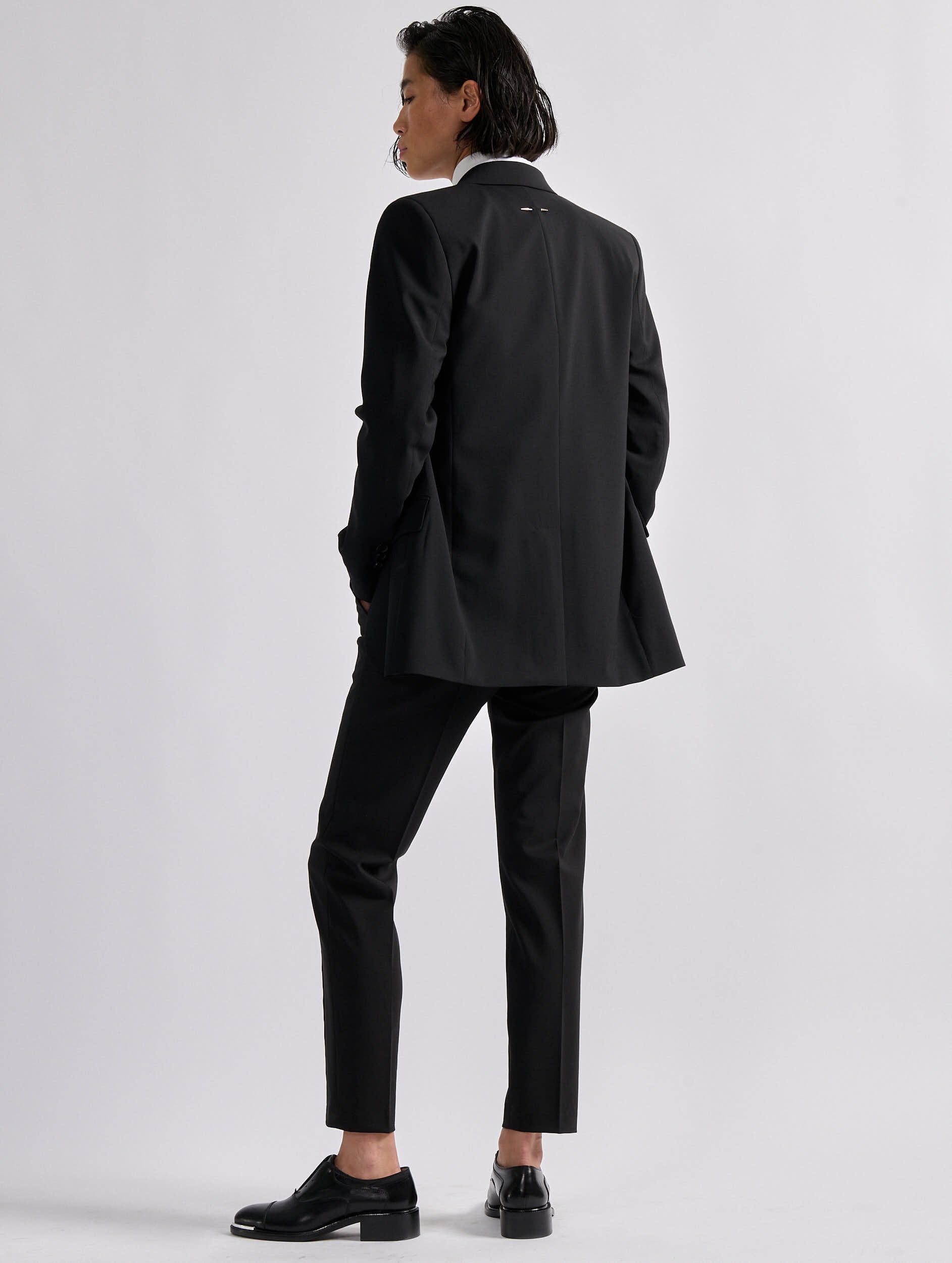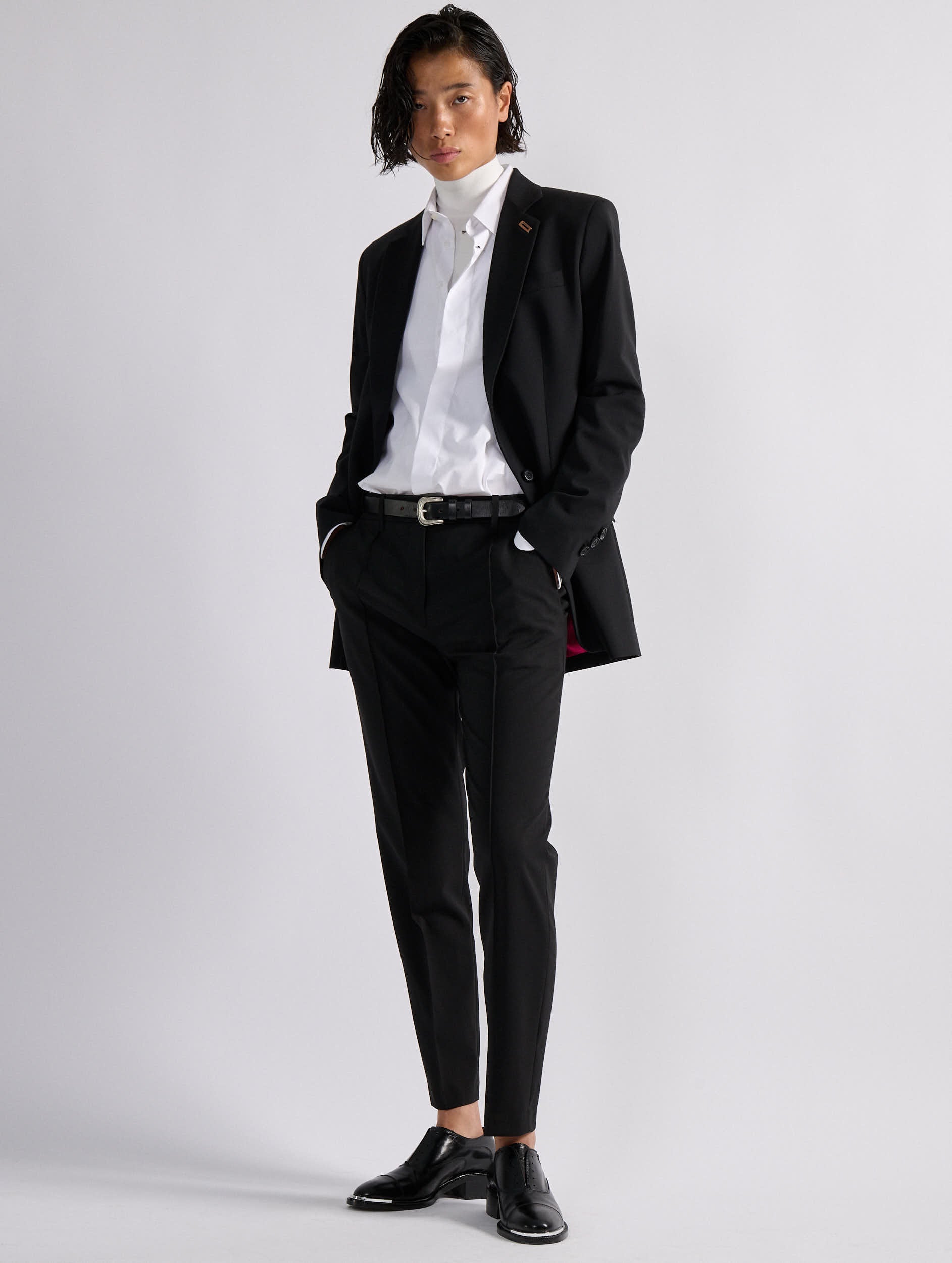 A classic in the Barbara Bui wardrobe, the Roxy suit pant is offered here in a comfortable black stretch wool fabric with an impeccable fit. Timelessly versatile, these straight-leg pants with sharp pleats reveal a 7/8 length that elegantly elongates the leg. Alone or paired with the matching straight-cut black jacket, these minimalist women's pants will become an indispensable ally for a multitude of occasions.