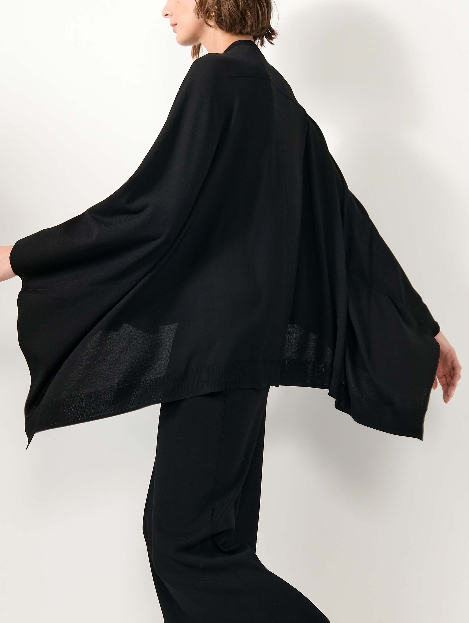Knitted in a soft rayon and silk blend, this sweater features a close-fitting round neckline and an elegant cape-like cut, perfect for layering. Its enveloping volume is designed to be paired with the matching ribbed tube skirt. Available in black or ochre, this cape sweater is finished with our iconic silver-tone metal piercing for a signature Barbara Bui touch.