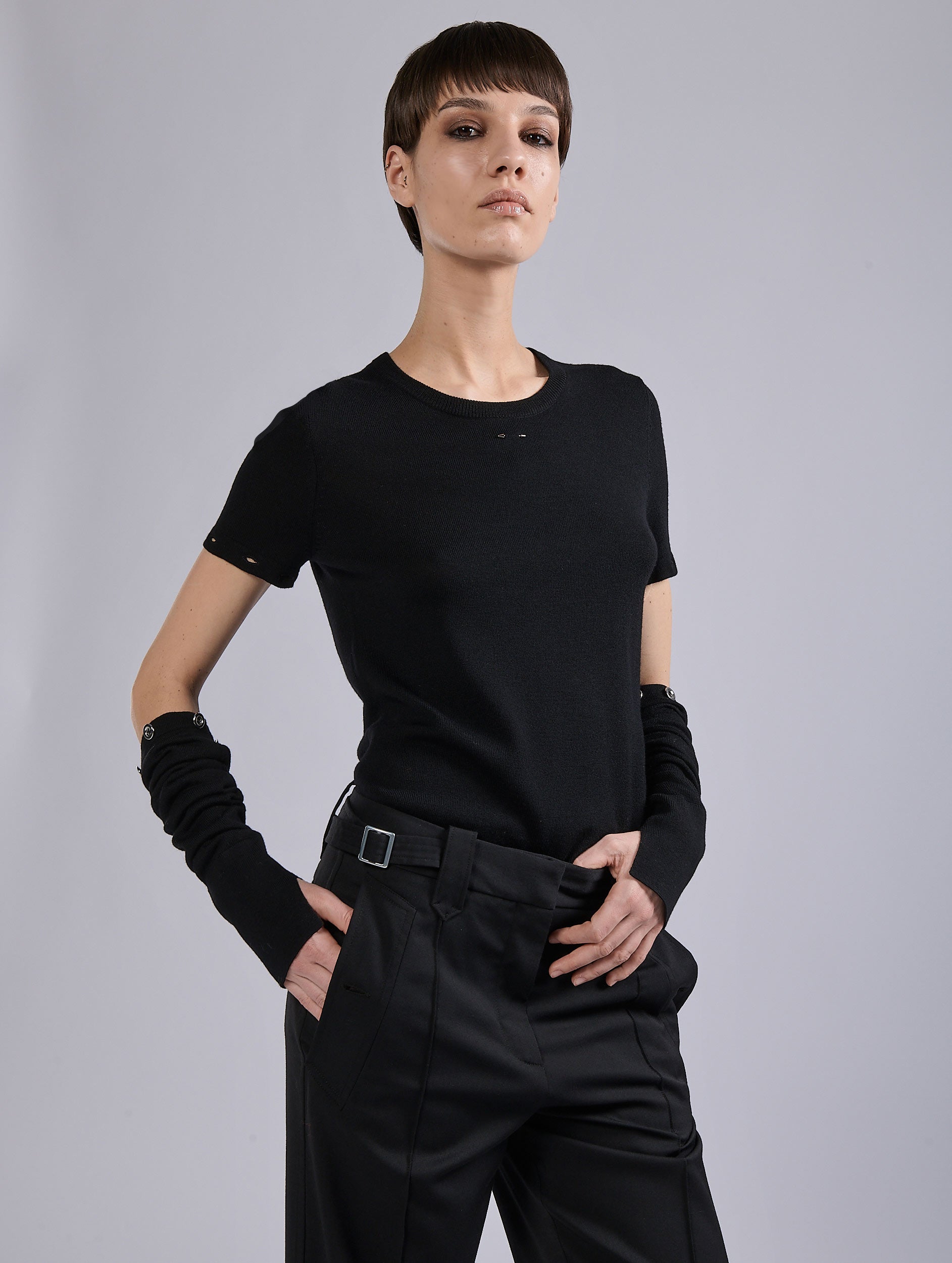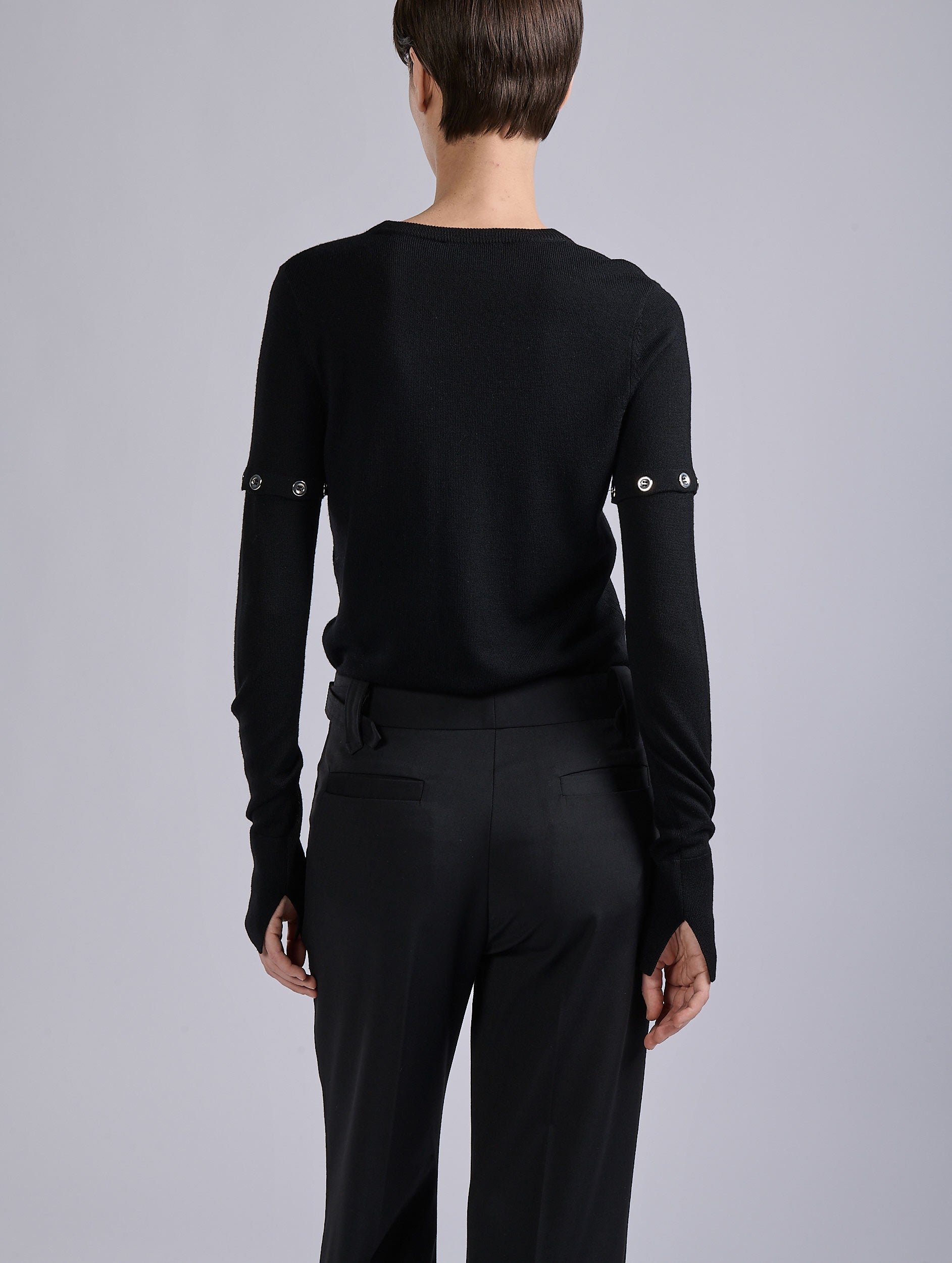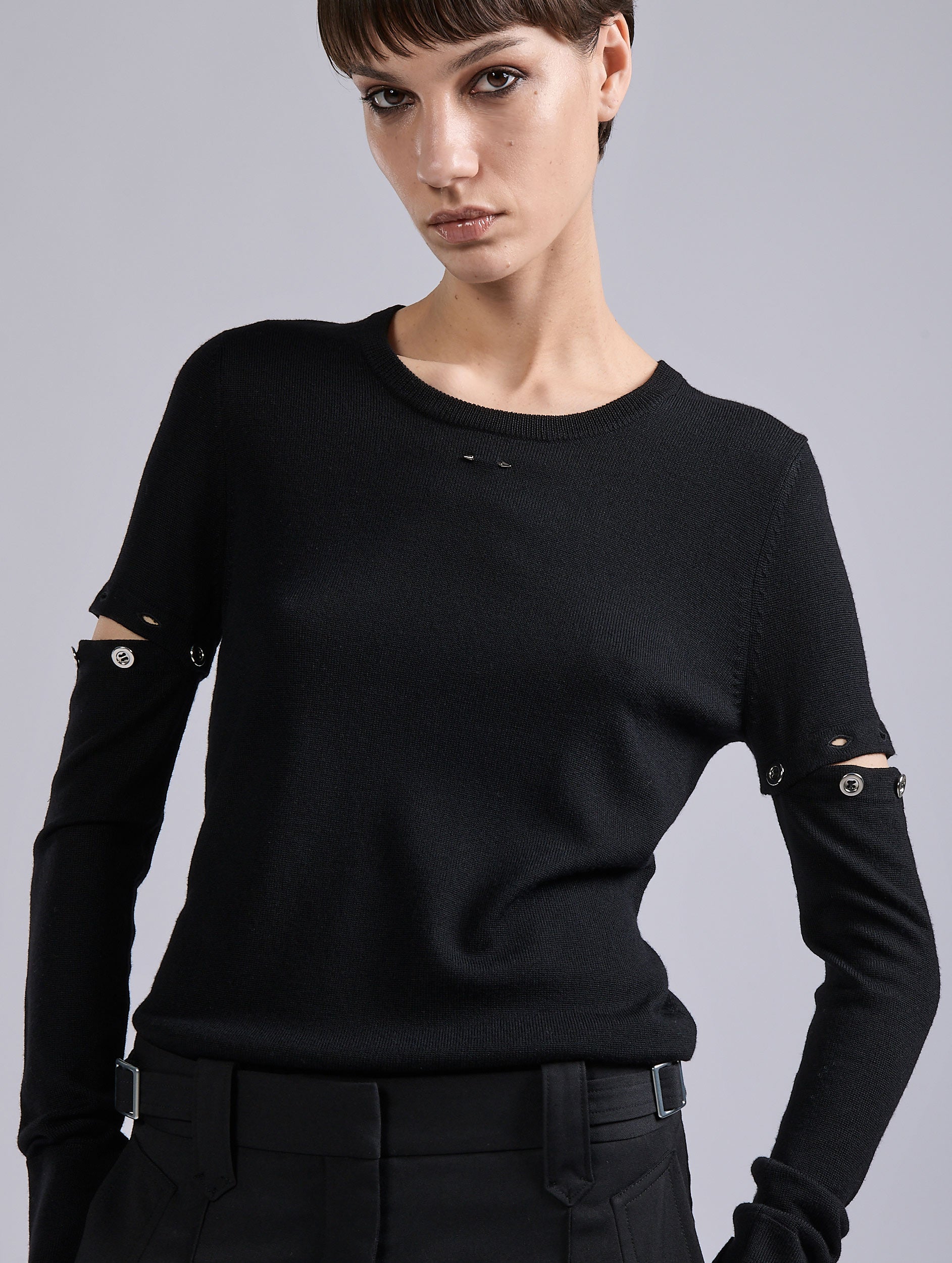If you're looking for a versatile piece that adapts to your mood as well as the weather, this fine merino knit sweater is just the thing. Its armholes feature a row of functional buttons that transform this model into a short-sleeved sweater in the blink of an eye. Its elegantly slit cuff sleeves then metamorphose into a pair of high mitts to complete the look. Accessorized with our silver metal piercing, this round-neck sweater in denim blue or black merino is a classic that's full of surprises!