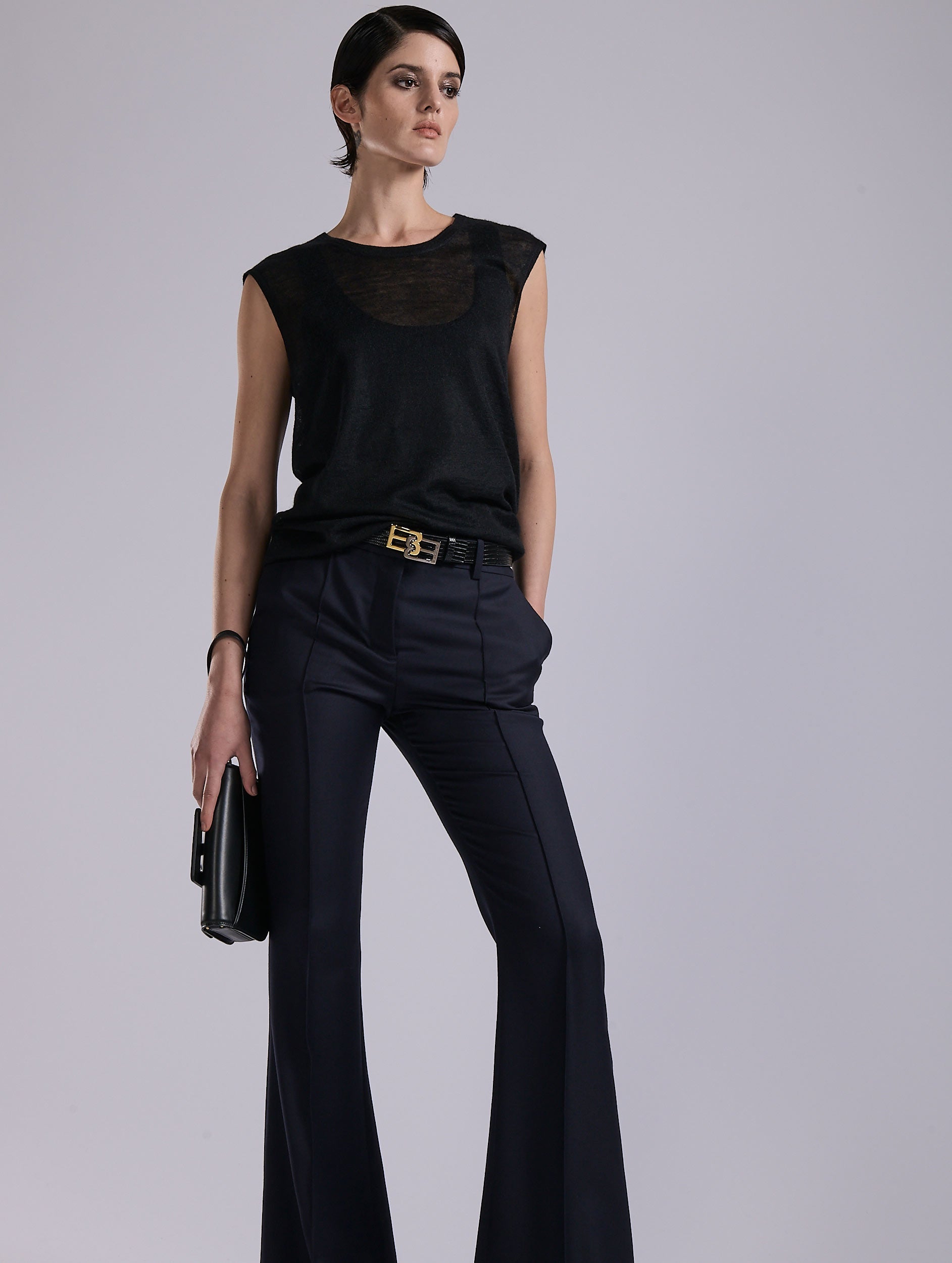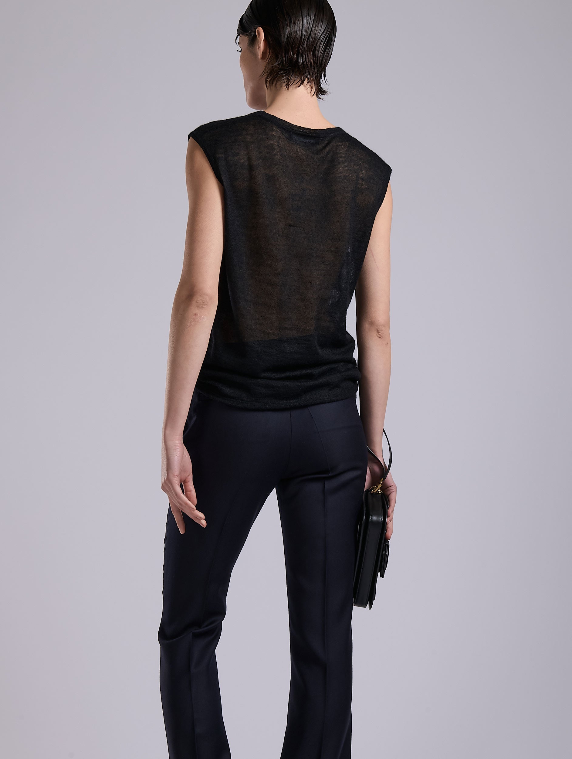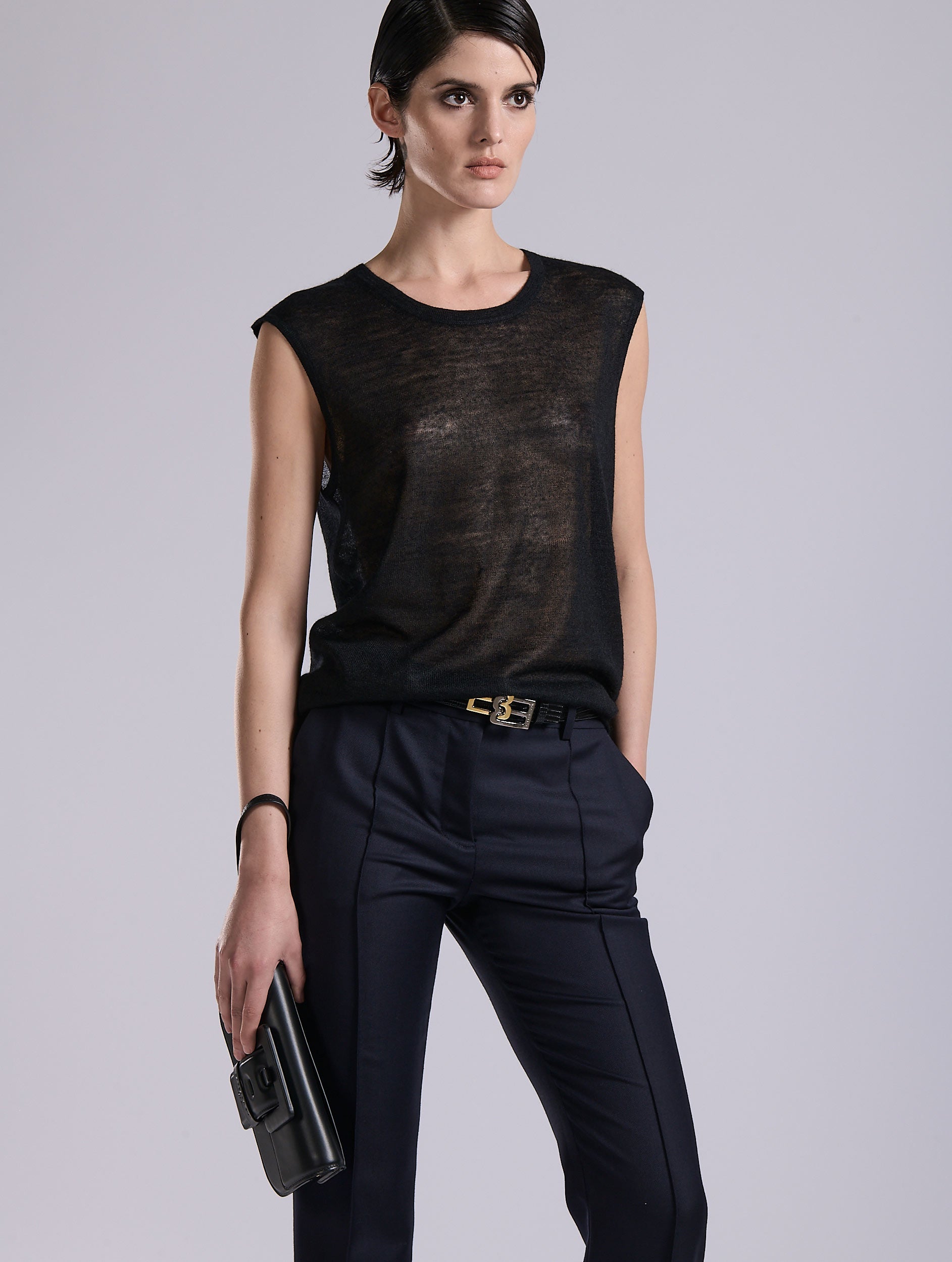 Barbara Bui twists knitwear with this sleeveless top made of voile knit with a cashmere feel. Its lightweight, airy texture caresses the skin, subtly revealing the silhouette through delicate transparency. Available in black, grey, or navy, this second-skin top becomes a sensual and essential piece, to be worn next to the skin or under a light sweater. Its straight cut and scooped neckline ensure lasting comfort, while its minimalist style makes it an indispensable item in the feminine wardrobe, offering both softness and character.