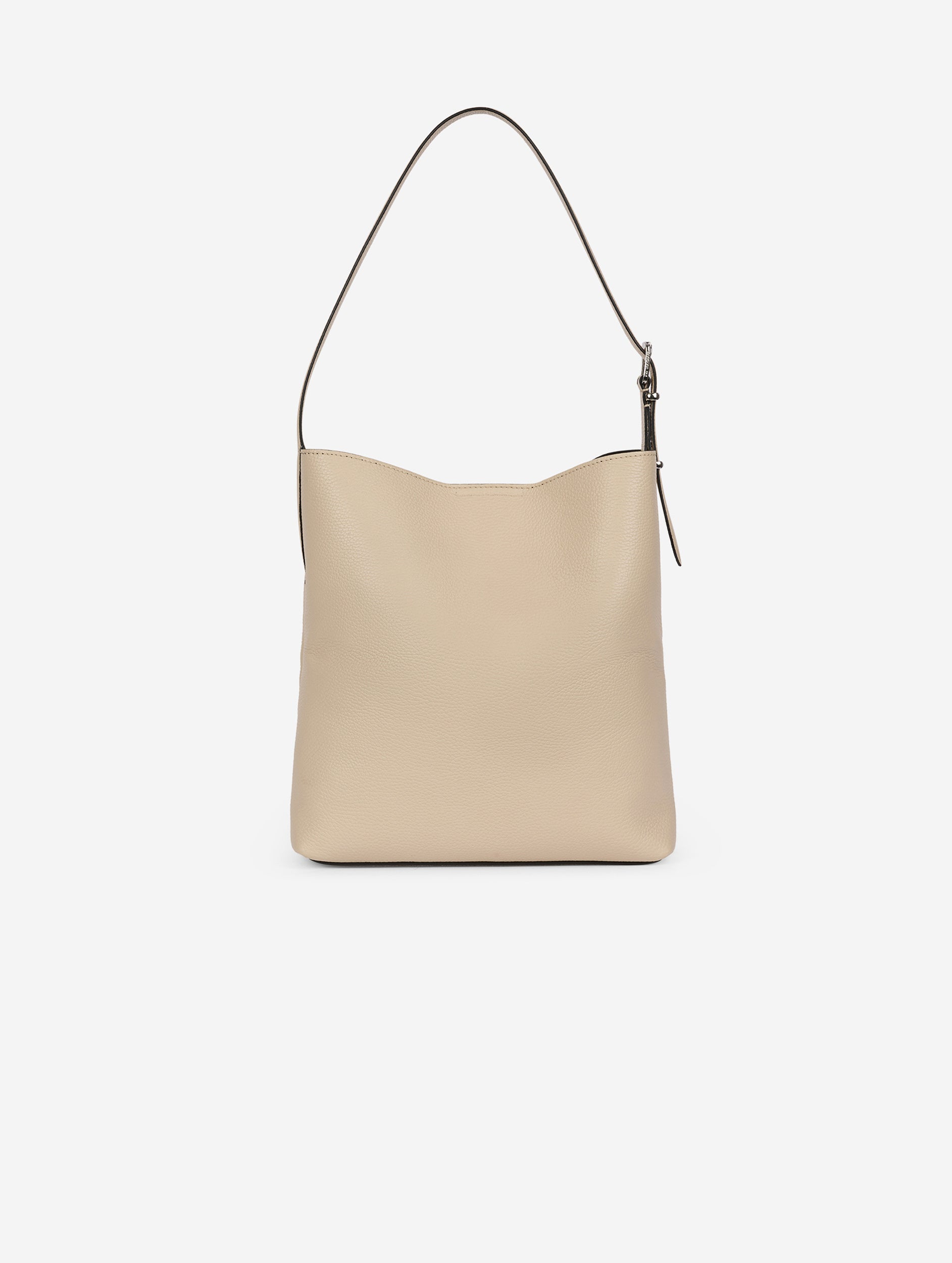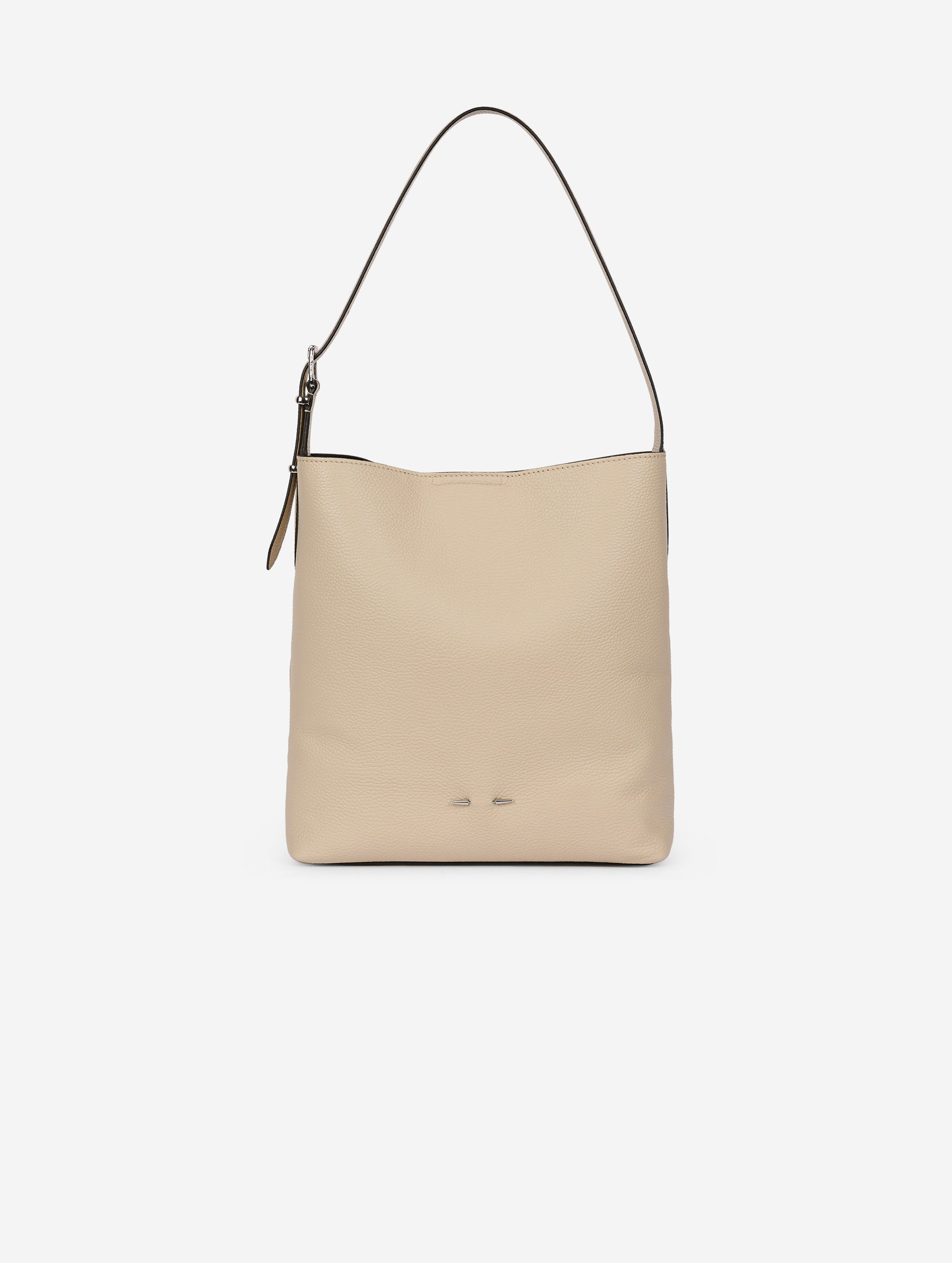 Ivory grained calfskin tote bag bonded to its reversible lining. Front features the house's signature piercing. Adjustable "belt" style shoulder strap, inspired by our men's/women's collection, with a grooved buckle. Magnetic closure and interior with a lobster clasp for attaching our matching pouch or your keys.