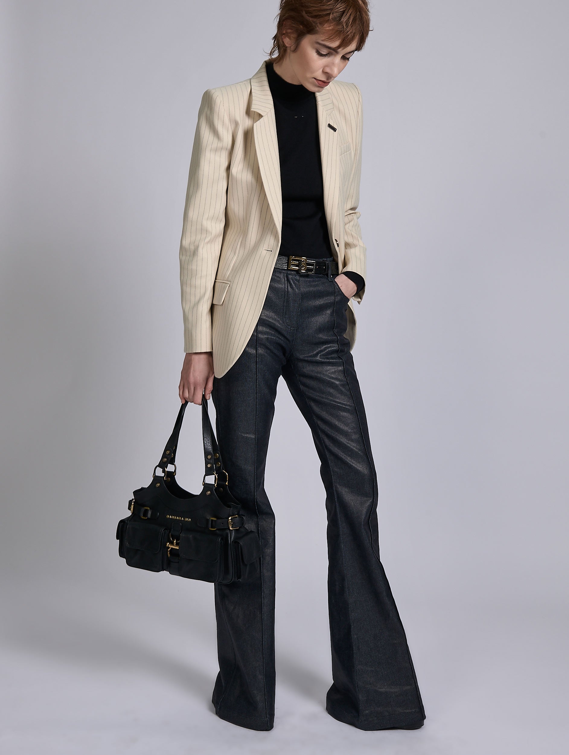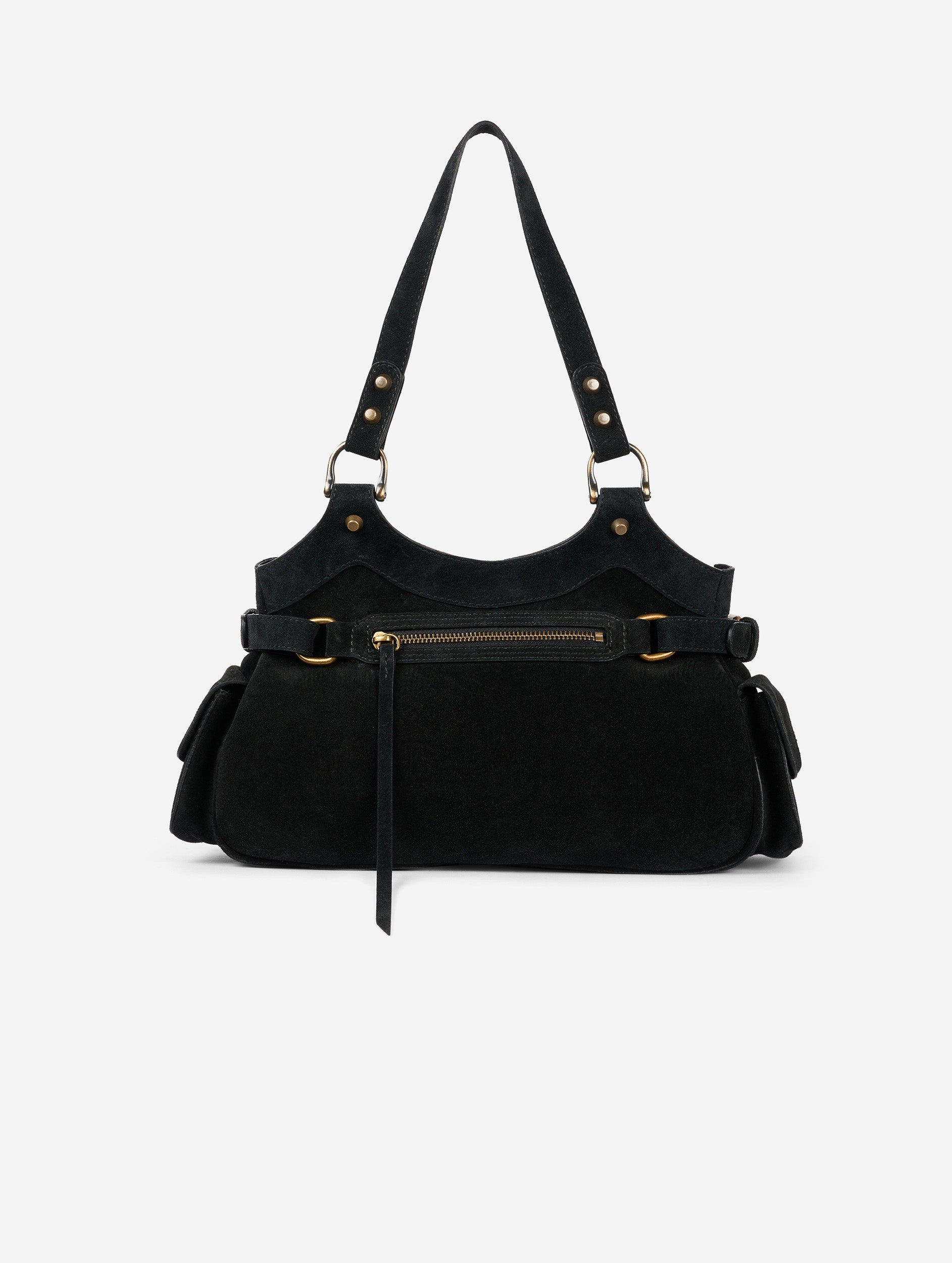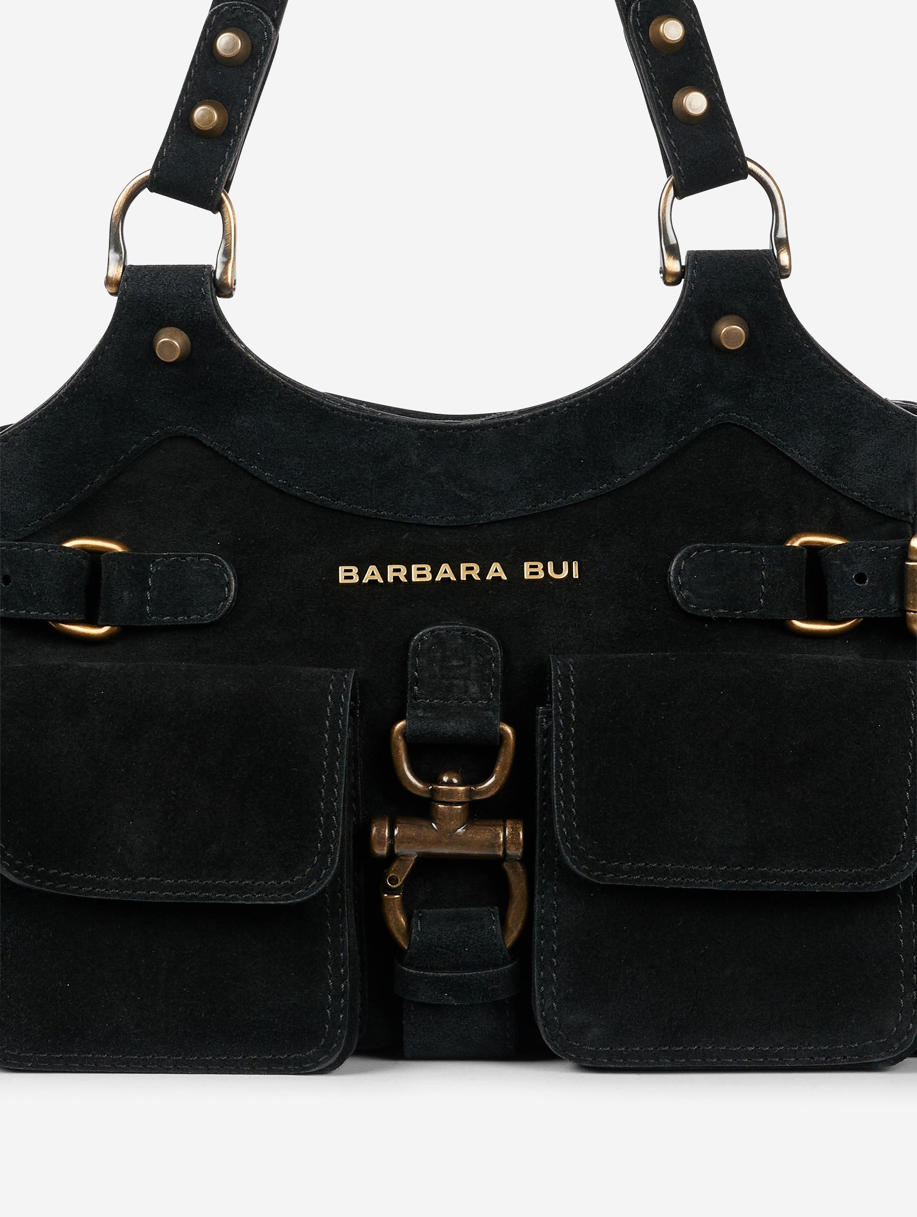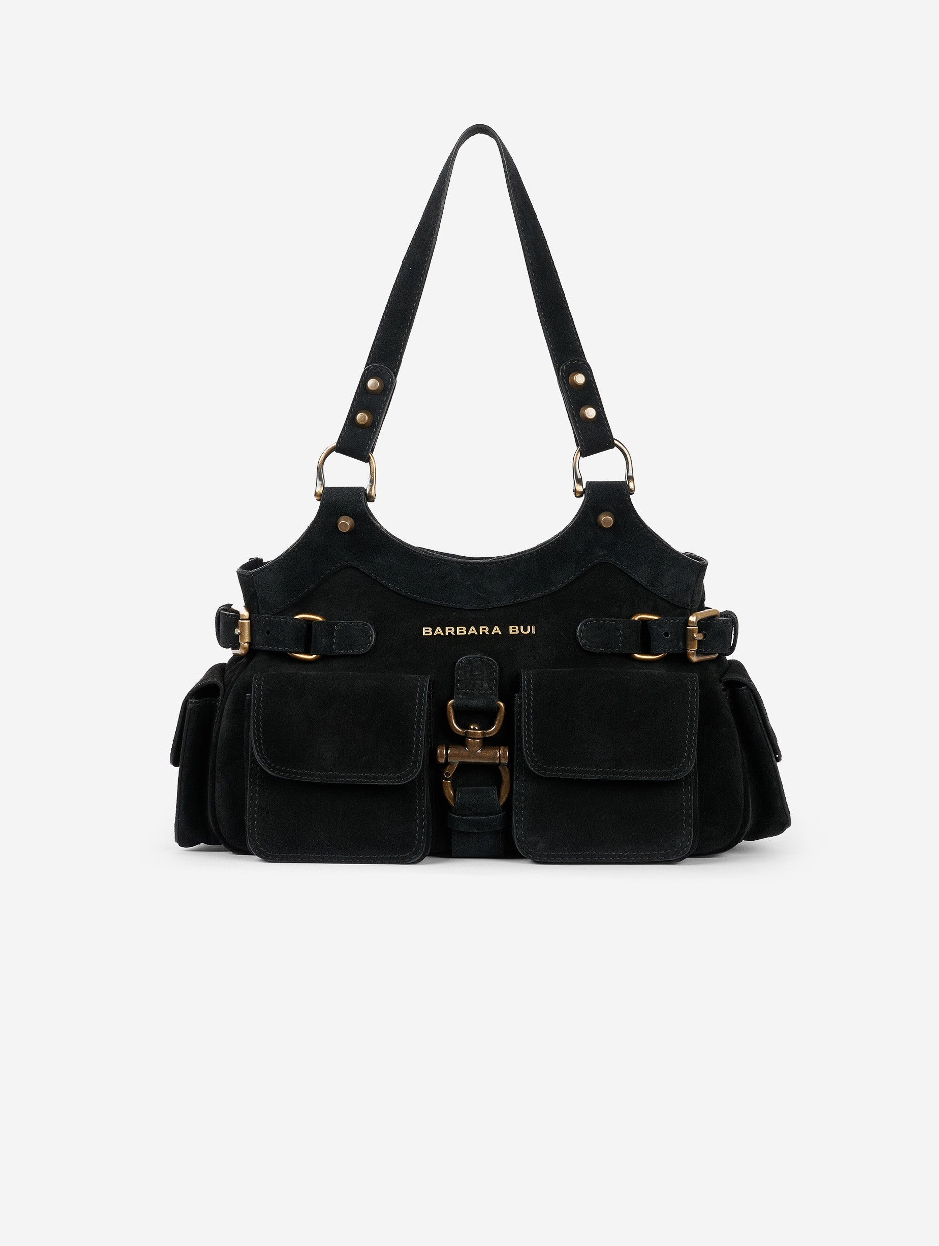 BB-REEDITION multi-pocket bag in black suede calfskin. 4 gusseted pockets with magnetic flaps on the outside, back pocket, zipped inside pocket and center pocket, and 2 compartments with snap closure. Long, articulated handles for shoulder carrying.