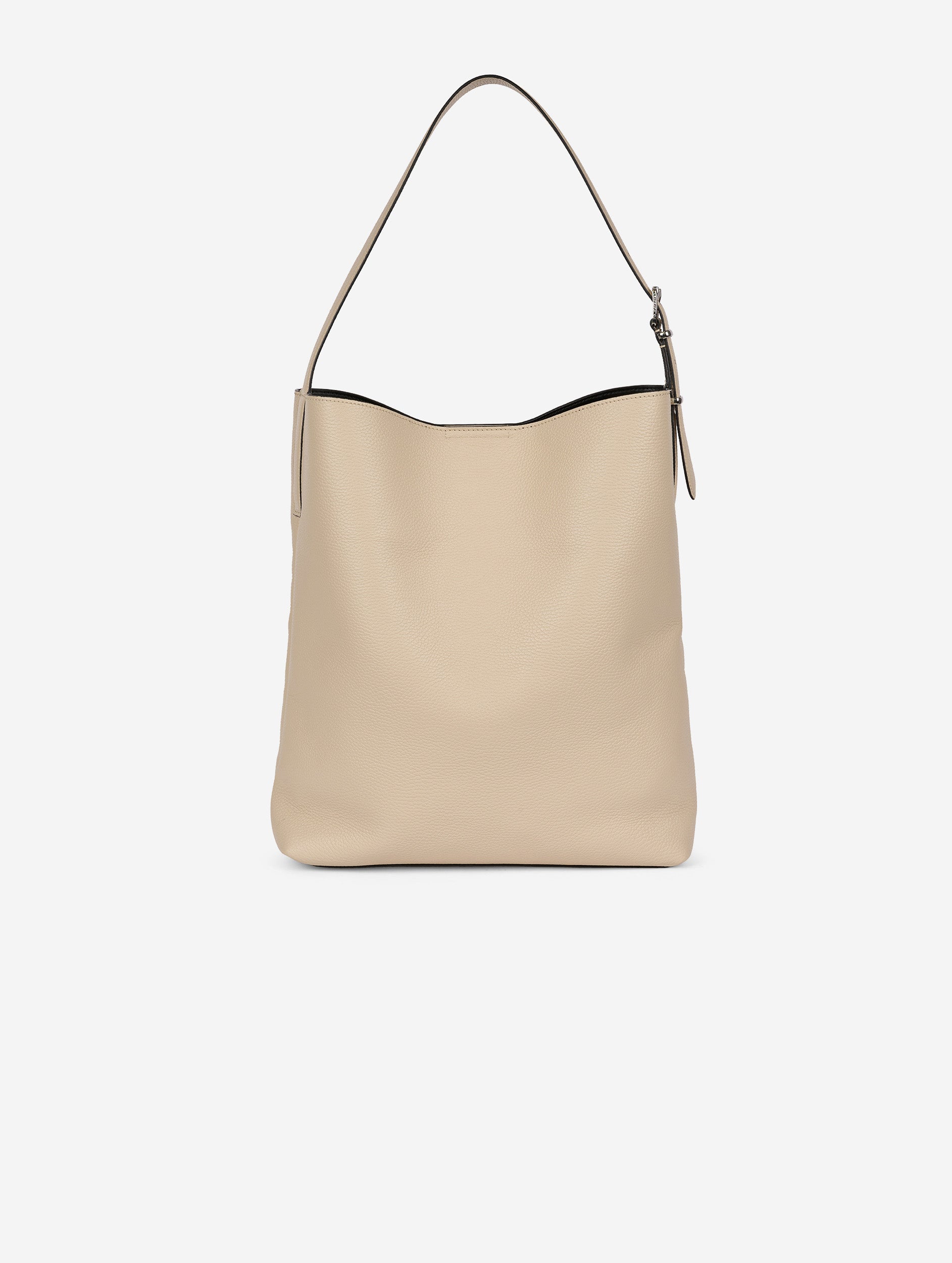Large tote bag in ivory grained calfskin bonded to its reversible lining. The front features the house's signature piercing. The adjustable "belt" style shoulder strap, inspired by our men's/women's collection, has a grooved buckle. It closes magnetically and includes an interior lobster clasp for attaching our matching pouch or your keys.