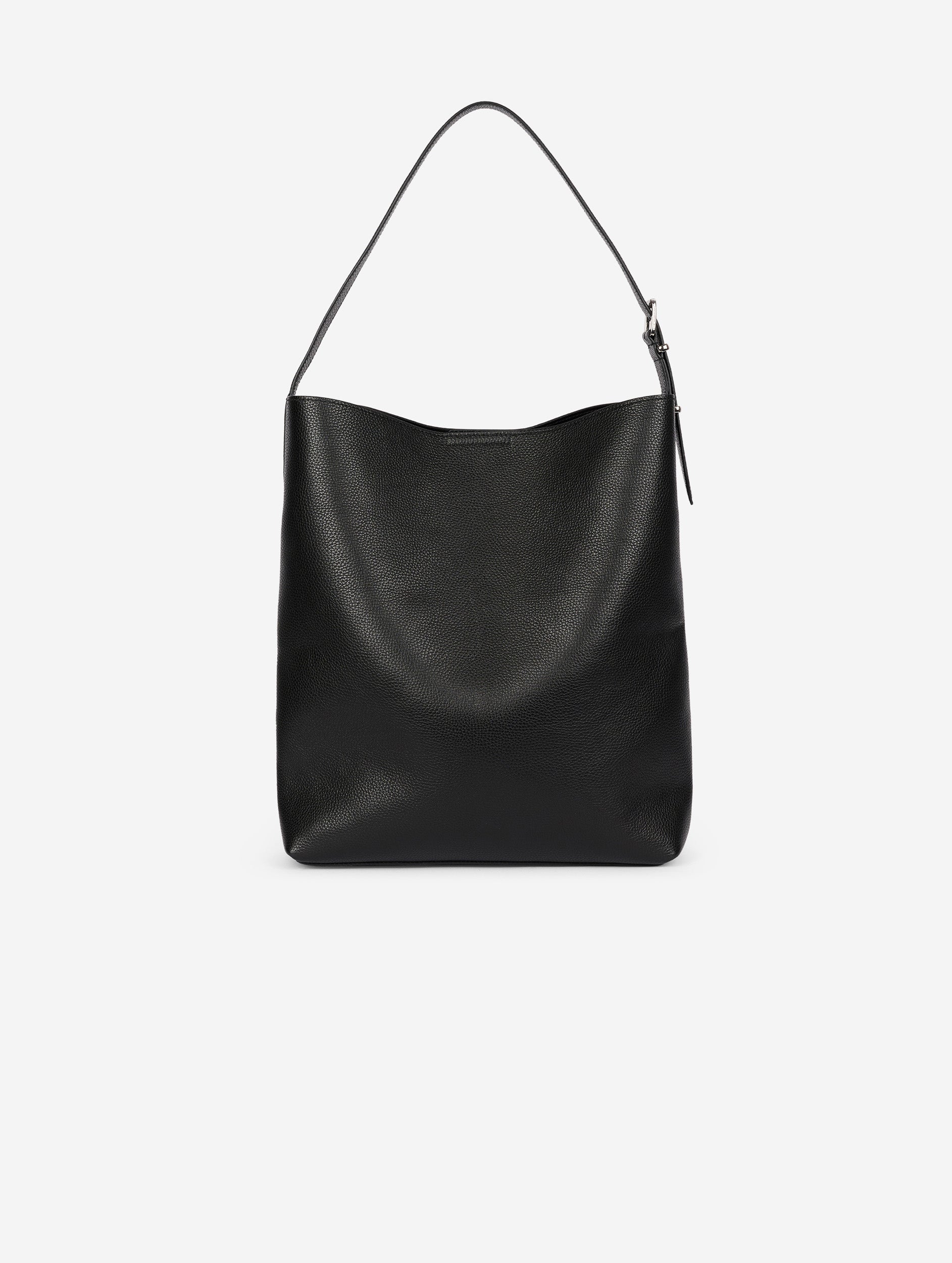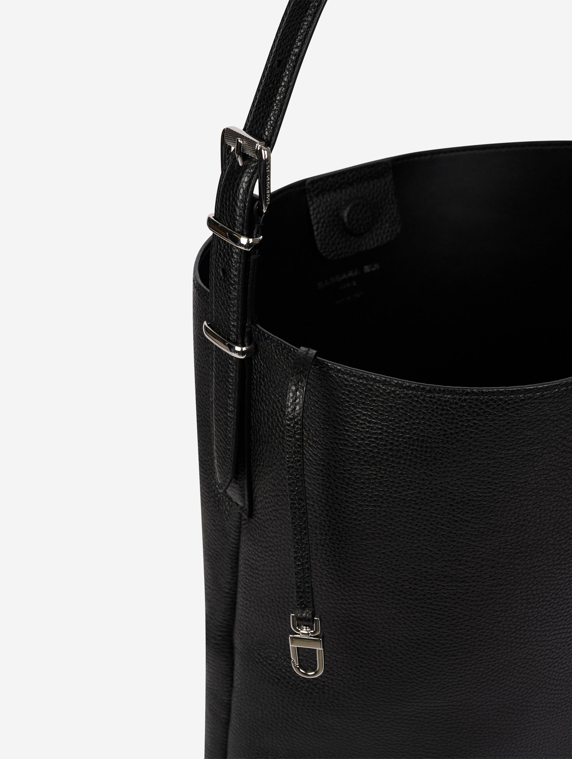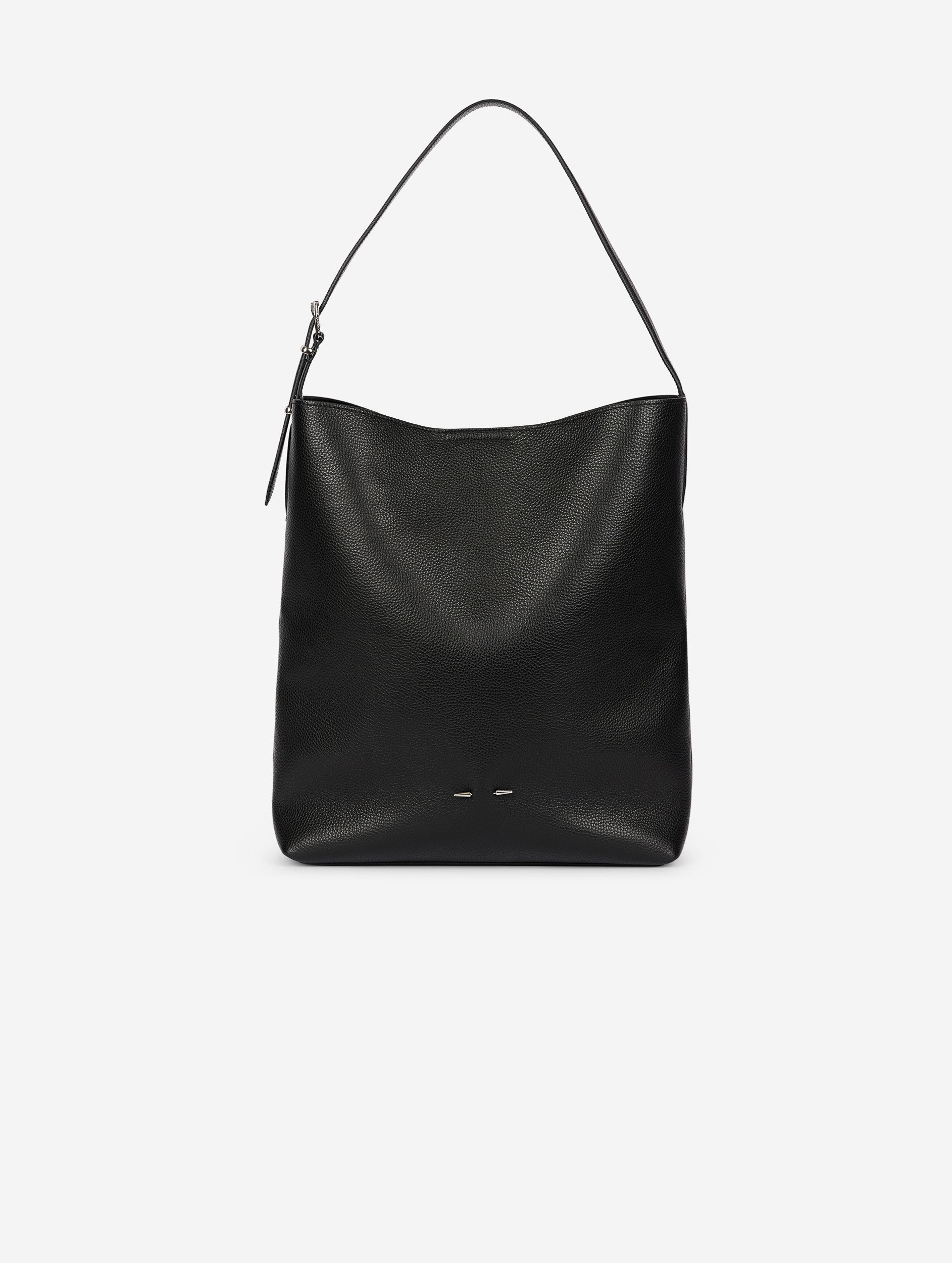 Large tote bag in black grained calfskin bonded to its reversible lining. The front features the brand's signature piercing. The adjustable "belt" style shoulder strap, inspired by our men's/women's collection, has a grooved buckle. It closes magnetically and includes an interior clip for attaching our matching pouch or your keys.
