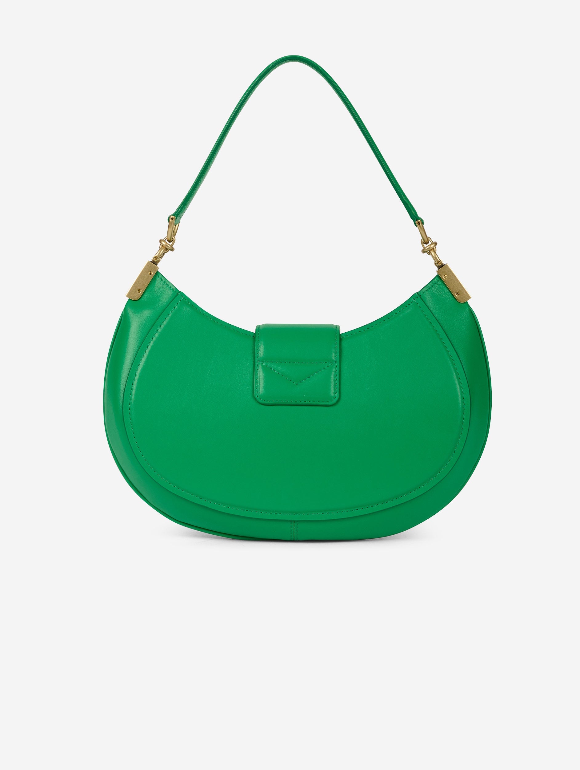 KISS ME bag in smooth prairie green calfskin. Features a top zip, foldover magnetic fastening flap and the signature large leather buckle from our "ME" line of bags. Can be carried by hand or over the shoulder. Inside patch pocket. Height: 20 cm / Length: 28 cm / Depth: 8 cm.