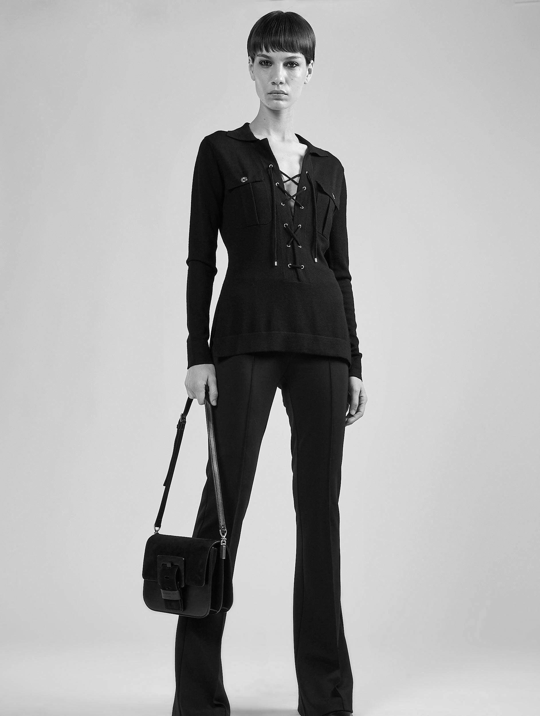 The saharienne, a women's wardrobe icon usually reserved for warm weather, is reinvented in a luxurious merino knit version for warm, comfortable wear. This saharienne sweater features lacing that can be worn more or less half-open thanks to its drawstrings, and two patch pockets closed by elegant buttons, black for the denim blue model or metallic silver for the black version. With its slim fit and adjustable neckline, this saharienne sweater is a feminine asset for everyday wear, paired with jeans or our bootleg shorts in milano for a sculptural silhouette.