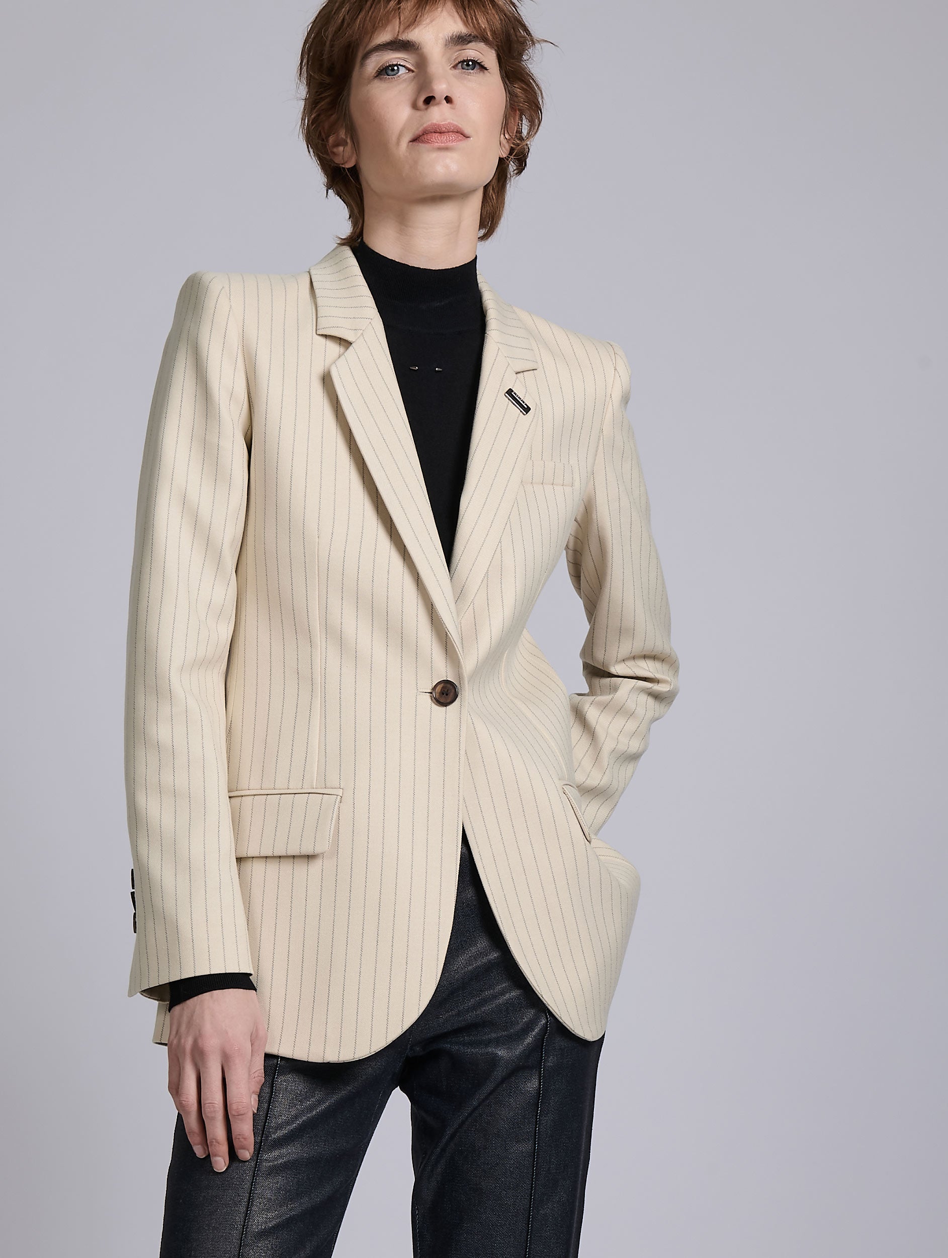 The Barbara Bui Costume line celebrates the house's tailoring expertise. This one-button jacket, inspired by men's pinstripe suits, features all the iconic finishes of the sartorial wardrobe. Our signature removable piercing and the signature silver metal Milanese loop on the collar add a feminine rock touch to this suit jacket. Its slim fit and tennis stripes flatter the silhouette, an effect supported by the cut of our coordinating bootleg trousers.