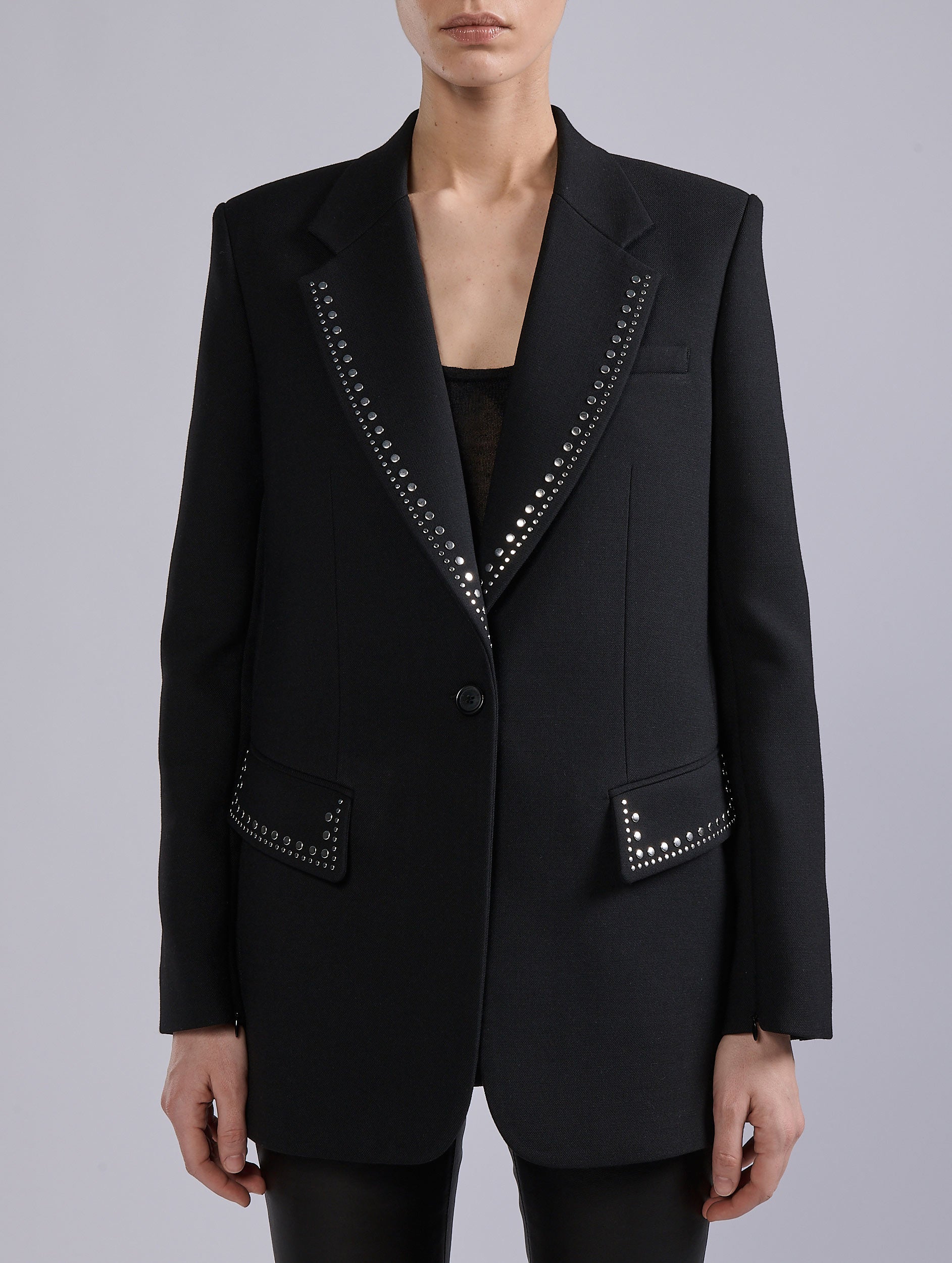 Ideal for adding a rock'n'roll touch to any outfit, this suit jacket features a collar and flaps embellished with silver metal studs. A true jewel of a garment, this jacket has been crafted in a comfortable double gabardine. A zip along the cuffs invites you to wear it with open sleeves, like a revisited cape. The impeccable sharp-and-cut cut of this piece makes it an equally precious ally for dressing up an everyday outfit or rising to the challenge of a sophisticated, daring evening look.
