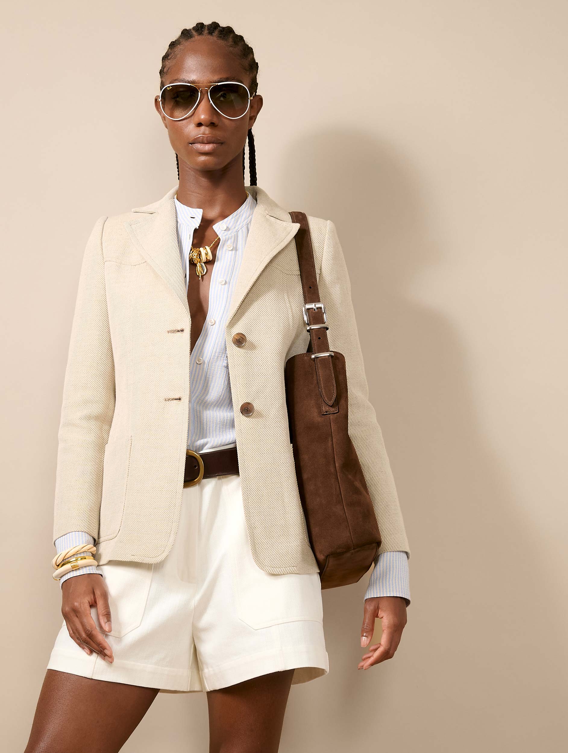 This blazer is crafted from linen drill, a twill fabric with a diagonal weave that gives it structure and texture. Historically associated with workwear, this weave is combined with the codes of Parisian couture to create a timeless jacket in a luminous sand hue. Seaming, patch pockets, textural effects, and the high placement of the two buttons—a detail that emphasizes a masculine influence—subtly recall denim, a source of inspiration reinterpreted through a feminine and refined approach. With its fitted, distinctly 1970s silhouette, this jacket pairs perfectly with flared jeans or shorts for an urban summer look.