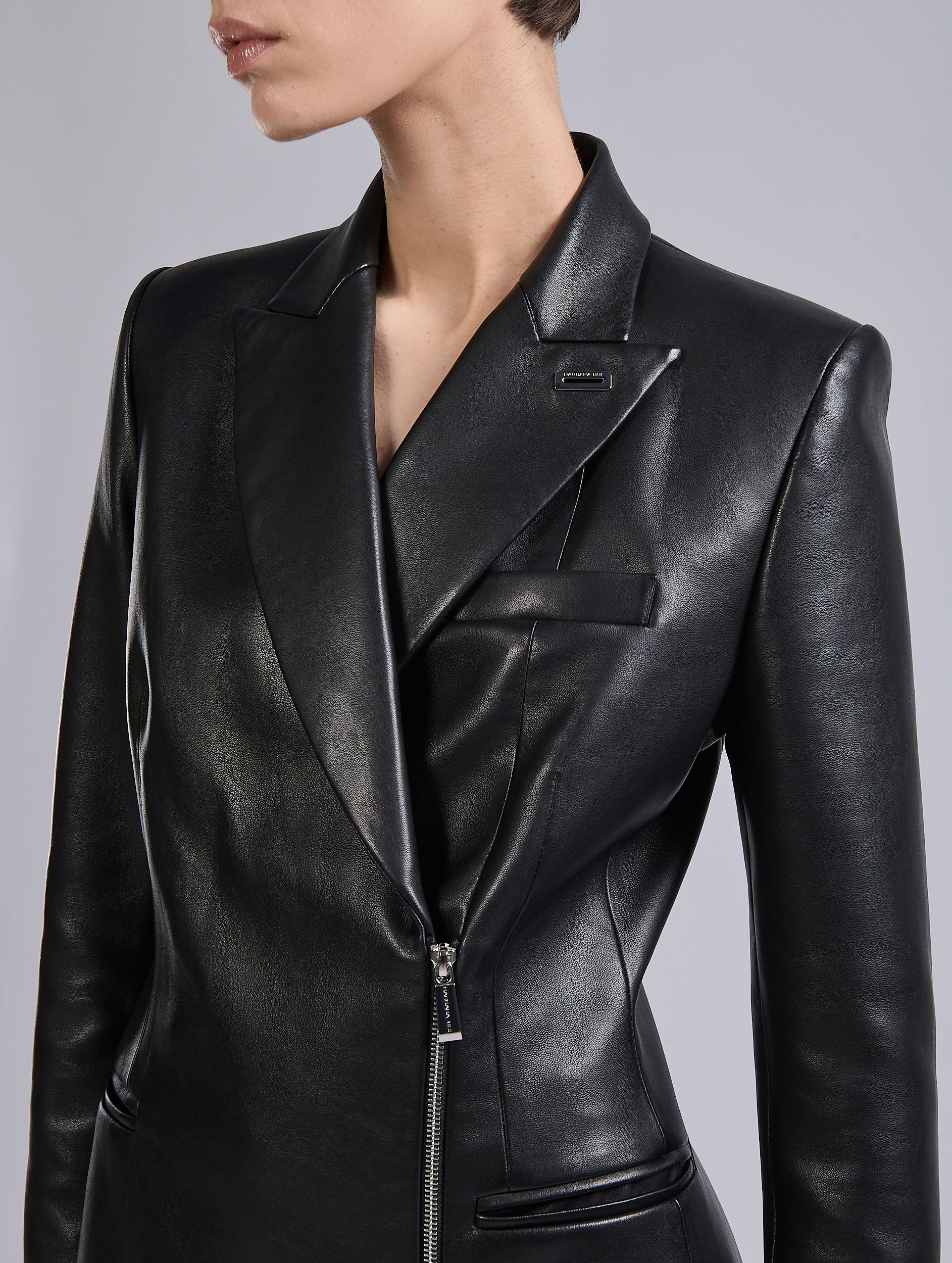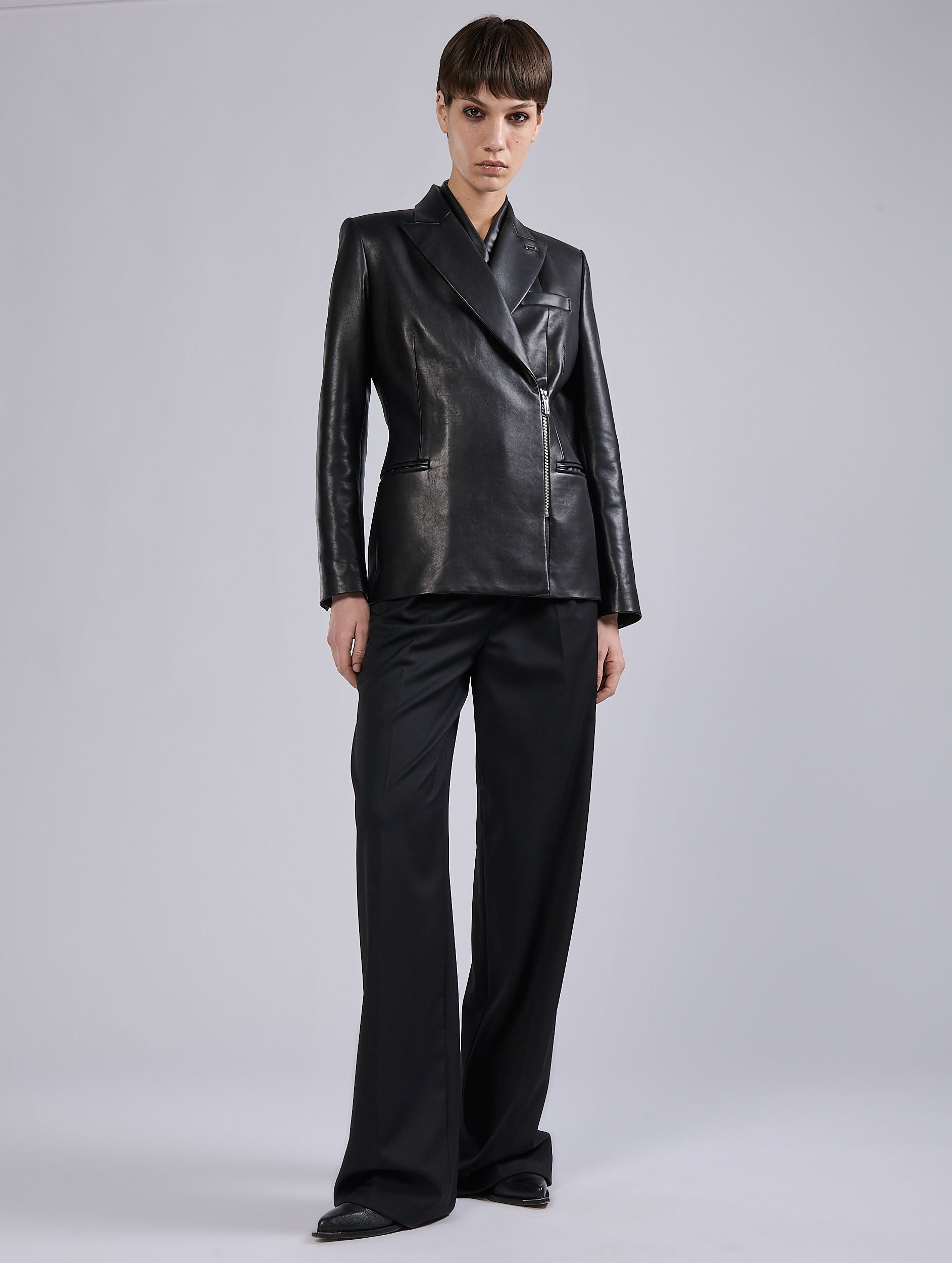 Barbara Bui's rock DNA is combined here with sartorial savoir-faire: this jacket adopts all the codes of tailoring in a version in black plongé leather, the House's preferred material. Embellished with a straight zip and a wide notched collar, this jacket is the perfect synthesis between a blazer and a biker jacket. Cool and sophisticated, this leather jacket is adorned with a silver-tone metal Milanese loop on the tuxedo collar, a jewel-like detail reminiscent of the removable silver-tone metal piercing accessorizing the back of this piece.