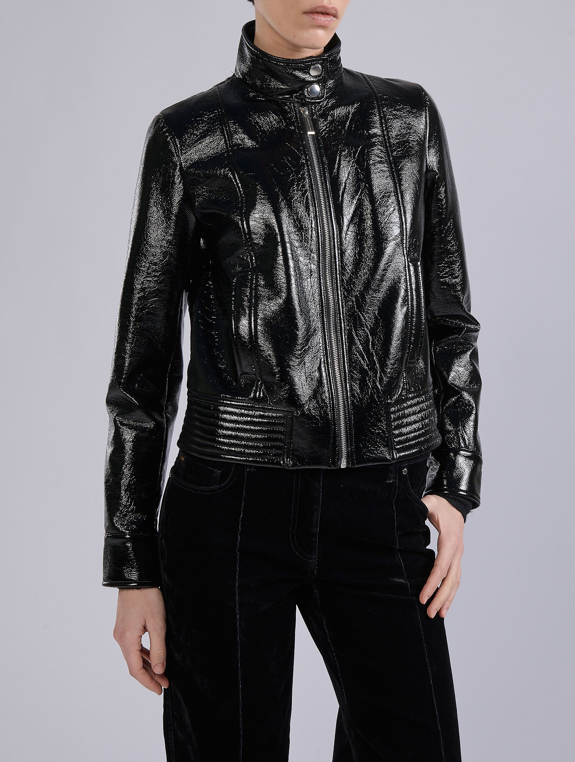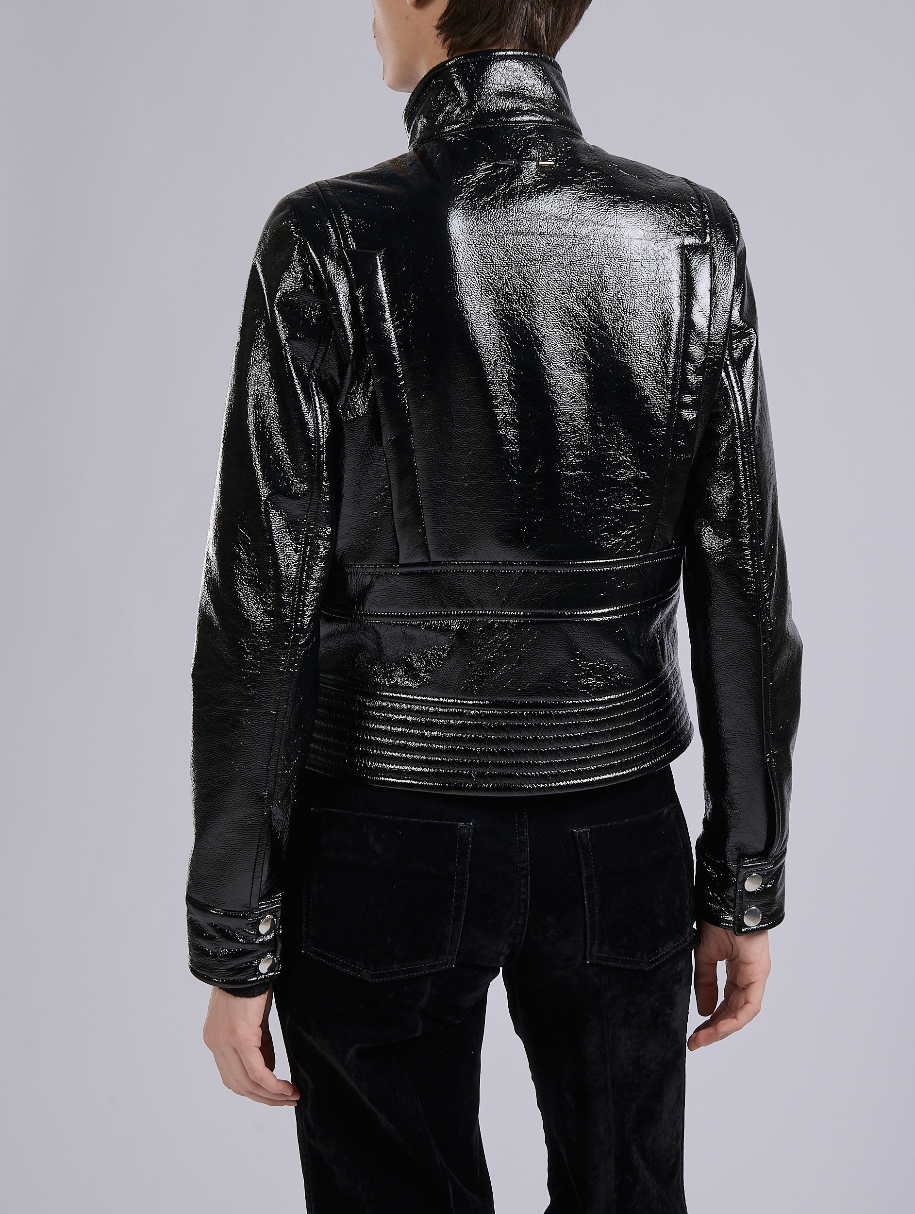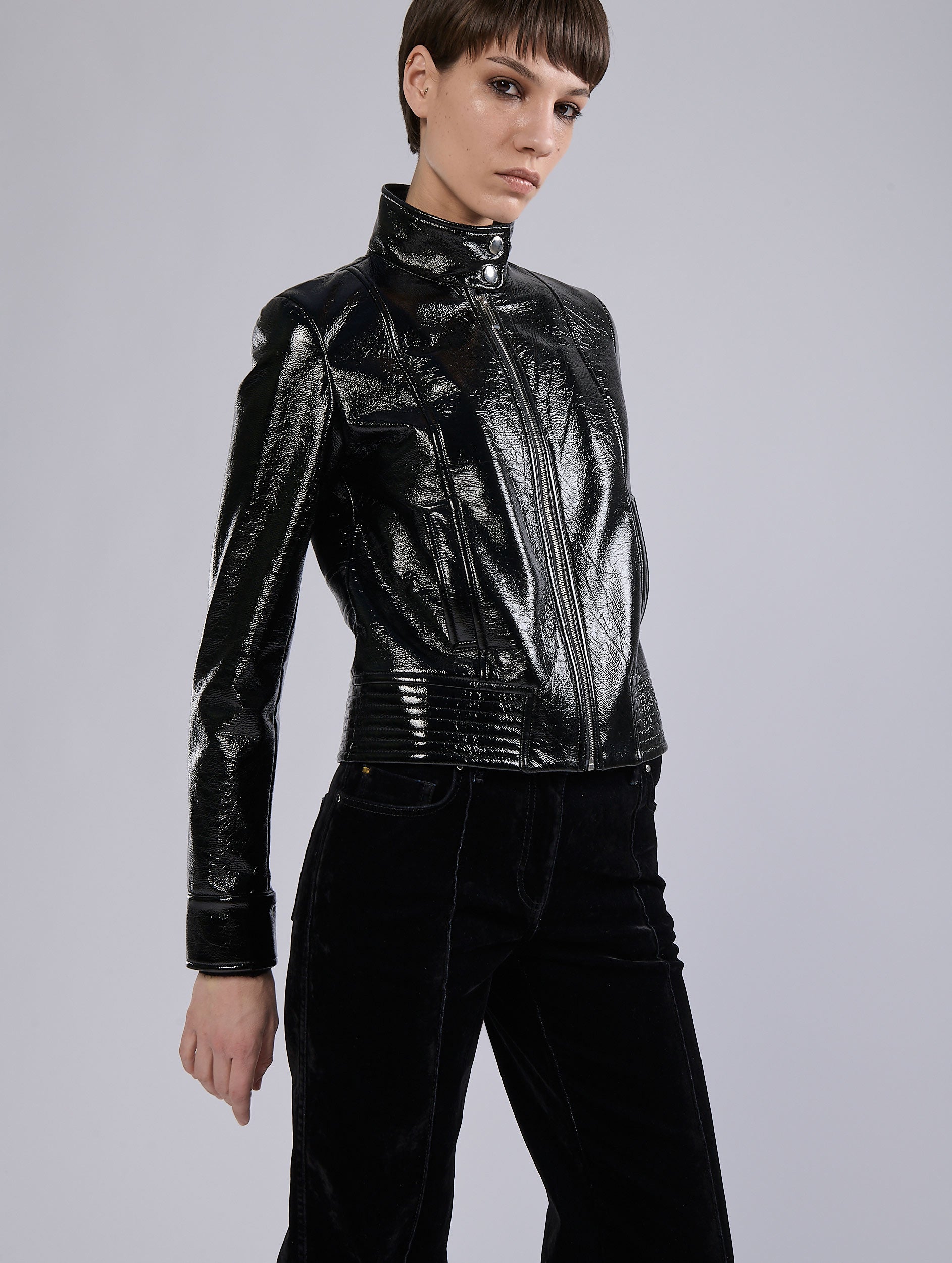 This singular biker jacket instantly elevates the look. Usually offered in leather, this deep black women's jacket is imagined by Barbara Bui in a Naplack effect, giving it a welcome shine for day or evening. Its short volume and pronounced shoulders enhance the silhouette. Cuffs and collar are embellished with a double set of snap buttons for structured, dynamic wear.