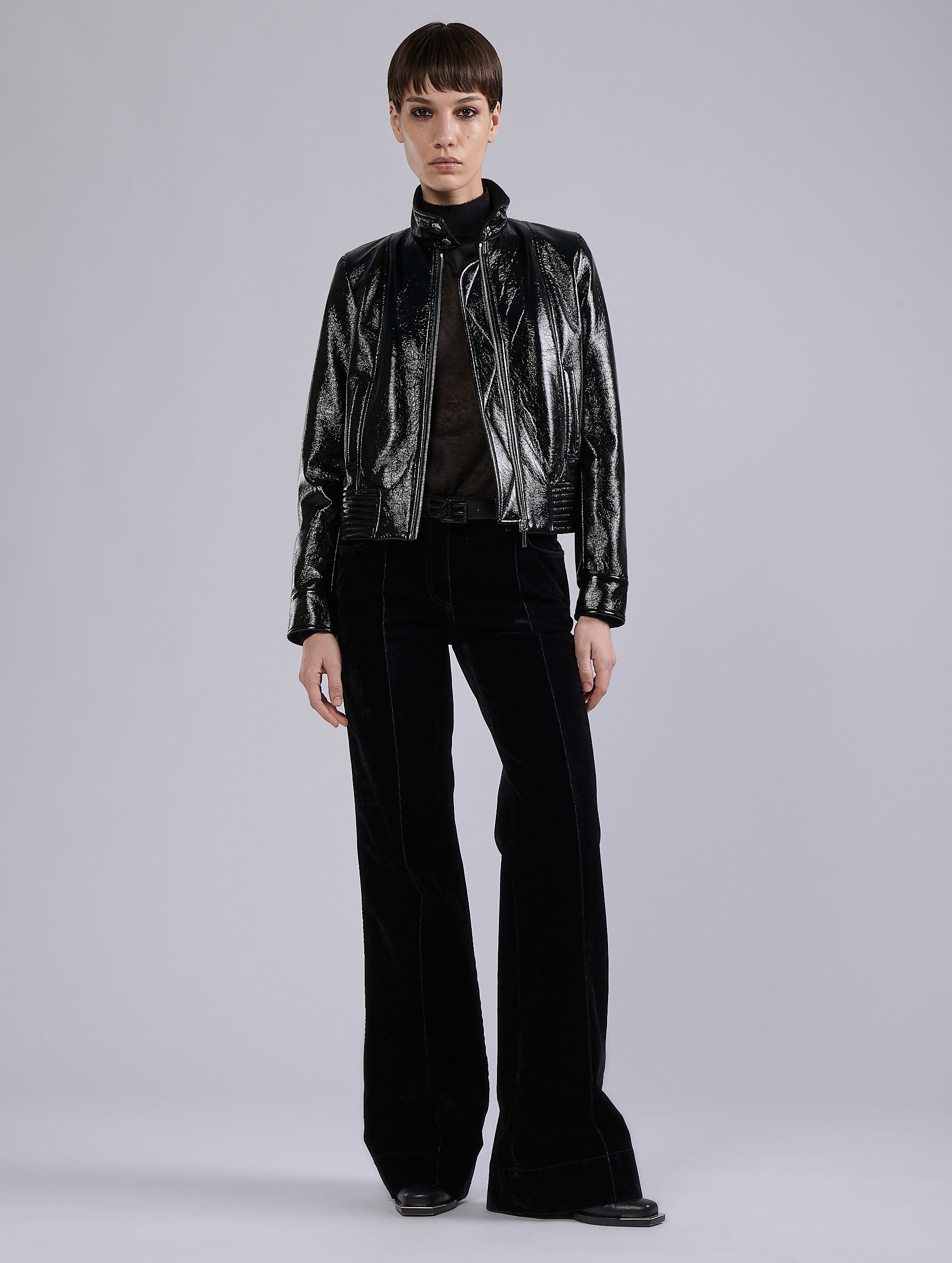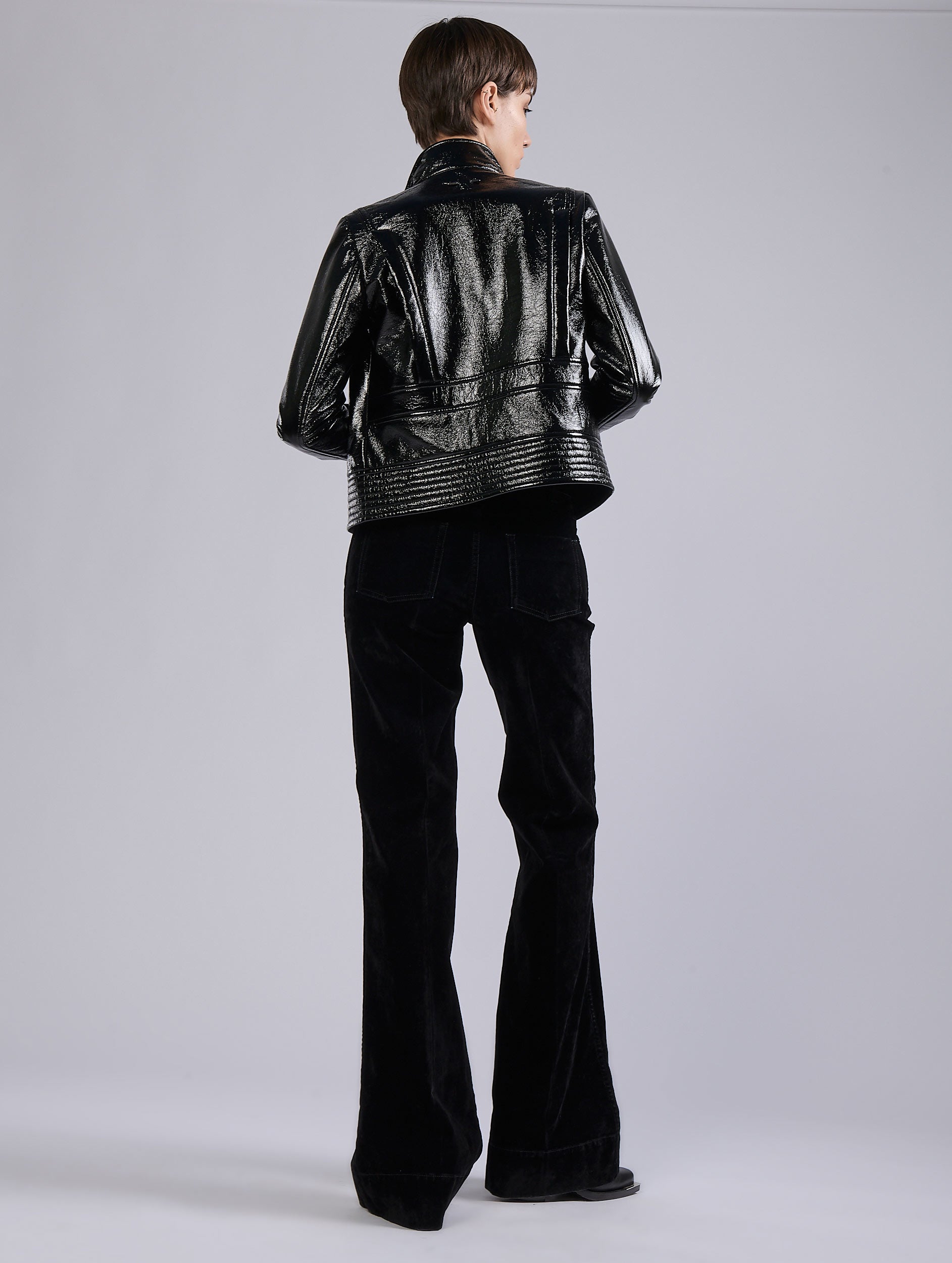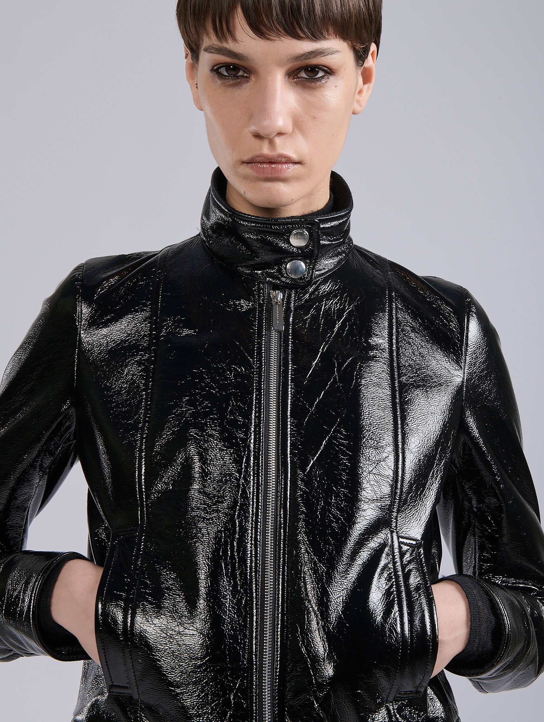 This singular biker jacket instantly elevates the look. Usually offered in leather, this deep black women's jacket is imagined by Barbara Bui in a Naplack effect, giving it a welcome shine for day or evening. Its short volume and pronounced shoulders enhance the silhouette. Cuffs and collar are embellished with a double set of snap buttons for structured, dynamic wear.