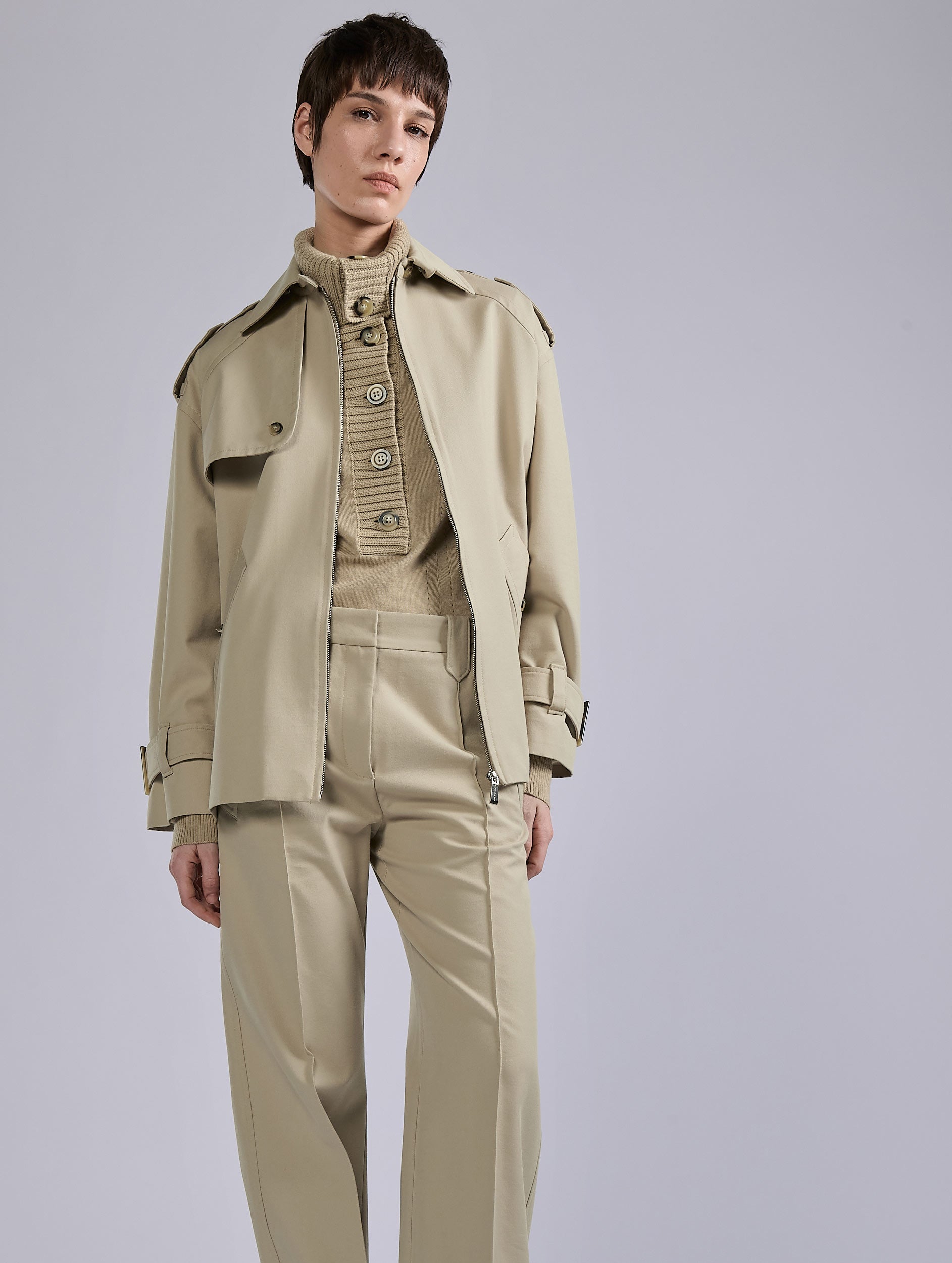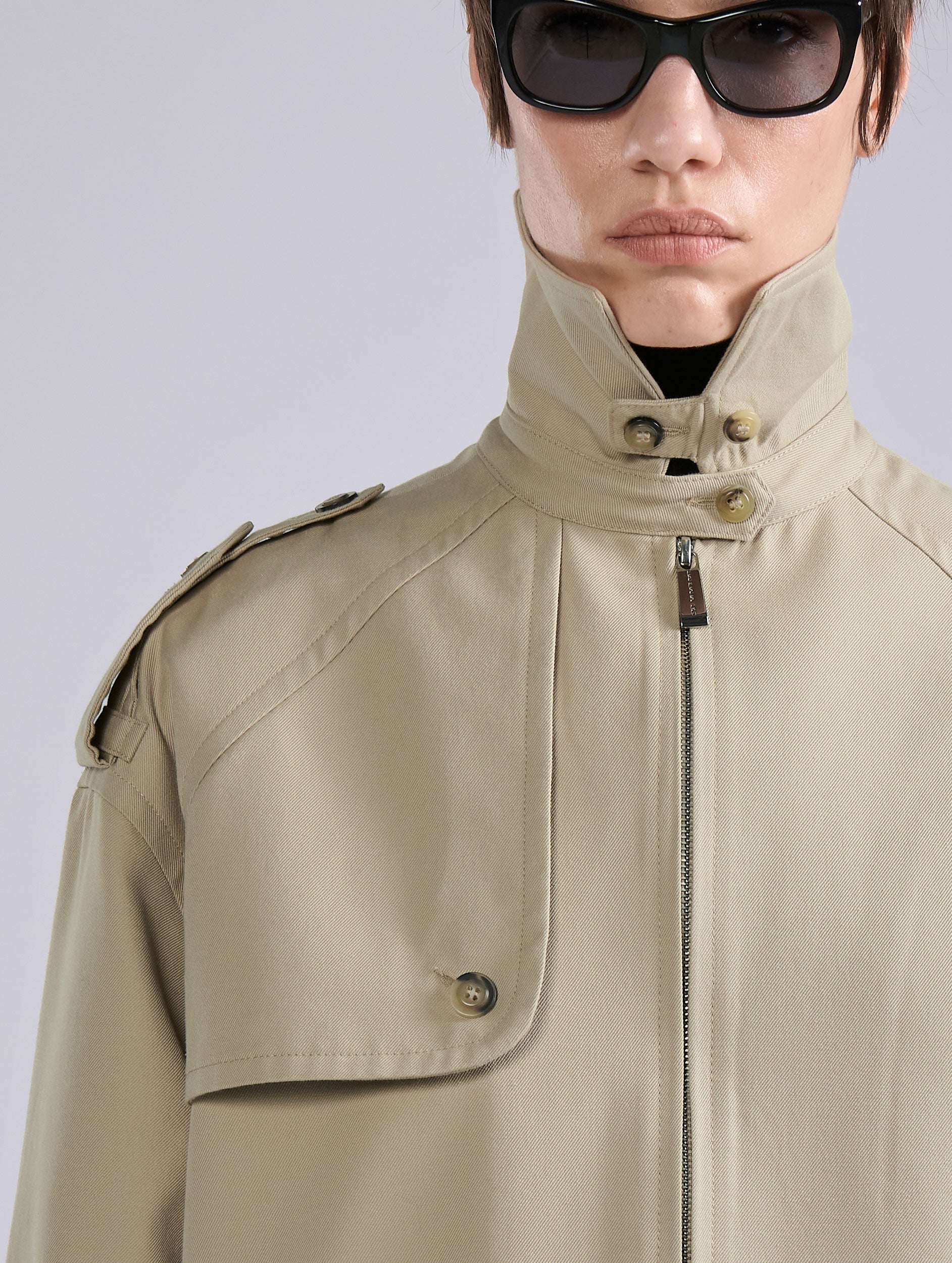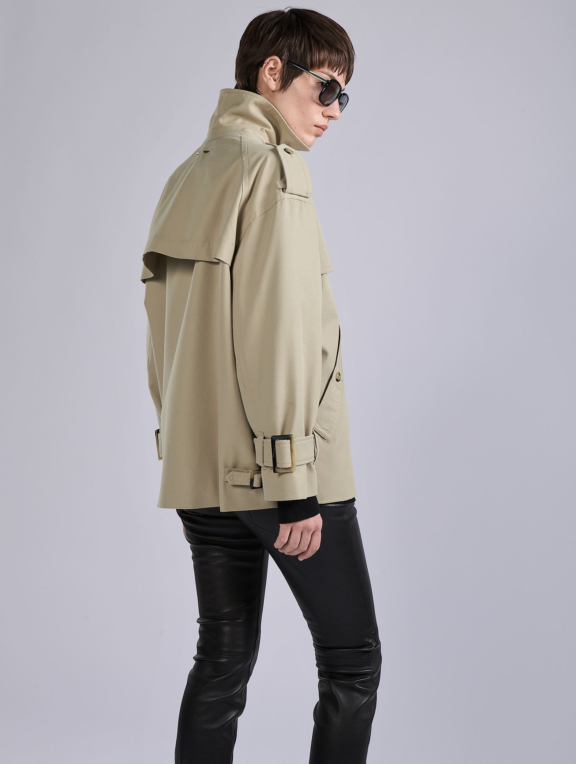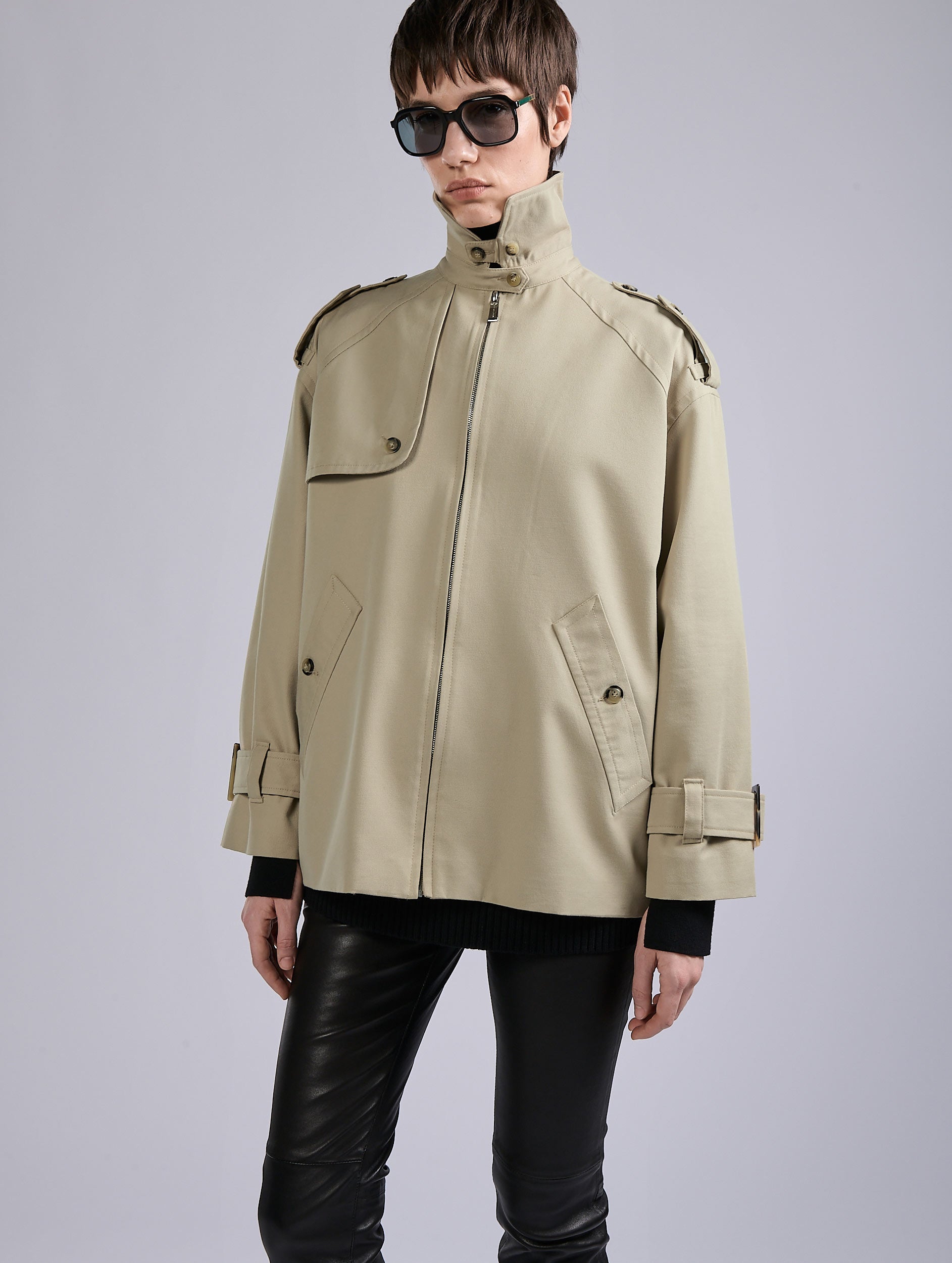 This straight-cut, sport-chic jacket revisits the trench coat codes in a contemporary, shortened version. Made from sand-colored cotton gabardine with a structured fit, it retains the classic utilitarian details: structured epaulette, shoulder tabs with double press-stud buttons, adjustable cuff straps, and a collar that can be raised with the help of strap buttons. Its slightly oversized volume brings comfort and modernity to an everyday silhouette. Decorated with horn-style buttons matching its timeless color and our signature removable piercing, this women’s jacket, designed for mid-season, plays with contrasts between functional lines and refined finishes. Wear it open over a casual outfit or closed to fully appreciate its finishes.