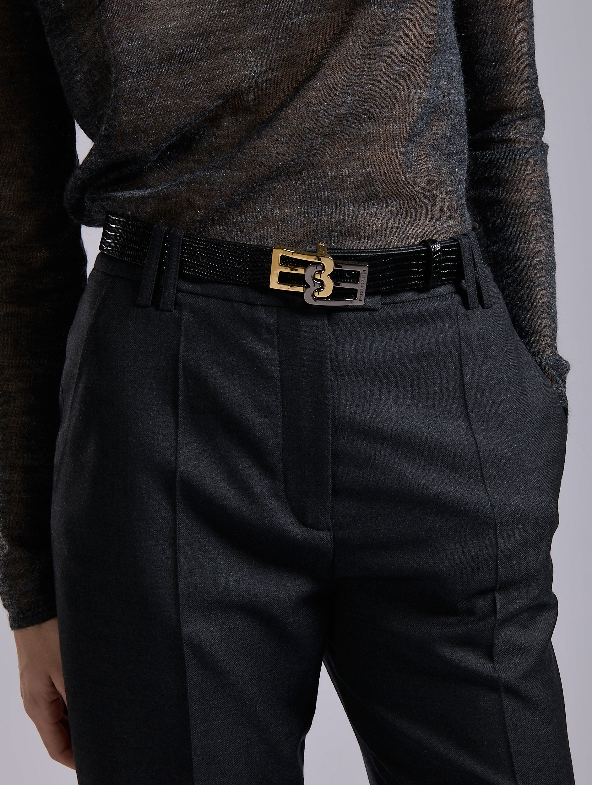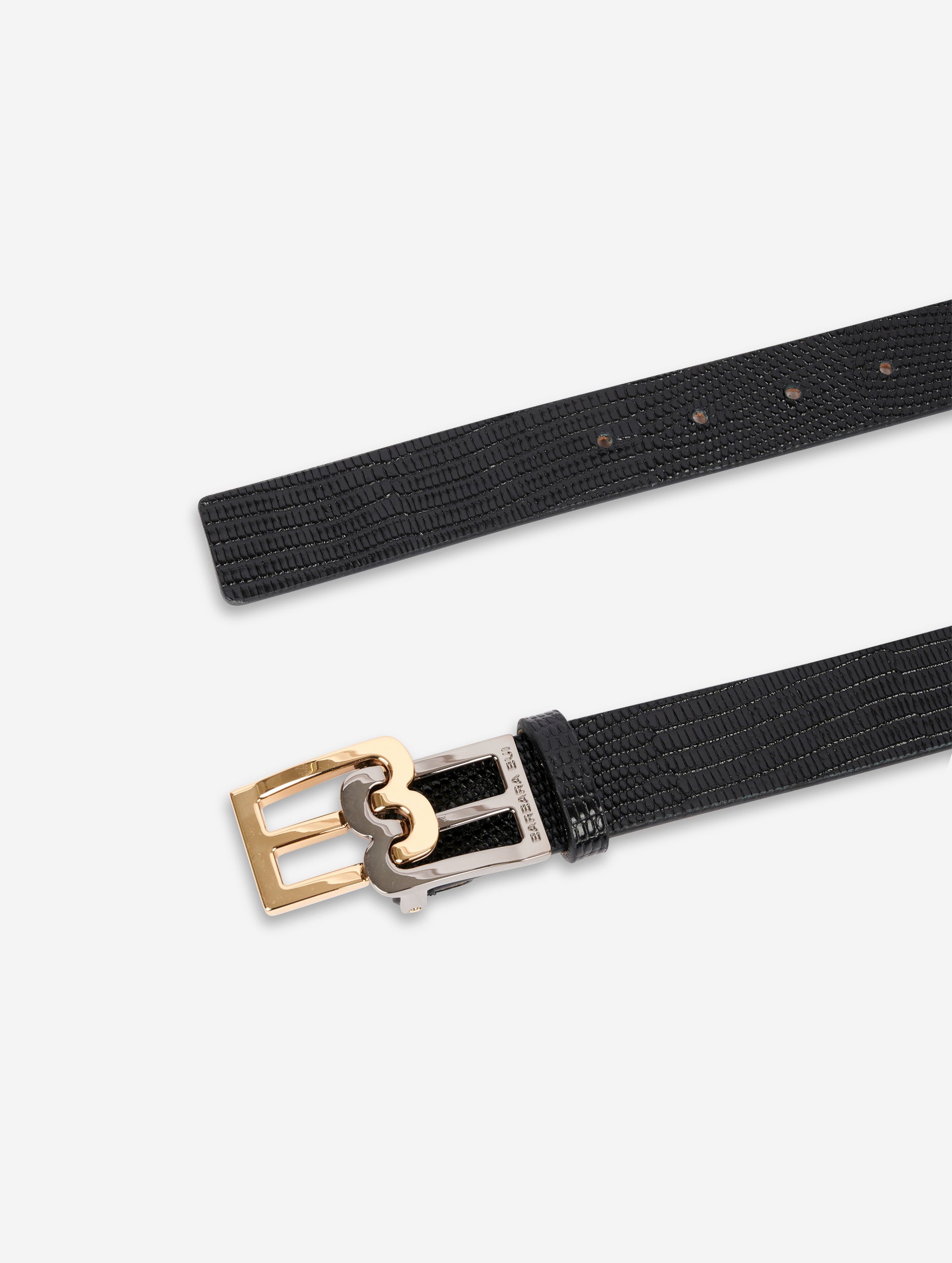 Black leather lizard-style belt. New Barbara Bui logo buckle, two-tone gold and silver finish. 5-hole adjustment.