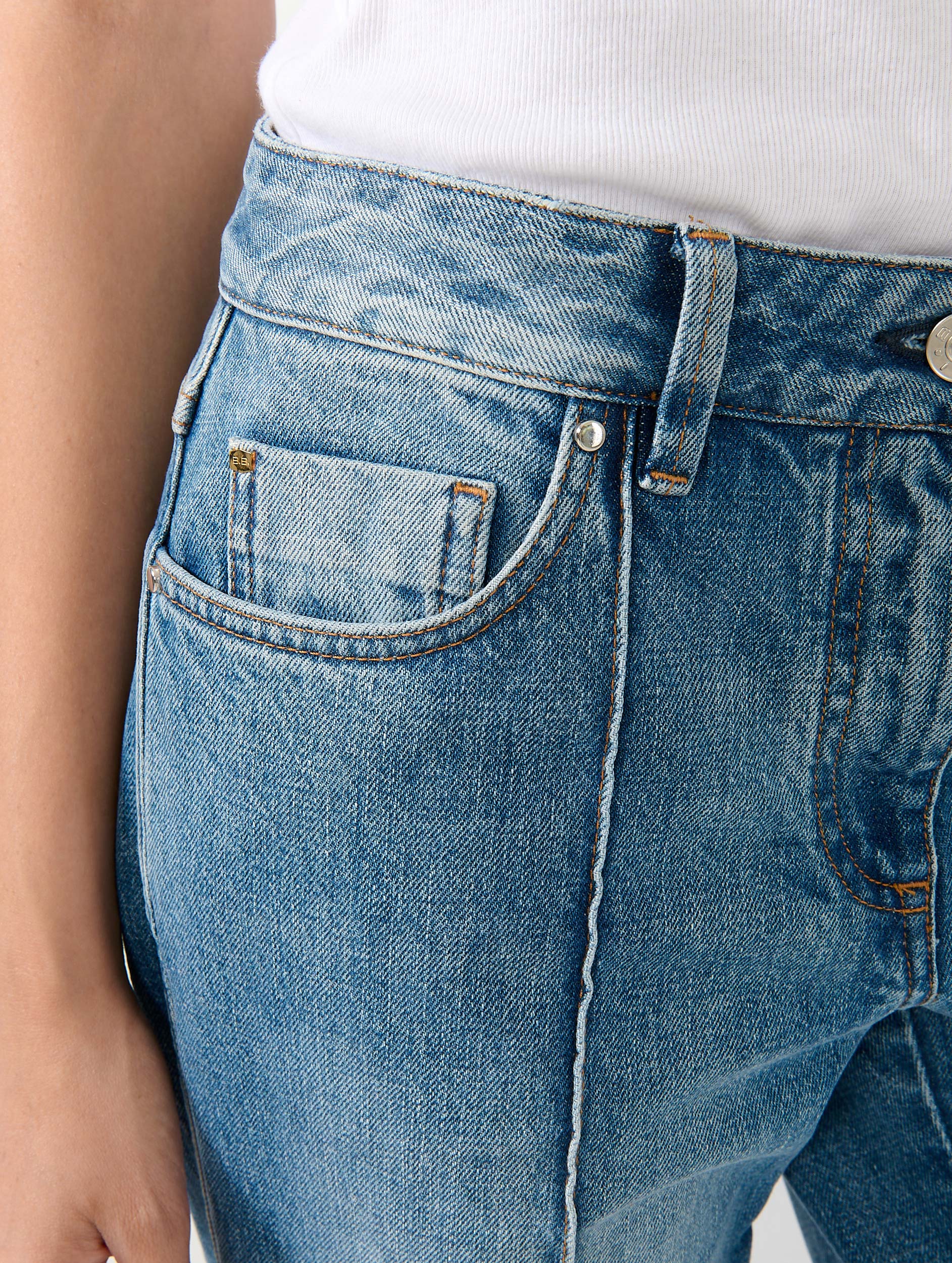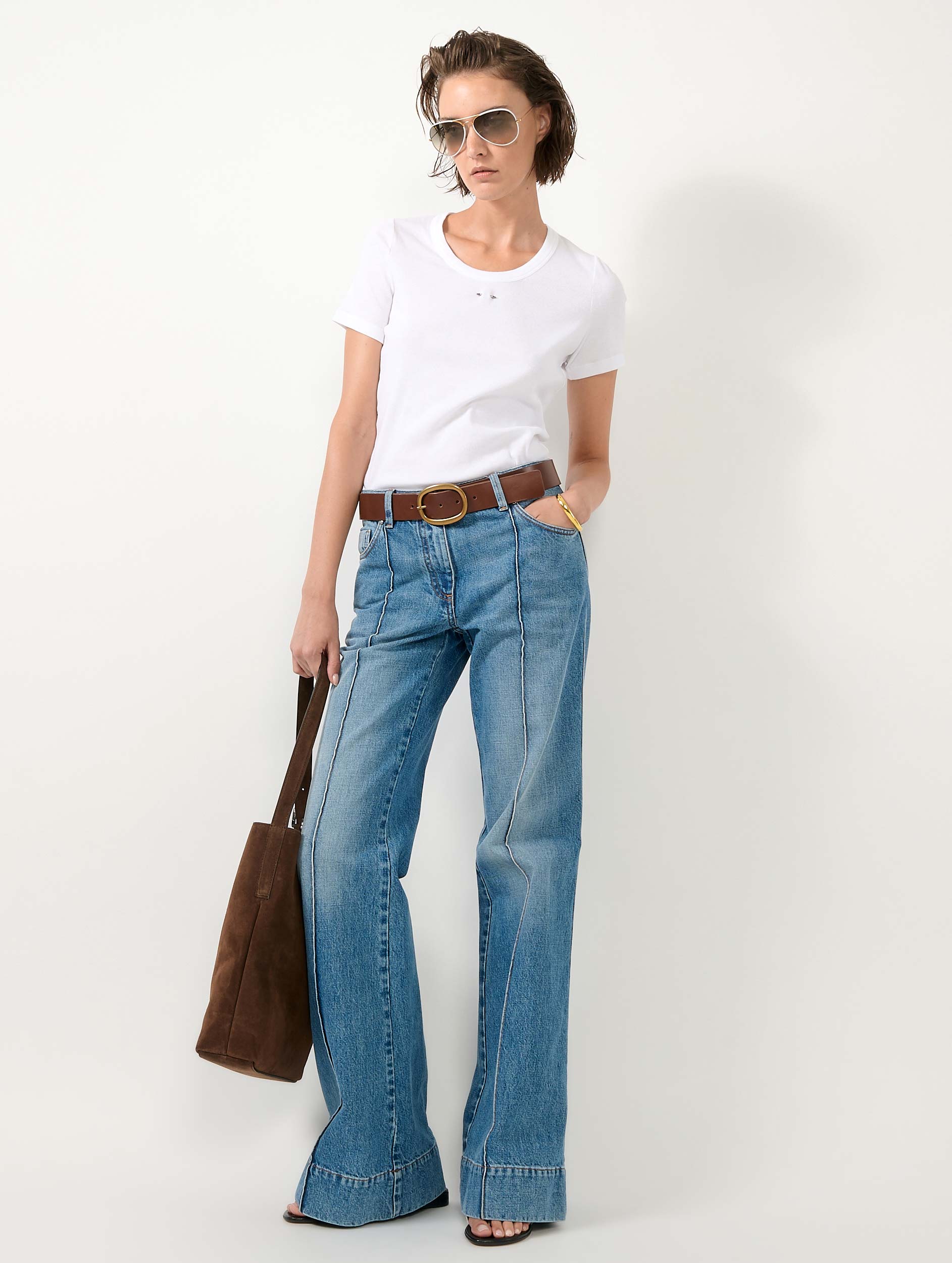 Instantly cool, flare jeans inspire a seventies note to an outfit that is both chic and relaxed. To highlight the elegance of these women's jeans with the perfect wash, a sewn crease runs along their dramatically flared leg. Worn with a simple white cotton T-shirt, a leather belt, and heeled sandals, these denim trousers accompany you in your daily life while flattering your silhouette. Their neat finishes, inspired by traditional signatures typical of denim, are all reworked with the elegance that characterizes the House's wardrobe, from the BB logo tab in fine gold-plated metal to the leather jacron with the Barbara Bui logo held by silver-tone metal rivets.