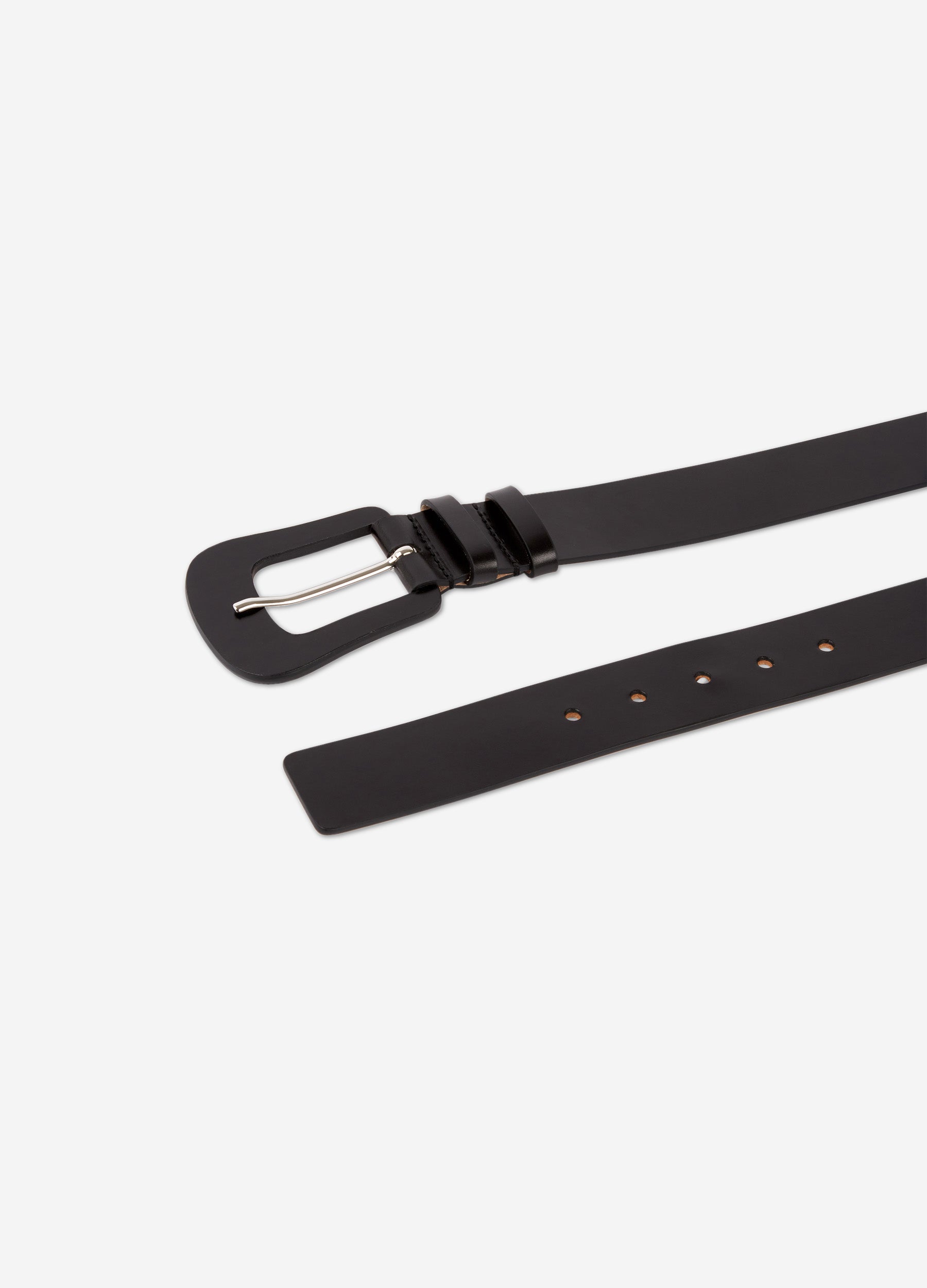 Black vegetable-tanned leather belt. Tone-on-tone cut out leather buckle. Width: 4 cm.