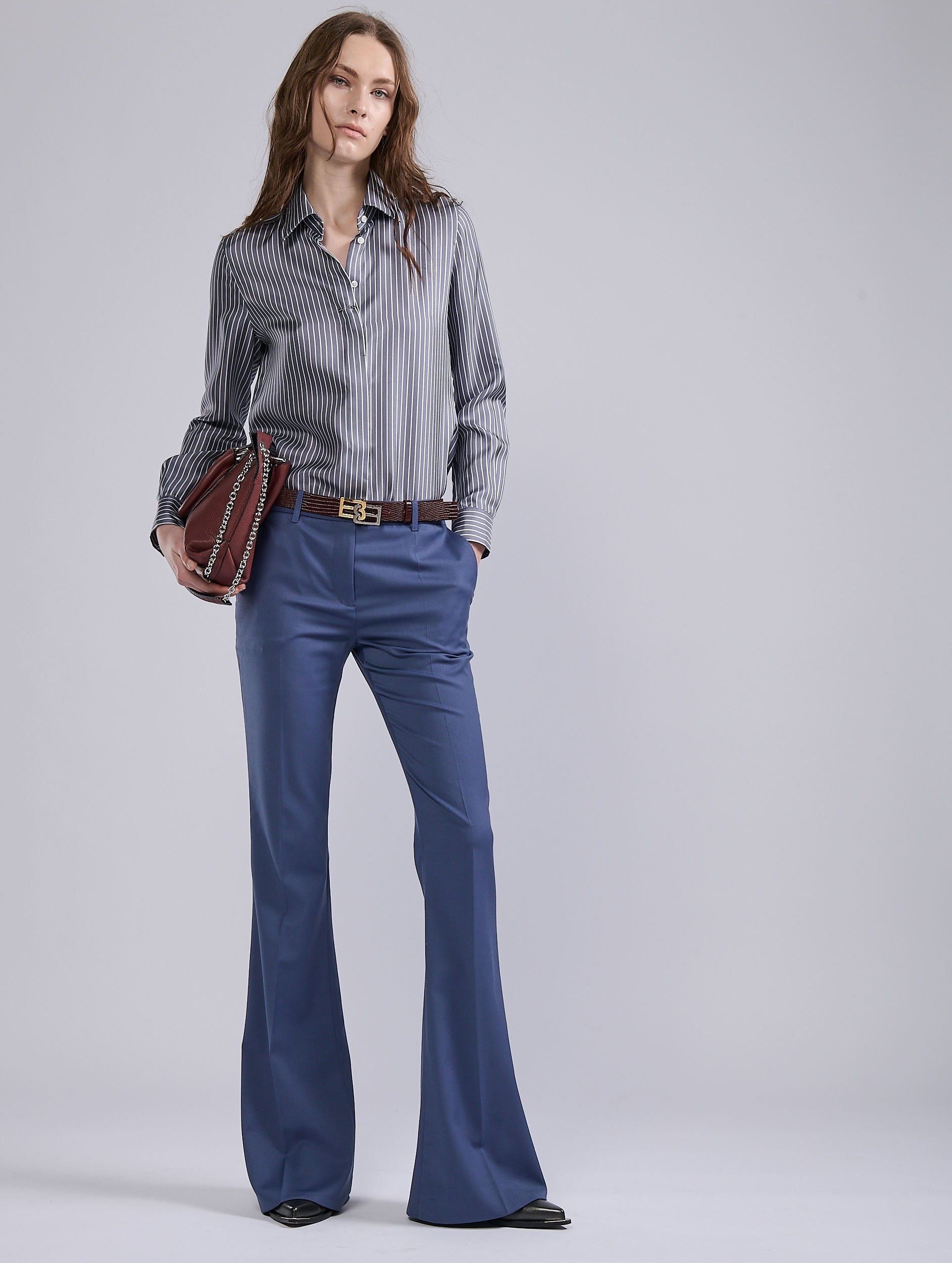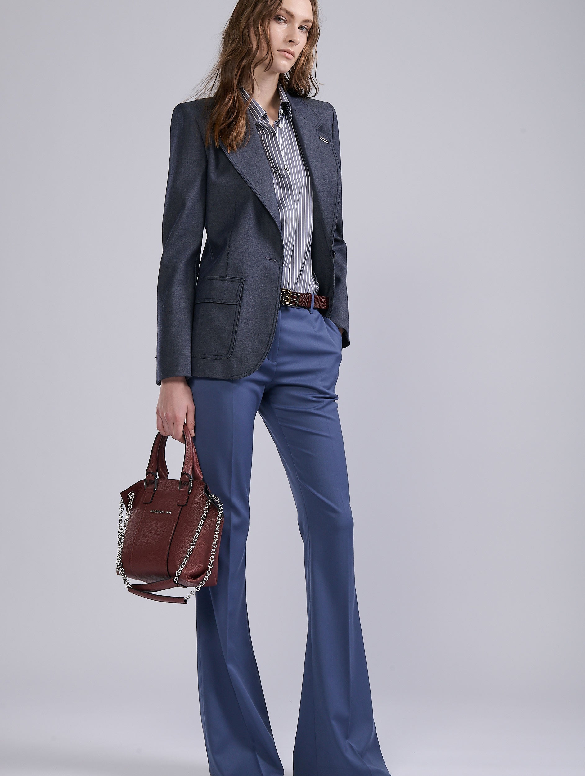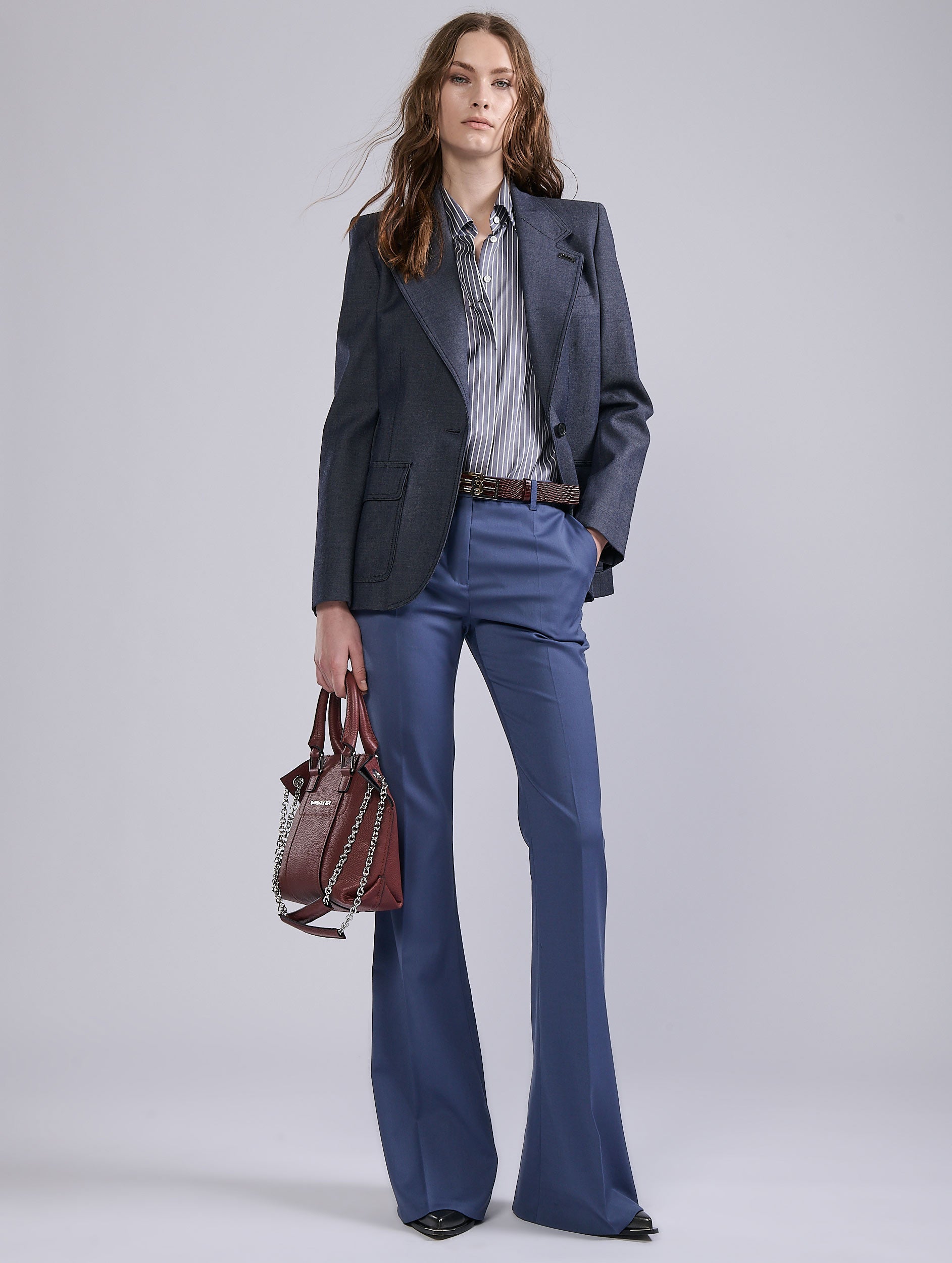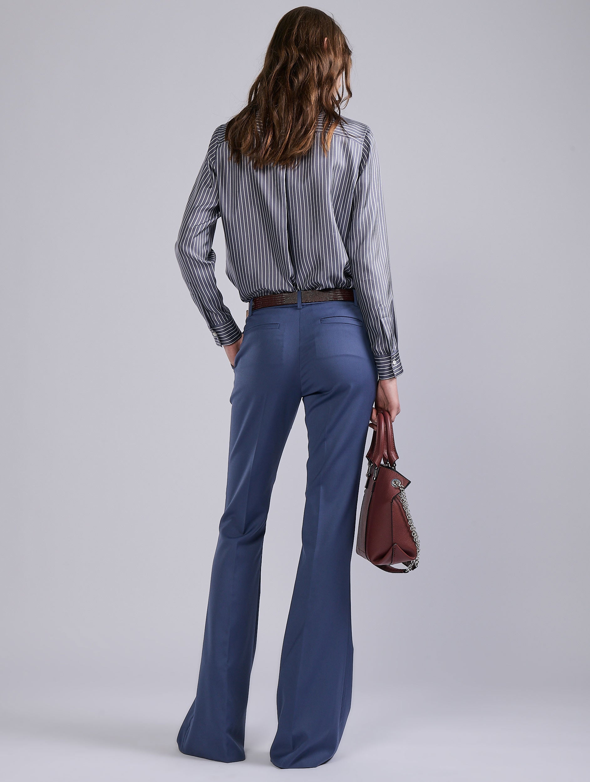 Bootleg pants are unrivalled for flattering the figure. This model hugs the thigh, then flares out radically: an ideal choice for a slim look, whether paired with pumps or ankle boots. Marked pleats along the leg and meticulous tailoring ensure the racy elegance of these minimalist women's pants. Available in a comfortable black or blue stretch wool gabardine, these bootleg pants, a Barbara Bui signature that oscillates between femininity and masculinity, define the look and complete the season's looks.