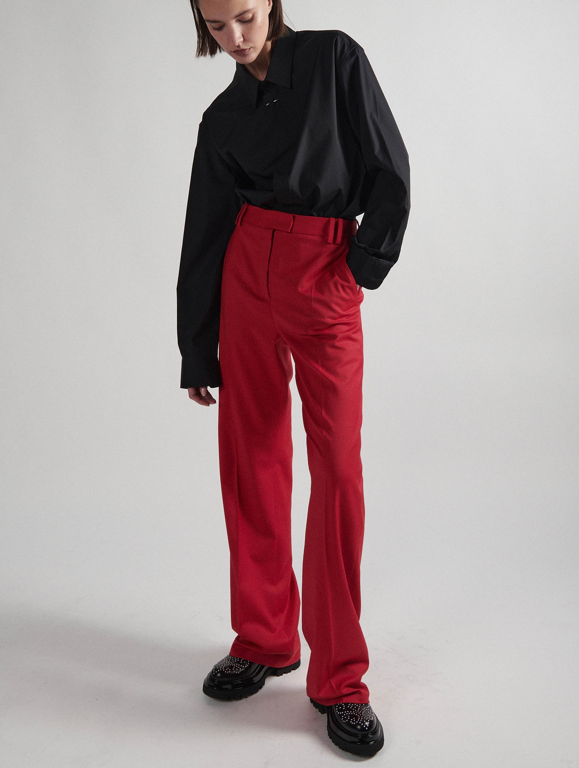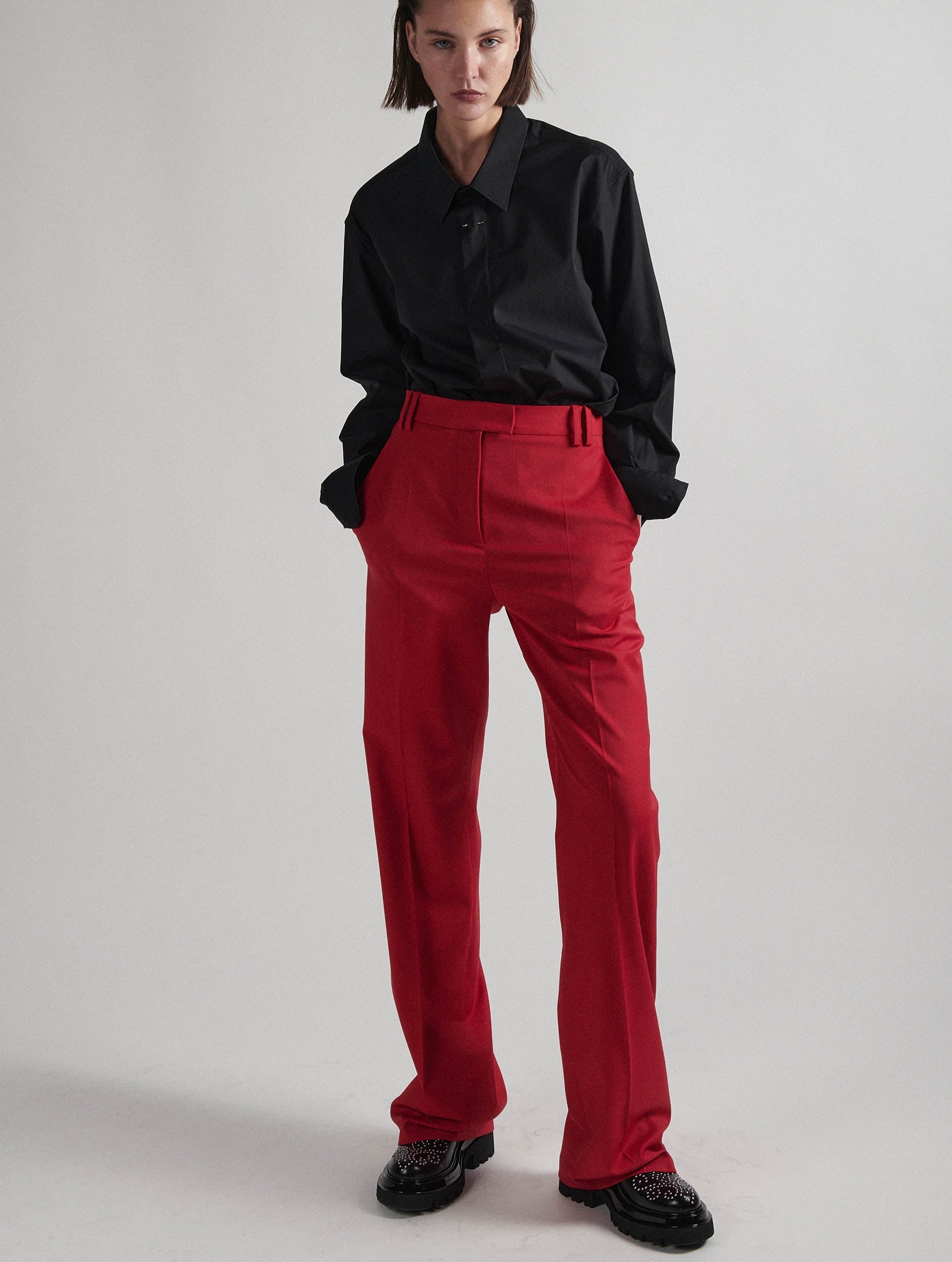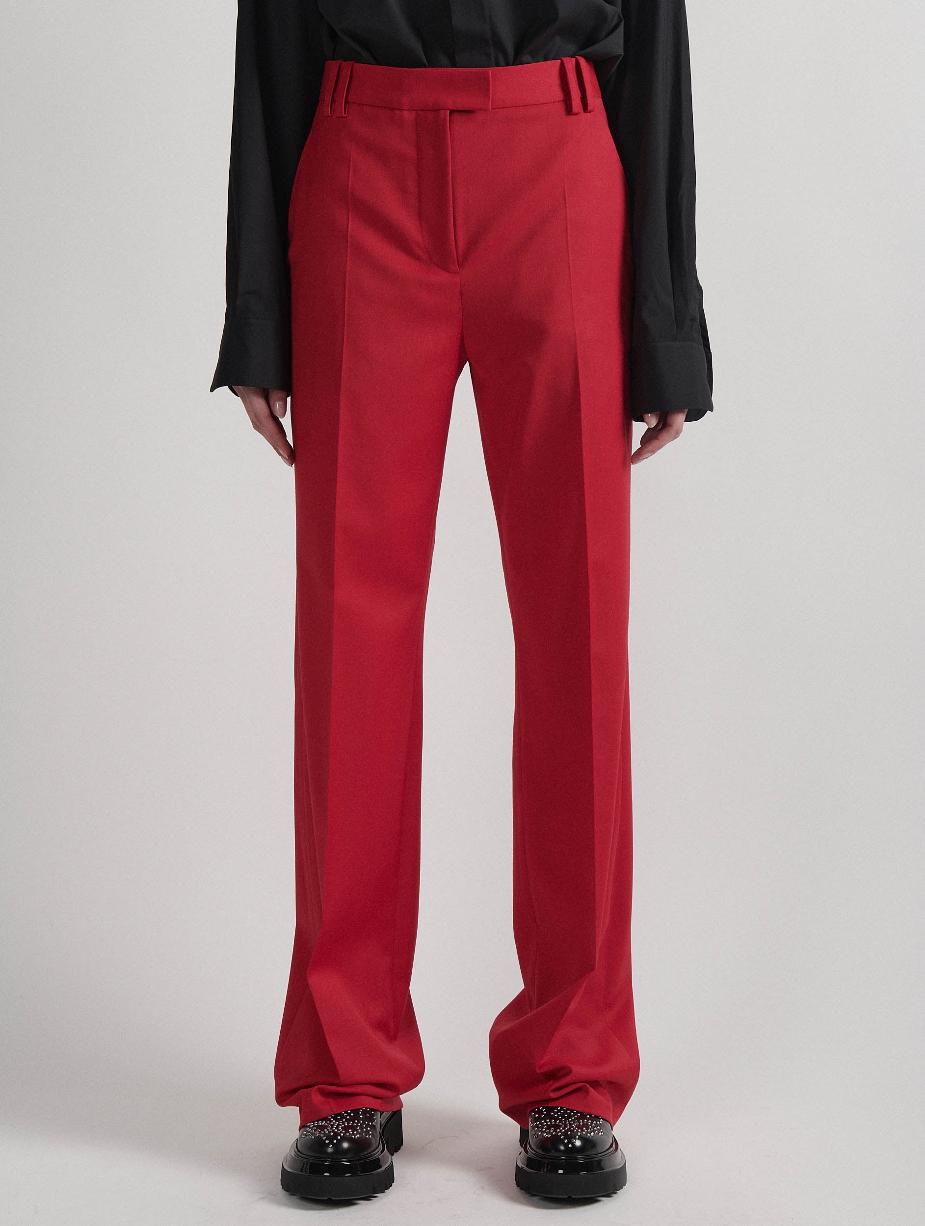 These women's suit pants in stretch wool gabardine promise a sculptural look and a slim silhouette. The high-waisted cut and wide, straight leg with pronounced crease elegantly slim the leg. Available in fiery red, these women's pants can be worn with a cotton poplin shirt or matching suit jacket. Hidden button placket, Italian pockets and piped back pockets testify to the care taken in finishing these BARBARA BUI COSTUMES pants.
