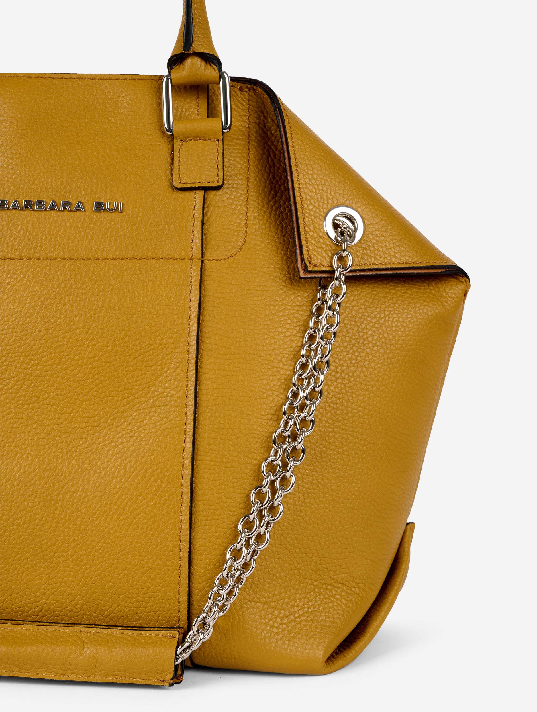 "CHAMALLOW" large tote bag in mustard grained calfskin with reversible effect lining. Articulated hand-carry handles and sliding chain shoulder strap for either short double-chain or long single-chain carrying. Inside patch pocket and central magnetic closure. Height: 33cm - Length: 44cm - Depth: 16cm.
