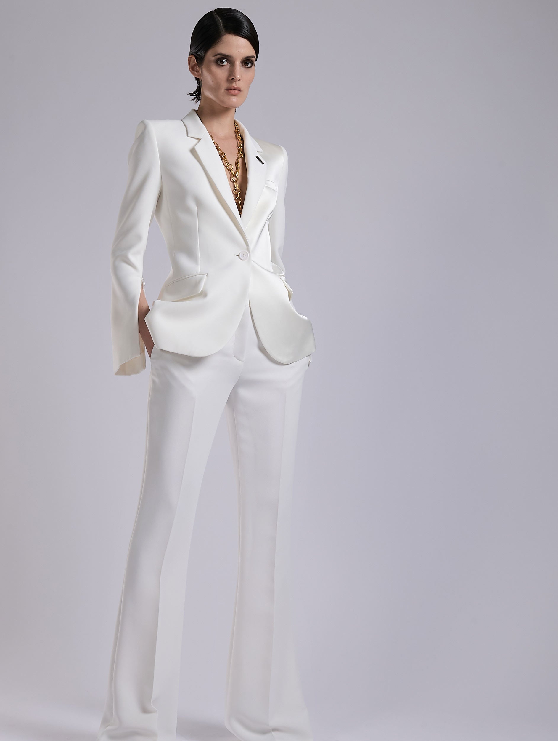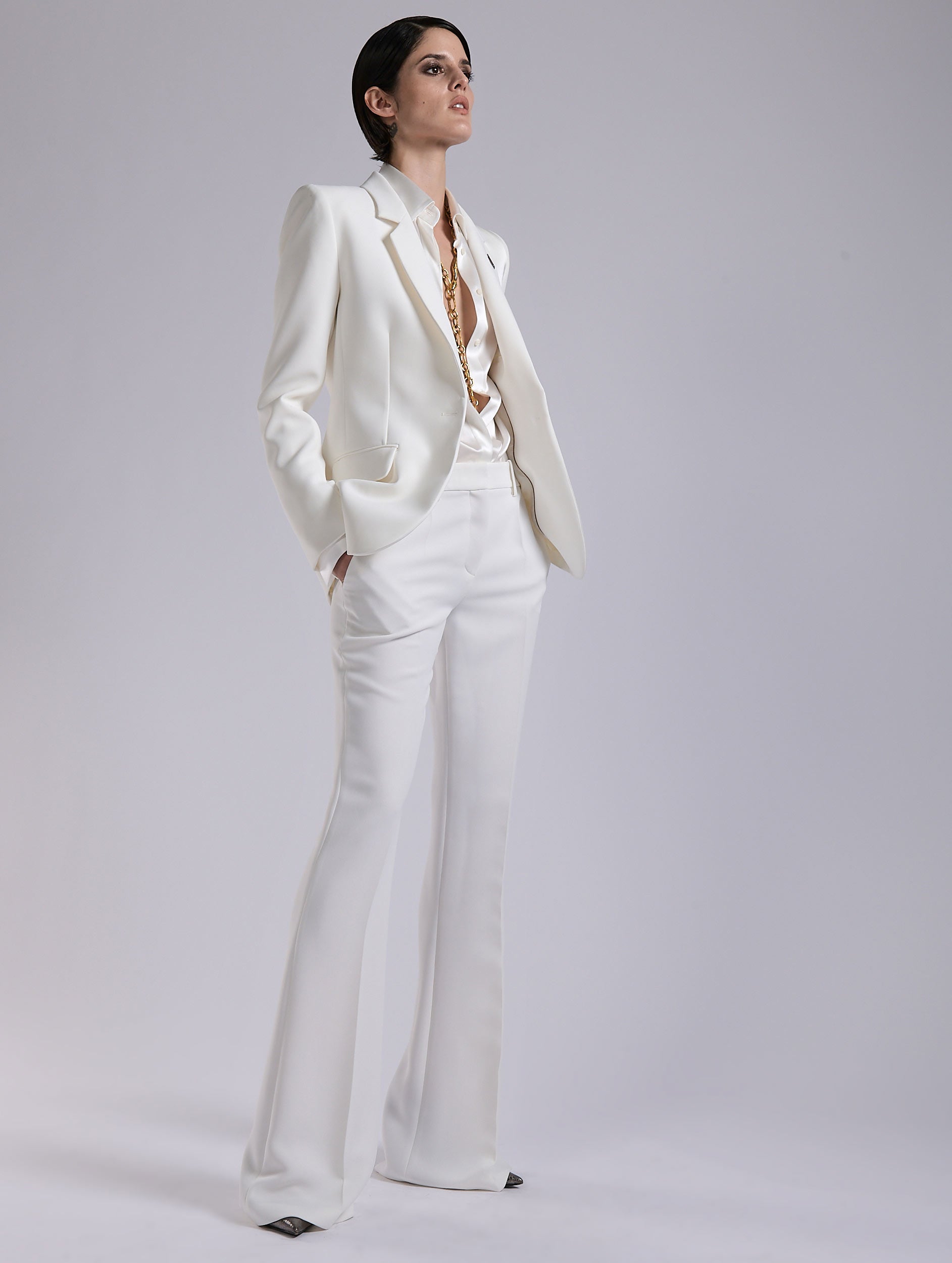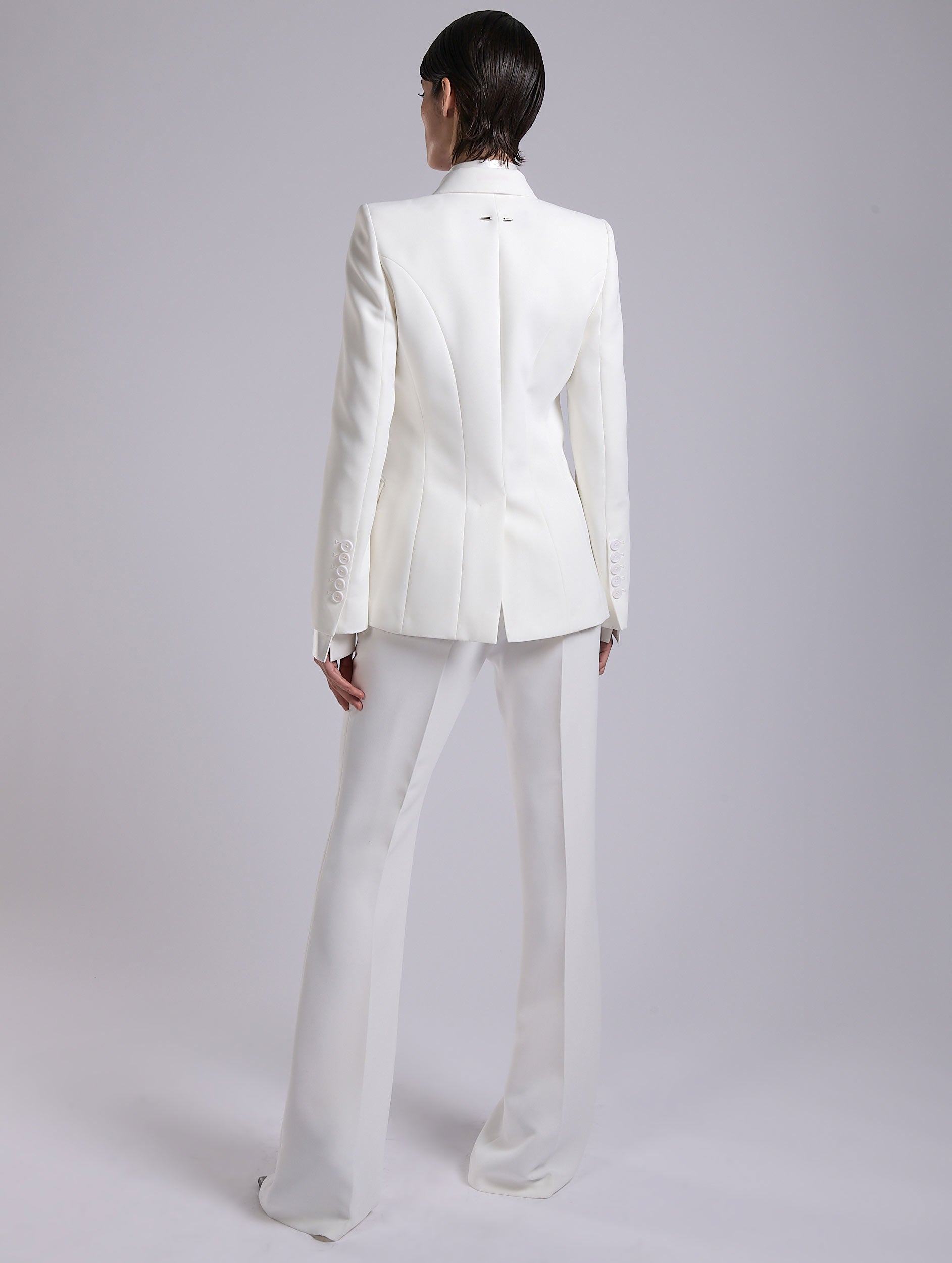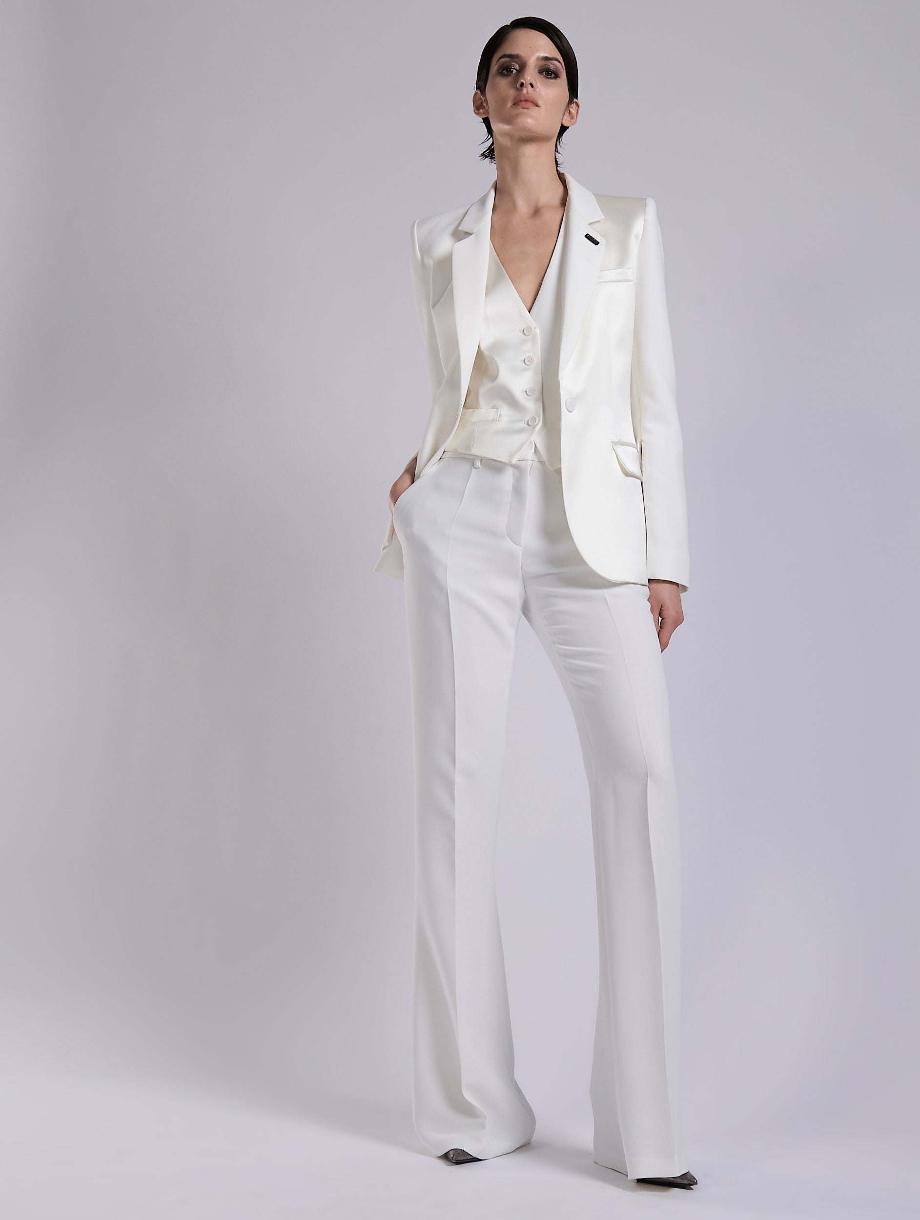 An ideal option for a ceremony, this ivory crepe women’s blazer revisits the tuxedo theme with a tone-on-tone satin panel. Its fitted cut defines the waist, allowing it to be worn next to the skin, over a satin shirt, or as part of a three-piece suit with the coordinating bootleg trousers. For a feminine and versatile look, the blazer features subtly zipped cuffs with buttonholes — an elegant detail that adds lightness to a dressy outfit. A Milanese slit at the back, adorned with a silver metal embellishment and matching back piercing, signs off this immaculate blazer with the rock touch dear to our Parisian house.