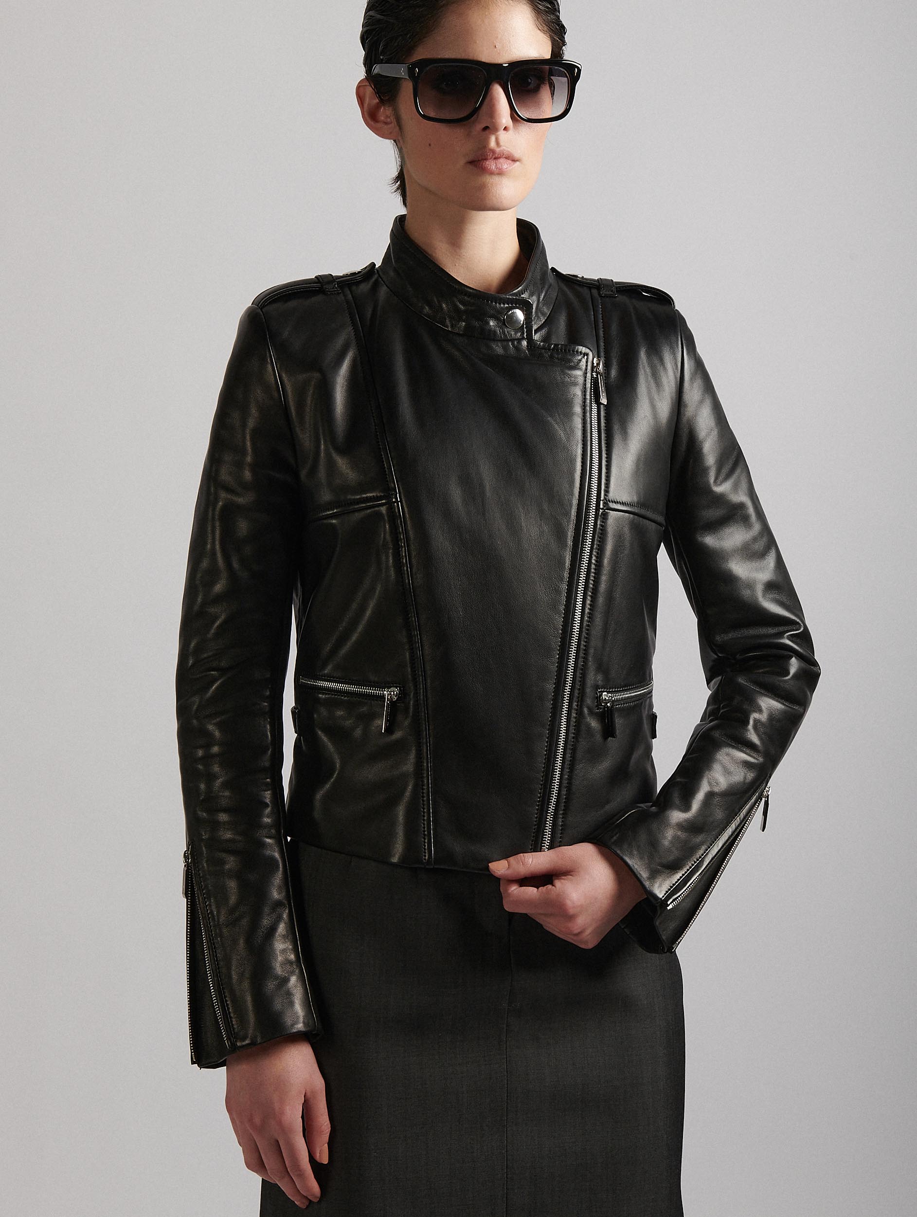 Cette saison signe le come-back des blousons de cuir dans nos collections. Barbara Bui revisite ici son iconique blouson en cuir d'agneau plongé noir. Des pattes d'épaules et un petit col motard fermé à l'aide d'un bouton pression siglé structurent la silhouette tandis que des pattes de serrage à boucles ardillon sur les côtés assurent un tombé parfait. Fermeture zippée et détails de zips aux poches côtés et poignets. Au dos, le piercing en métal amovible, signature de la Maison.