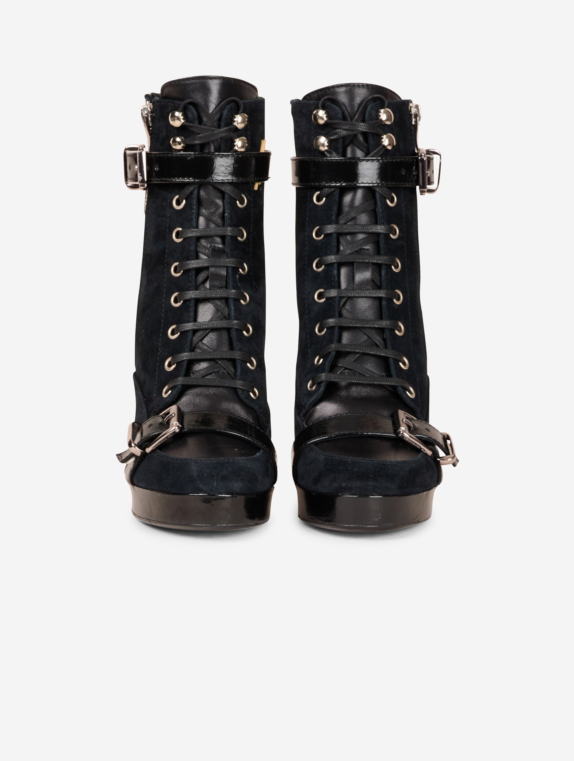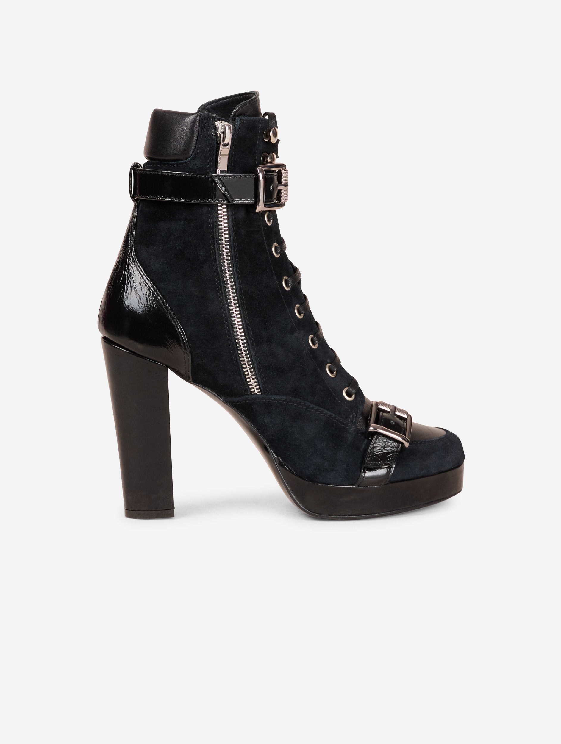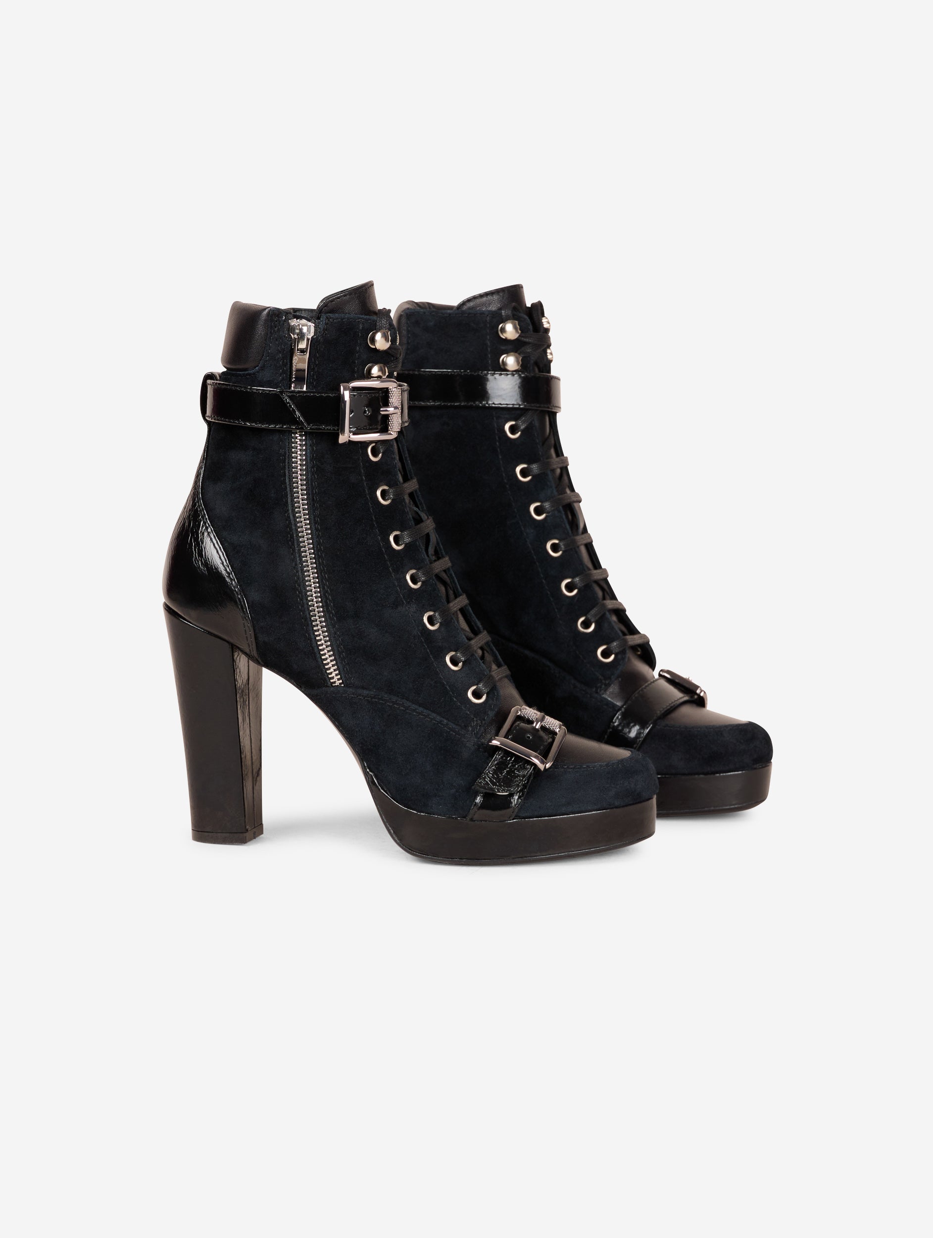 Bottines en veau velours noir, dessus et languette en cuir nappa ton sur ton. Renfort cheville et sangles à boucle métal en cuir verni naplak ton sur ton. Zip extérieur pour faciliter l'enfilage. Semelle à plateau de 2,5 cm et talon de 10,5 cm recouverts en cuir verni naplak ton sur ton.